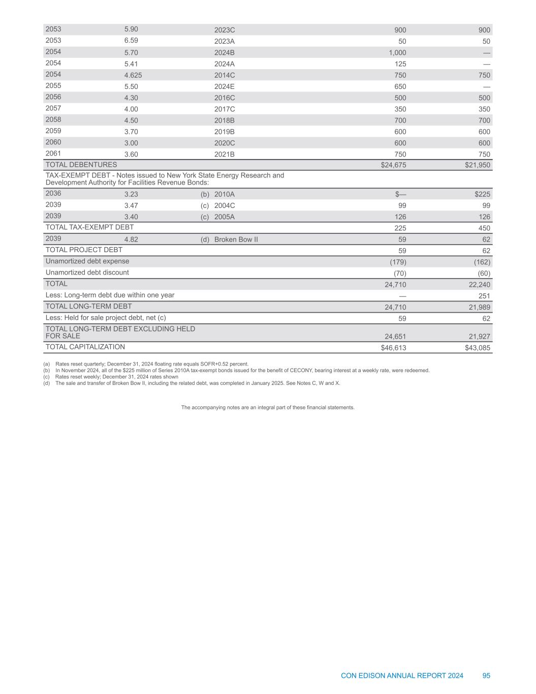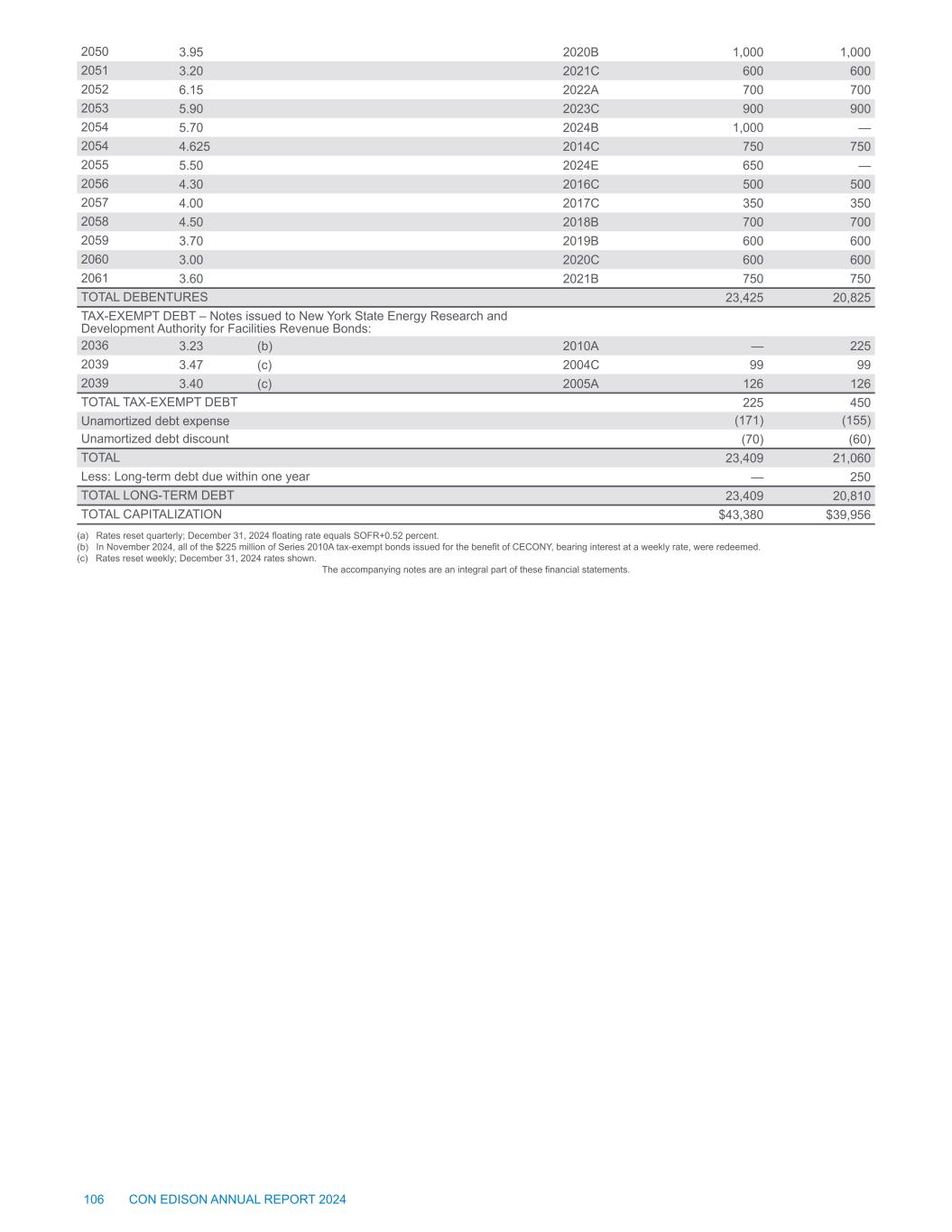 2050 3.95 2020B 1,000 1,000 2051 3.20 2021C 600 600 2052 6.15 2022A 700 700 2053 5.90 2023C 900 900 2054 5.70 2024B 1,000 — 2054 4.625 2014C 750 750 2055 5.50 2024E 650 — 2056 4.30 2016C 500 500 2057 4.00 2017C 350 350 2058 4.50 2018B 700 700 2059 3.70 2019B 600 600 2060 3.00 2020C 600 600 2061 3.60 2021B 750 750 TOTAL DEBENTURES 23,425 20,825 TAX-EXEMPT DEBT – Notes issued to New York State Energy Research and Development Authority for Facilities Revenue Bonds: 2036 3.23 (b) 2010A — 225 2039 3.47 (c) 2004C 99 99 2039 3.40 (c) 2005A 126 126 TOTAL TAX-EXEMPT DEBT 225 450 Unamortized debt expense (171) (155) Unamortized debt discount (70) (60) TOTAL 23,409 21,060 Less: Long-term debt due within one year — 250 TOTAL LONG-TERM DEBT 23,409 20,810 TOTAL CAPITALIZATION $43,380 $39,956 (a) Rates reset quarterly; December 31, 2024 floating rate equals SOFR+0.52 percent. (b) In November 2024, all of the $225 million of Series 2010A tax-exempt bonds issued for the benefit of CECONY, bearing interest at a weekly rate, were redeemed. (c) Rates reset weekly; December 31, 2024 rates shown. The accompanying notes are an integral part of these financial statements. 106 CON EDISON ANNUAL REPORT 2024