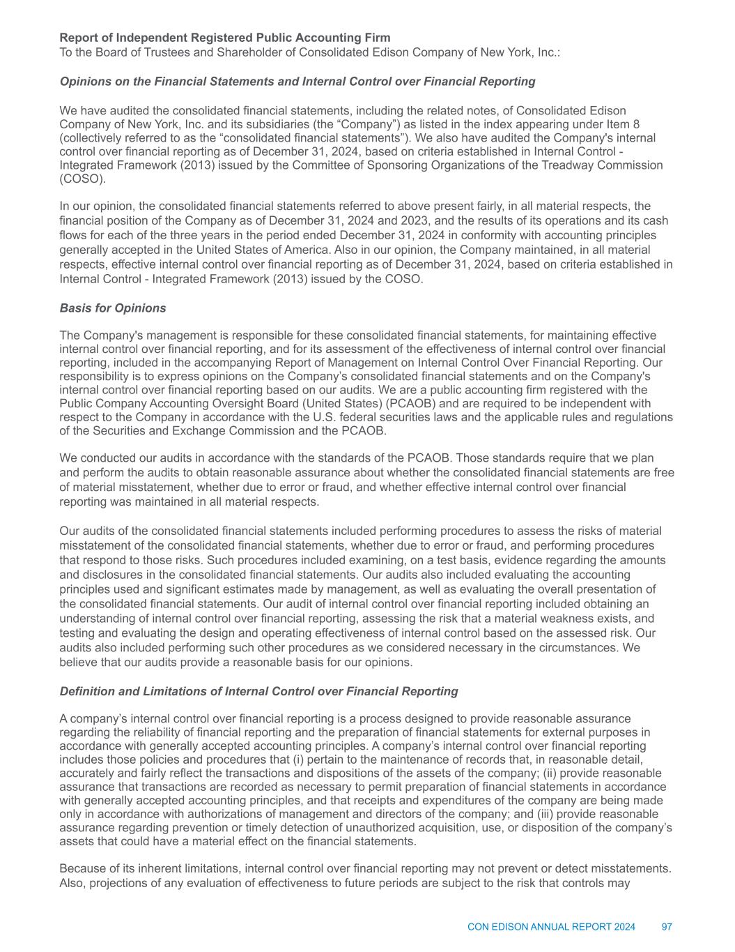 Report of Independent Registered Public Accounting Firm To the Board of Trustees and Shareholder of Consolidated Edison Company of New York, Inc.: Opinions on the Financial Statements and Internal Control over Financial Reporting We have audited the consolidated financial statements, including the related notes, of Consolidated Edison Company of New York, Inc. and its subsidiaries (the “Company”) as listed in the index appearing under Item 8 (collectively referred to as the “consolidated financial statements”). We also have audited the Company's internal control over financial reporting as of December 31, 2024, based on criteria established in Internal Control - Integrated Framework (2013) issued by the Committee of Sponsoring Organizations of the Treadway Commission (COSO). In our opinion, the consolidated financial statements referred to above present fairly, in all material respects, the financial position of the Company as of December 31, 2024 and 2023, and the results of its operations and its cash flows for each of the three years in the period ended December 31, 2024 in conformity with accounting principles generally accepted in the United States of America. Also in our opinion, the Company maintained, in all material respects, effective internal control over financial reporting as of December 31, 2024, based on criteria established in Internal Control - Integrated Framework (2013) issued by the COSO. Basis for Opinions The Company's management is responsible for these consolidated financial statements, for maintaining effective internal control over financial reporting, and for its assessment of the effectiveness of internal control over financial reporting, included in the accompanying Report of Management on Internal Control Over Financial Reporting. Our responsibility is to express opinions on the Company’s consolidated financial statements and on the Company's internal control over financial reporting based on our audits. We are a public accounting firm registered with the Public Company Accounting Oversight Board (United States) (PCAOB) and are required to be independent with respect to the Company in accordance with the U.S. federal securities laws and the applicable rules and regulations of the Securities and Exchange Commission and the PCAOB. We conducted our audits in accordance with the standards of the PCAOB. Those standards require that we plan and perform the audits to obtain reasonable assurance about whether the consolidated financial statements are free of material misstatement, whether due to error or fraud, and whether effective internal control over financial reporting was maintained in all material respects. Our audits of the consolidated financial statements included performing procedures to assess the risks of material misstatement of the consolidated financial statements, whether due to error or fraud, and performing procedures that respond to those risks. Such procedures included examining, on a test basis, evidence regarding the amounts and disclosures in the consolidated financial statements. Our audits also included evaluating the accounting principles used and significant estimates made by management, as well as evaluating the overall presentation of the consolidated financial statements. Our audit of internal control over financial reporting included obtaining an understanding of internal control over financial reporting, assessing the risk that a material weakness exists, and testing and evaluating the design and operating effectiveness of internal control based on the assessed risk. Our audits also included performing such other procedures as we considered necessary in the circumstances. We believe that our audits provide a reasonable basis for our opinions. Definition and Limitations of Internal Control over Financial Reporting A company’s internal control over financial reporting is a process designed to provide reasonable assurance regarding the reliability of financial reporting and the preparation of financial statements for external purposes in accordance with generally accepted accounting principles. A company’s internal control over financial reporting includes those policies and procedures that (i) pertain to the maintenance of records that, in reasonable detail, accurately and fairly reflect the transactions and dispositions of the assets of the company; (ii) provide reasonable assurance that transactions are recorded as necessary to permit preparation of financial statements in accordance with generally accepted accounting principles, and that receipts and expenditures of the company are being made only in accordance with authorizations of management and directors of the company; and (iii) provide reasonable assurance regarding prevention or timely detection of unauthorized acquisition, use, or disposition of the company’s assets that could have a material effect on the financial statements. Because of its inherent limitations, internal control over financial reporting may not prevent or detect misstatements. Also, projections of any evaluation of effectiveness to future periods are subject to the risk that controls may CON EDISON ANNUAL REPORT 2024 97