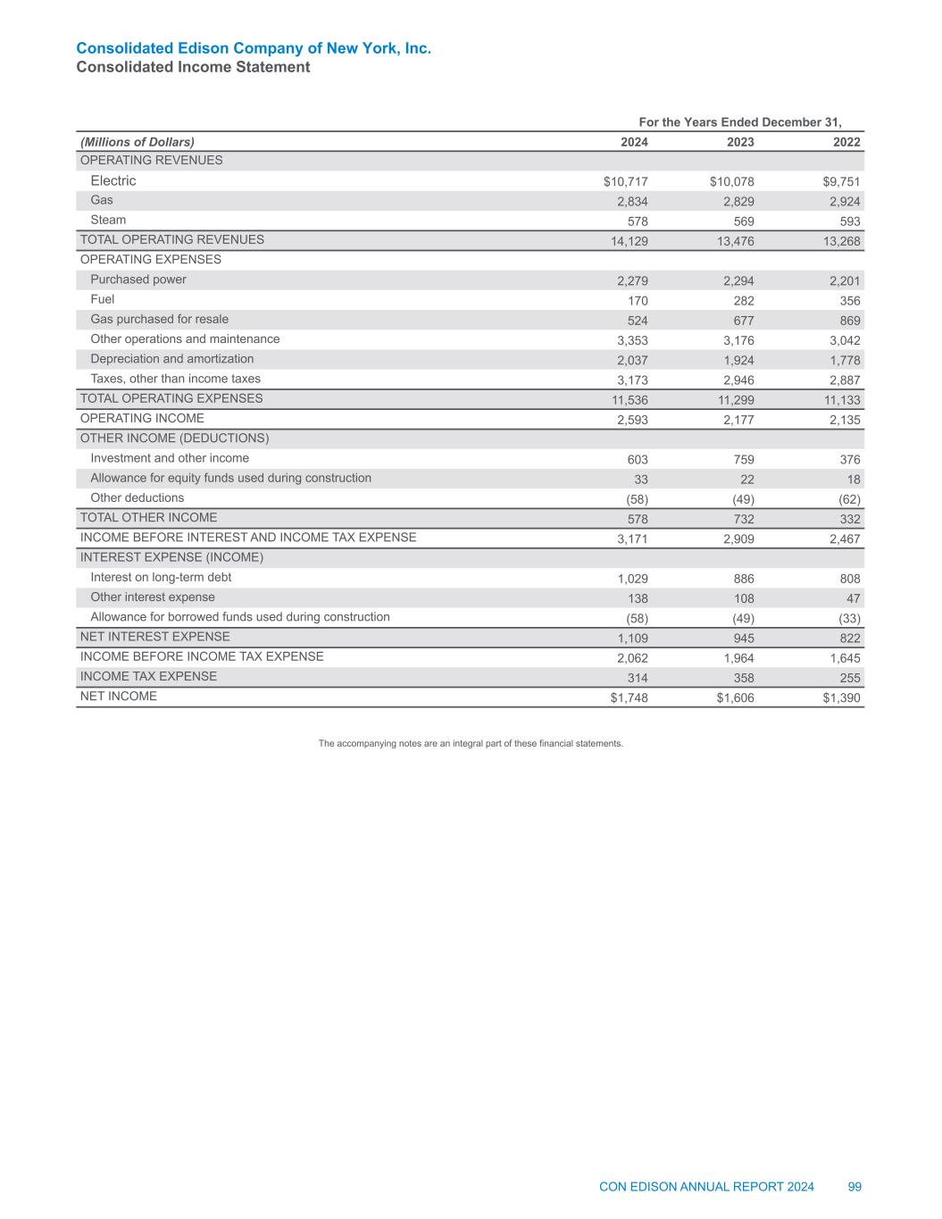 Consolidated Edison Company of New York, Inc. Consolidated Income Statement For the Years Ended December 31, (Millions of Dollars) 2024 2023 2022 OPERATING REVENUES Electric $10,717 $10,078 $9,751 Gas 2,834 2,829 2,924 Steam 578 569 593 TOTAL OPERATING REVENUES 14,129 13,476 13,268 OPERATING EXPENSES Purchased power 2,279 2,294 2,201 Fuel 170 282 356 Gas purchased for resale 524 677 869 Other operations and maintenance 3,353 3,176 3,042 Depreciation and amortization 2,037 1,924 1,778 Taxes, other than income taxes 3,173 2,946 2,887 TOTAL OPERATING EXPENSES 11,536 11,299 11,133 OPERATING INCOME 2,593 2,177 2,135 OTHER INCOME (DEDUCTIONS) Investment and other income 603 759 376 Allowance for equity funds used during construction 33 22 18 Other deductions (58) (49) (62) TOTAL OTHER INCOME 578 732 332 INCOME BEFORE INTEREST AND INCOME TAX EXPENSE 3,171 2,909 2,467 INTEREST EXPENSE (INCOME) Interest on long-term debt 1,029 886 808 Other interest expense 138 108 47 Allowance for borrowed funds used during construction (58) (49) (33) NET INTEREST EXPENSE 1,109 945 822 INCOME BEFORE INCOME TAX EXPENSE 2,062 1,964 1,645 INCOME TAX EXPENSE 314 358 255 NET INCOME $1,748 $1,606 $1,390 The accompanying notes are an integral part of these financial statements. CON EDISON ANNUAL REPORT 2024 99