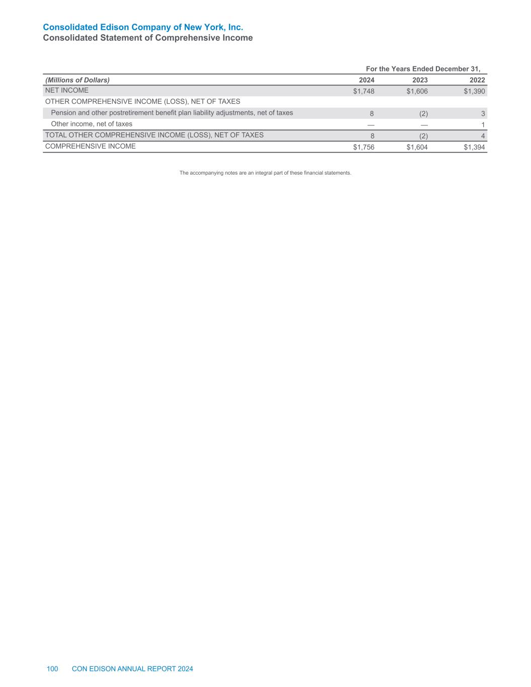 Consolidated Edison Company of New York, Inc. Consolidated Statement of Comprehensive Income For the Years Ended December 31, (Millions of Dollars) 2024 2023 2022 NET INCOME $1,748 $1,606 $1,390 OTHER COMPREHENSIVE INCOME (LOSS), NET OF TAXES Pension and other postretirement benefit plan liability adjustments, net of taxes 8 (2) 3 Other income, net of taxes — — 1 TOTAL OTHER COMPREHENSIVE INCOME (LOSS), NET OF TAXES 8 (2) 4 COMPREHENSIVE INCOME $1,756 $1,604 $1,394 The accompanying notes are an integral part of these financial statements. 100 CON EDISON ANNUAL REPORT 2024