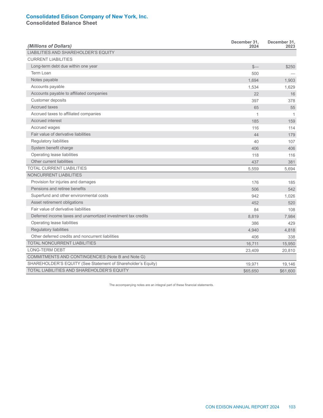 Consolidated Edison Company of New York, Inc. Consolidated Balance Sheet (Millions of Dollars) December 31, 2024 December 31, 2023 LIABILITIES AND SHAREHOLDER’S EQUITY CURRENT LIABILITIES Long-term debt due within one year $— $250 Term Loan 500 — Notes payable 1,694 1,903 Accounts payable 1,534 1,629 Accounts payable to affiliated companies 22 16 Customer deposits 397 378 Accrued taxes 65 55 Accrued taxes to affiliated companies 1 1 Accrued interest 185 159 Accrued wages 116 114 Fair value of derivative liabilities 44 179 Regulatory liabilities 40 107 System benefit charge 406 406 Operating lease liabilities 118 116 Other current liabilities 437 381 TOTAL CURRENT LIABILITIES 5,559 5,694 NONCURRENT LIABILITIES Provision for injuries and damages 176 185 Pensions and retiree benefits 506 542 Superfund and other environmental costs 942 1,026 Asset retirement obligations 452 520 Fair value of derivative liabilities 84 108 Deferred income taxes and unamortized investment tax credits 8,819 7,984 Operating lease liabilities 386 429 Regulatory liabilities 4,940 4,818 Other deferred credits and noncurrent liabilities 406 338 TOTAL NONCURRENT LIABILITIES 16,711 15,950 LONG-TERM DEBT 23,409 20,810 COMMITMENTS AND CONTINGENCIES (Note B and Note G) SHAREHOLDER’S EQUITY (See Statement of Shareholder’s Equity) 19,971 19,146 TOTAL LIABILITIES AND SHAREHOLDER’S EQUITY $65,650 $61,600 The accompanying notes are an integral part of these financial statements. CON EDISON ANNUAL REPORT 2024 103