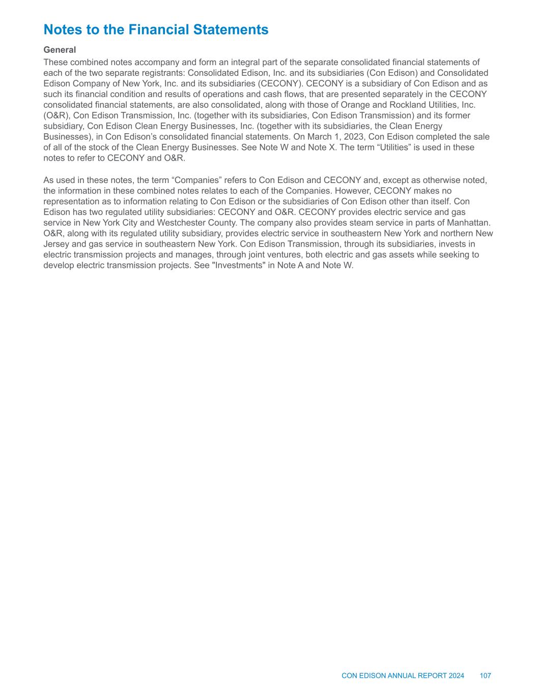 Notes to the Financial Statements General These combined notes accompany and form an integral part of the separate consolidated financial statements of each of the two separate registrants: Consolidated Edison, Inc. and its subsidiaries (Con Edison) and Consolidated Edison Company of New York, Inc. and its subsidiaries (CECONY). CECONY is a subsidiary of Con Edison and as such its financial condition and results of operations and cash flows, that are presented separately in the CECONY consolidated financial statements, are also consolidated, along with those of Orange and Rockland Utilities, Inc. (O&R), Con Edison Transmission, Inc. (together with its subsidiaries, Con Edison Transmission) and its former subsidiary, Con Edison Clean Energy Businesses, Inc. (together with its subsidiaries, the Clean Energy Businesses), in Con Edison’s consolidated financial statements. On March 1, 2023, Con Edison completed the sale of all of the stock of the Clean Energy Businesses. See Note W and Note X. The term “Utilities” is used in these notes to refer to CECONY and O&R. As used in these notes, the term “Companies” refers to Con Edison and CECONY and, except as otherwise noted, the information in these combined notes relates to each of the Companies. However, CECONY makes no representation as to information relating to Con Edison or the subsidiaries of Con Edison other than itself. Con Edison has two regulated utility subsidiaries: CECONY and O&R. CECONY provides electric service and gas service in New York City and Westchester County. The company also provides steam service in parts of Manhattan. O&R, along with its regulated utility subsidiary, provides electric service in southeastern New York and northern New Jersey and gas service in southeastern New York. Con Edison Transmission, through its subsidiaries, invests in electric transmission projects and manages, through joint ventures, both electric and gas assets while seeking to develop electric transmission projects. See "Investments" in Note A and Note W. CON EDISON ANNUAL REPORT 2024 107