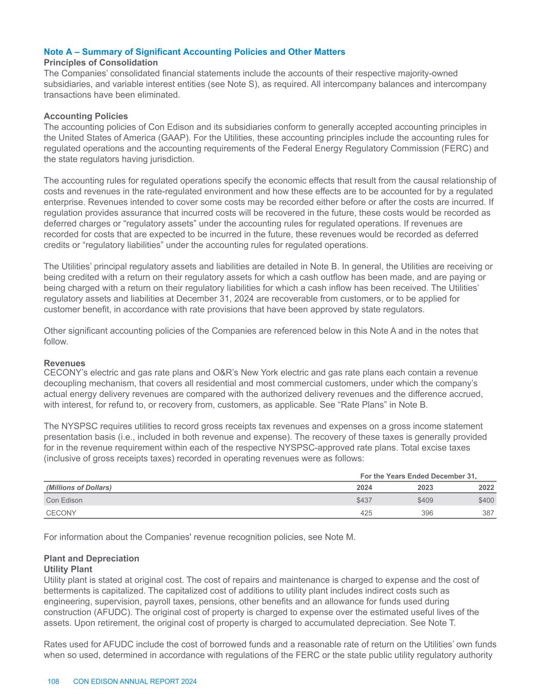 Note A – Summary of Significant Accounting Policies and Other Matters Principles of Consolidation The Companies’ consolidated financial statements include the accounts of their respective majority-owned subsidiaries, and variable interest entities (see Note S), as required. All intercompany balances and intercompany transactions have been eliminated. Accounting Policies The accounting policies of Con Edison and its subsidiaries conform to generally accepted accounting principles in the United States of America (GAAP). For the Utilities, these accounting principles include the accounting rules for regulated operations and the accounting requirements of the Federal Energy Regulatory Commission (FERC) and the state regulators having jurisdiction. The accounting rules for regulated operations specify the economic effects that result from the causal relationship of costs and revenues in the rate-regulated environment and how these effects are to be accounted for by a regulated enterprise. Revenues intended to cover some costs may be recorded either before or after the costs are incurred. If regulation provides assurance that incurred costs will be recovered in the future, these costs would be recorded as deferred charges or “regulatory assets” under the accounting rules for regulated operations. If revenues are recorded for costs that are expected to be incurred in the future, these revenues would be recorded as deferred credits or “regulatory liabilities” under the accounting rules for regulated operations. The Utilities’ principal regulatory assets and liabilities are detailed in Note B. In general, the Utilities are receiving or being credited with a return on their regulatory assets for which a cash outflow has been made, and are paying or being charged with a return on their regulatory liabilities for which a cash inflow has been received. The Utilities’ regulatory assets and liabilities at December 31, 2024 are recoverable from customers, or to be applied for customer benefit, in accordance with rate provisions that have been approved by state regulators. Other significant accounting policies of the Companies are referenced below in this Note A and in the notes that follow. Revenues CECONY’s electric and gas rate plans and O&R’s New York electric and gas rate plans each contain a revenue decoupling mechanism, that covers all residential and most commercial customers, under which the company’s actual energy delivery revenues are compared with the authorized delivery revenues and the difference accrued, with interest, for refund to, or recovery from, customers, as applicable. See “Rate Plans” in Note B. The NYSPSC requires utilities to record gross receipts tax revenues and expenses on a gross income statement presentation basis (i.e., included in both revenue and expense). The recovery of these taxes is generally provided for in the revenue requirement within each of the respective NYSPSC-approved rate plans. Total excise taxes (inclusive of gross receipts taxes) recorded in operating revenues were as follows: For the Years Ended December 31, (Millions of Dollars) 2024 2023 2022 Con Edison $437 $409 $400 CECONY 425 396 387 For information about the Companies' revenue recognition policies, see Note M. Plant and Depreciation Utility Plant Utility plant is stated at original cost. The cost of repairs and maintenance is charged to expense and the cost of betterments is capitalized. The capitalized cost of additions to utility plant includes indirect costs such as engineering, supervision, payroll taxes, pensions, other benefits and an allowance for funds used during construction (AFUDC). The original cost of property is charged to expense over the estimated useful lives of the assets. Upon retirement, the original cost of property is charged to accumulated depreciation. See Note T. Rates used for AFUDC include the cost of borrowed funds and a reasonable rate of return on the Utilities’ own funds when so used, determined in accordance with regulations of the FERC or the state public utility regulatory authority 108 CON EDISON ANNUAL REPORT 2024