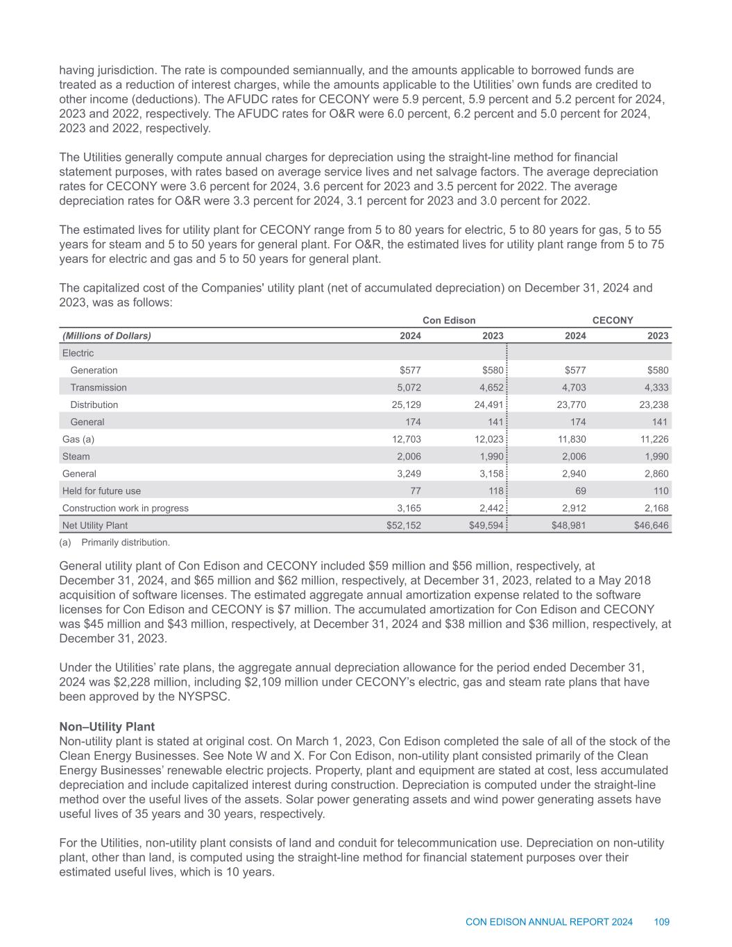 having jurisdiction. The rate is compounded semiannually, and the amounts applicable to borrowed funds are treated as a reduction of interest charges, while the amounts applicable to the Utilities’ own funds are credited to other income (deductions). The AFUDC rates for CECONY were 5.9 percent, 5.9 percent and 5.2 percent for 2024, 2023 and 2022, respectively. The AFUDC rates for O&R were 6.0 percent, 6.2 percent and 5.0 percent for 2024, 2023 and 2022, respectively. The Utilities generally compute annual charges for depreciation using the straight-line method for financial statement purposes, with rates based on average service lives and net salvage factors. The average depreciation rates for CECONY were 3.6 percent for 2024, 3.6 percent for 2023 and 3.5 percent for 2022. The average depreciation rates for O&R were 3.3 percent for 2024, 3.1 percent for 2023 and 3.0 percent for 2022. The estimated lives for utility plant for CECONY range from 5 to 80 years for electric, 5 to 80 years for gas, 5 to 55 years for steam and 5 to 50 years for general plant. For O&R, the estimated lives for utility plant range from 5 to 75 years for electric and gas and 5 to 50 years for general plant. The capitalized cost of the Companies' utility plant (net of accumulated depreciation) on December 31, 2024 and 2023, was as follows: Con Edison CECONY (Millions of Dollars) 2024 2023 2024 2023 Electric Generation $577 $580 $577 $580 Transmission 5,072 4,652 4,703 4,333 Distribution 25,129 24,491 23,770 23,238 General 174 141 174 141 Gas (a) 12,703 12,023 11,830 11,226 Steam 2,006 1,990 2,006 1,990 General 3,249 3,158 2,940 2,860 Held for future use 77 118 69 110 Construction work in progress 3,165 2,442 2,912 2,168 Net Utility Plant $52,152 $49,594 $48,981 $46,646 (a) Primarily distribution. General utility plant of Con Edison and CECONY included $59 million and $56 million, respectively, at December 31, 2024, and $65 million and $62 million, respectively, at December 31, 2023, related to a May 2018 acquisition of software licenses. The estimated aggregate annual amortization expense related to the software licenses for Con Edison and CECONY is $7 million. The accumulated amortization for Con Edison and CECONY was $45 million and $43 million, respectively, at December 31, 2024 and $38 million and $36 million, respectively, at December 31, 2023. Under the Utilities’ rate plans, the aggregate annual depreciation allowance for the period ended December 31, 2024 was $2,228 million, including $2,109 million under CECONY’s electric, gas and steam rate plans that have been approved by the NYSPSC. Non–Utility Plant Non-utility plant is stated at original cost. On March 1, 2023, Con Edison completed the sale of all of the stock of the Clean Energy Businesses. See Note W and X. For Con Edison, non-utility plant consisted primarily of the Clean Energy Businesses’ renewable electric projects. Property, plant and equipment are stated at cost, less accumulated depreciation and include capitalized interest during construction. Depreciation is computed under the straight-line method over the useful lives of the assets. Solar power generating assets and wind power generating assets have useful lives of 35 years and 30 years, respectively. For the Utilities, non-utility plant consists of land and conduit for telecommunication use. Depreciation on non-utility plant, other than land, is computed using the straight-line method for financial statement purposes over their estimated useful lives, which is 10 years. CON EDISON ANNUAL REPORT 2024 109