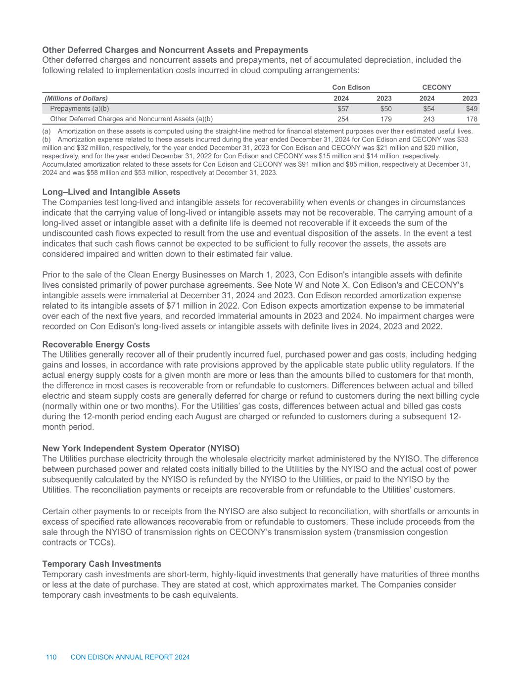 Other Deferred Charges and Noncurrent Assets and Prepayments Other deferred charges and noncurrent assets and prepayments, net of accumulated depreciation, included the following related to implementation costs incurred in cloud computing arrangements: Con Edison CECONY (Millions of Dollars) 2024 2023 2024 2023 Prepayments (a)(b) $57 $50 $54 $49 Other Deferred Charges and Noncurrent Assets (a)(b) 254 179 243 178 (a) Amortization on these assets is computed using the straight-line method for financial statement purposes over their estimated useful lives. (b) Amortization expense related to these assets incurred during the year ended December 31, 2024 for Con Edison and CECONY was $33 million and $32 million, respectively, for the year ended December 31, 2023 for Con Edison and CECONY was $21 million and $20 million, respectively, and for the year ended December 31, 2022 for Con Edison and CECONY was $15 million and $14 million, respectively. Accumulated amortization related to these assets for Con Edison and CECONY was $91 million and $85 million, respectively at December 31, 2024 and was $58 million and $53 million, respectively at December 31, 2023. Long–Lived and Intangible Assets The Companies test long-lived and intangible assets for recoverability when events or changes in circumstances indicate that the carrying value of long-lived or intangible assets may not be recoverable. The carrying amount of a long-lived asset or intangible asset with a definite life is deemed not recoverable if it exceeds the sum of the undiscounted cash flows expected to result from the use and eventual disposition of the assets. In the event a test indicates that such cash flows cannot be expected to be sufficient to fully recover the assets, the assets are considered impaired and written down to their estimated fair value. Prior to the sale of the Clean Energy Businesses on March 1, 2023, Con Edison's intangible assets with definite lives consisted primarily of power purchase agreements. See Note W and Note X. Con Edison's and CECONY's intangible assets were immaterial at December 31, 2024 and 2023. Con Edison recorded amortization expense related to its intangible assets of $71 million in 2022. Con Edison expects amortization expense to be immaterial over each of the next five years, and recorded immaterial amounts in 2023 and 2024. No impairment charges were recorded on Con Edison's long-lived assets or intangible assets with definite lives in 2024, 2023 and 2022. Recoverable Energy Costs The Utilities generally recover all of their prudently incurred fuel, purchased power and gas costs, including hedging gains and losses, in accordance with rate provisions approved by the applicable state public utility regulators. If the actual energy supply costs for a given month are more or less than the amounts billed to customers for that month, the difference in most cases is recoverable from or refundable to customers. Differences between actual and billed electric and steam supply costs are generally deferred for charge or refund to customers during the next billing cycle (normally within one or two months). For the Utilities’ gas costs, differences between actual and billed gas costs during the 12-month period ending each August are charged or refunded to customers during a subsequent 12- month period. New York Independent System Operator (NYISO) The Utilities purchase electricity through the wholesale electricity market administered by the NYISO. The difference between purchased power and related costs initially billed to the Utilities by the NYISO and the actual cost of power subsequently calculated by the NYISO is refunded by the NYISO to the Utilities, or paid to the NYISO by the Utilities. The reconciliation payments or receipts are recoverable from or refundable to the Utilities’ customers. Certain other payments to or receipts from the NYISO are also subject to reconciliation, with shortfalls or amounts in excess of specified rate allowances recoverable from or refundable to customers. These include proceeds from the sale through the NYISO of transmission rights on CECONY’s transmission system (transmission congestion contracts or TCCs). Temporary Cash Investments Temporary cash investments are short-term, highly-liquid investments that generally have maturities of three months or less at the date of purchase. They are stated at cost, which approximates market. The Companies consider temporary cash investments to be cash equivalents. 110 CON EDISON ANNUAL REPORT 2024
