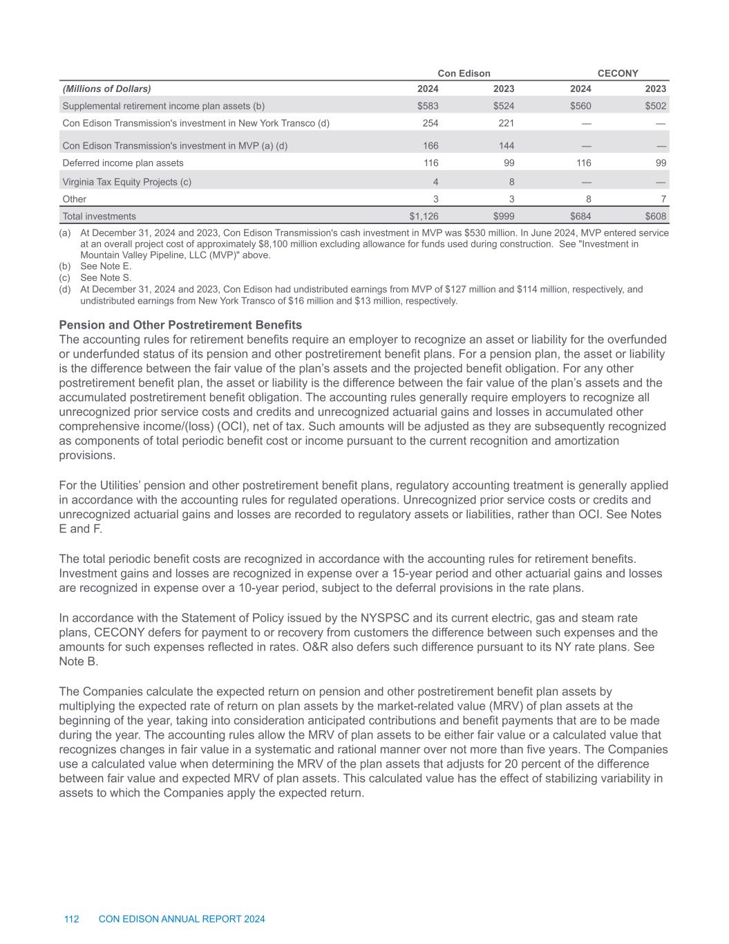 Con Edison CECONY (Millions of Dollars) 2024 2023 2024 2023 Supplemental retirement income plan assets (b) $583 $524 $560 $502 Con Edison Transmission's investment in New York Transco (d) 254 221 — — Con Edison Transmission's investment in MVP (a) (d) 166 144 — — Deferred income plan assets 116 99 116 99 Virginia Tax Equity Projects (c) 4 8 — — Other 3 3 8 7 Total investments $1,126 $999 $684 $608 (a) At December 31, 2024 and 2023, Con Edison Transmission's cash investment in MVP was $530 million. In June 2024, MVP entered service at an overall project cost of approximately $8,100 million excluding allowance for funds used during construction. See "Investment in Mountain Valley Pipeline, LLC (MVP)" above. (b) See Note E. (c) See Note S. (d) At December 31, 2024 and 2023, Con Edison had undistributed earnings from MVP of $127 million and $114 million, respectively, and undistributed earnings from New York Transco of $16 million and $13 million, respectively. Pension and Other Postretirement Benefits The accounting rules for retirement benefits require an employer to recognize an asset or liability for the overfunded or underfunded status of its pension and other postretirement benefit plans. For a pension plan, the asset or liability is the difference between the fair value of the plan’s assets and the projected benefit obligation. For any other postretirement benefit plan, the asset or liability is the difference between the fair value of the plan’s assets and the accumulated postretirement benefit obligation. The accounting rules generally require employers to recognize all unrecognized prior service costs and credits and unrecognized actuarial gains and losses in accumulated other comprehensive income/(loss) (OCI), net of tax. Such amounts will be adjusted as they are subsequently recognized as components of total periodic benefit cost or income pursuant to the current recognition and amortization provisions. For the Utilities’ pension and other postretirement benefit plans, regulatory accounting treatment is generally applied in accordance with the accounting rules for regulated operations. Unrecognized prior service costs or credits and unrecognized actuarial gains and losses are recorded to regulatory assets or liabilities, rather than OCI. See Notes E and F. The total periodic benefit costs are recognized in accordance with the accounting rules for retirement benefits. Investment gains and losses are recognized in expense over a 15-year period and other actuarial gains and losses are recognized in expense over a 10-year period, subject to the deferral provisions in the rate plans. In accordance with the Statement of Policy issued by the NYSPSC and its current electric, gas and steam rate plans, CECONY defers for payment to or recovery from customers the difference between such expenses and the amounts for such expenses reflected in rates. O&R also defers such difference pursuant to its NY rate plans. See Note B. The Companies calculate the expected return on pension and other postretirement benefit plan assets by multiplying the expected rate of return on plan assets by the market-related value (MRV) of plan assets at the beginning of the year, taking into consideration anticipated contributions and benefit payments that are to be made during the year. The accounting rules allow the MRV of plan assets to be either fair value or a calculated value that recognizes changes in fair value in a systematic and rational manner over not more than five years. The Companies use a calculated value when determining the MRV of the plan assets that adjusts for 20 percent of the difference between fair value and expected MRV of plan assets. This calculated value has the effect of stabilizing variability in assets to which the Companies apply the expected return. 112 CON EDISON ANNUAL REPORT 2024