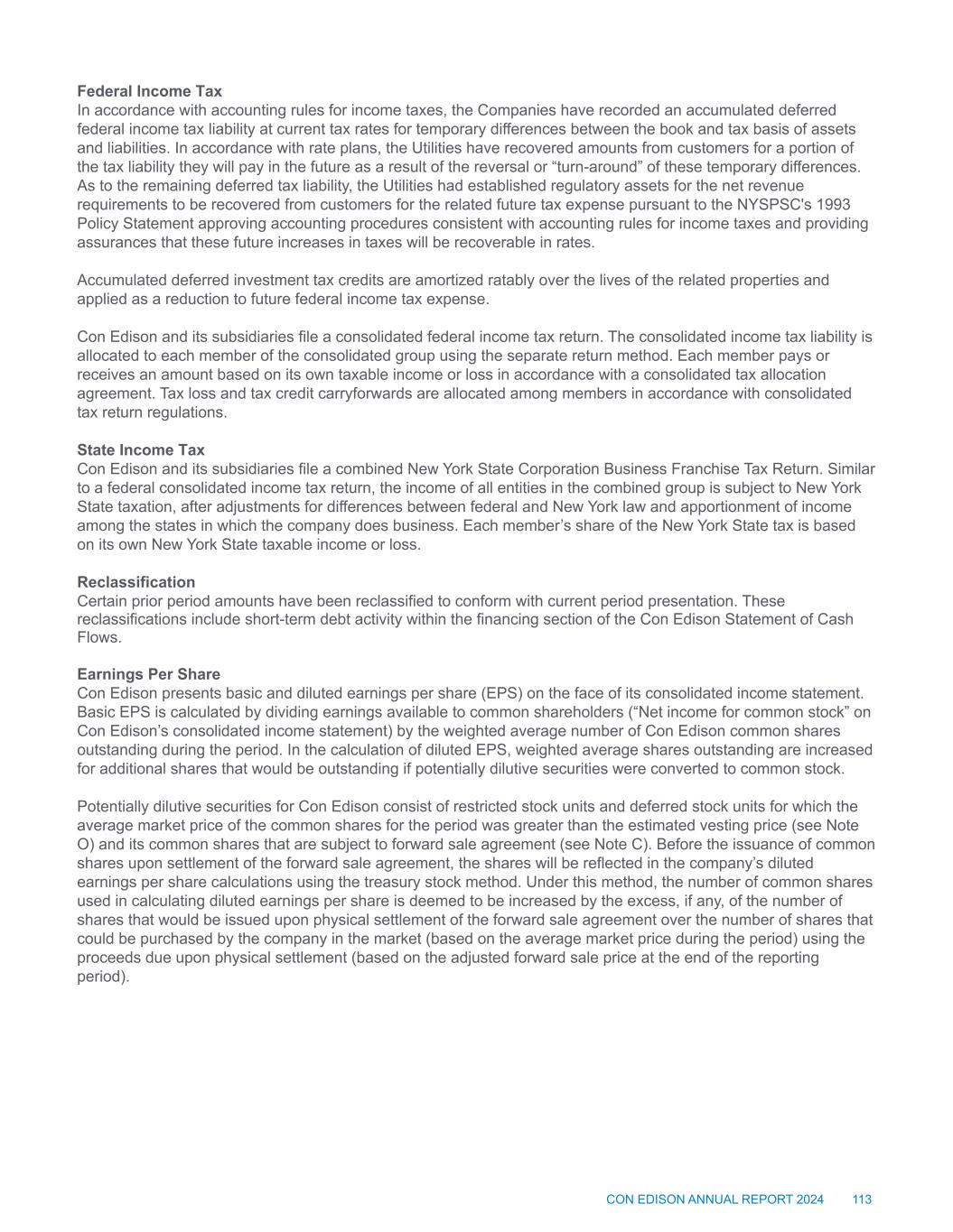 Federal Income Tax In accordance with accounting rules for income taxes, the Companies have recorded an accumulated deferred federal income tax liability at current tax rates for temporary differences between the book and tax basis of assets and liabilities. In accordance with rate plans, the Utilities have recovered amounts from customers for a portion of the tax liability they will pay in the future as a result of the reversal or “turn-around” of these temporary differences. As to the remaining deferred tax liability, the Utilities had established regulatory assets for the net revenue requirements to be recovered from customers for the related future tax expense pursuant to the NYSPSC's 1993 Policy Statement approving accounting procedures consistent with accounting rules for income taxes and providing assurances that these future increases in taxes will be recoverable in rates. Accumulated deferred investment tax credits are amortized ratably over the lives of the related properties and applied as a reduction to future federal income tax expense. Con Edison and its subsidiaries file a consolidated federal income tax return. The consolidated income tax liability is allocated to each member of the consolidated group using the separate return method. Each member pays or receives an amount based on its own taxable income or loss in accordance with a consolidated tax allocation agreement. Tax loss and tax credit carryforwards are allocated among members in accordance with consolidated tax return regulations. State Income Tax Con Edison and its subsidiaries file a combined New York State Corporation Business Franchise Tax Return. Similar to a federal consolidated income tax return, the income of all entities in the combined group is subject to New York State taxation, after adjustments for differences between federal and New York law and apportionment of income among the states in which the company does business. Each member’s share of the New York State tax is based on its own New York State taxable income or loss. Reclassification Certain prior period amounts have been reclassified to conform with current period presentation. These reclassifications include short-term debt activity within the financing section of the Con Edison Statement of Cash Flows. Earnings Per Share Con Edison presents basic and diluted earnings per share (EPS) on the face of its consolidated income statement. Basic EPS is calculated by dividing earnings available to common shareholders (“Net income for common stock” on Con Edison’s consolidated income statement) by the weighted average number of Con Edison common shares outstanding during the period. In the calculation of diluted EPS, weighted average shares outstanding are increased for additional shares that would be outstanding if potentially dilutive securities were converted to common stock. Potentially dilutive securities for Con Edison consist of restricted stock units and deferred stock units for which the average market price of the common shares for the period was greater than the estimated vesting price (see Note O) and its common shares that are subject to forward sale agreement (see Note C). Before the issuance of common shares upon settlement of the forward sale agreement, the shares will be reflected in the company’s diluted earnings per share calculations using the treasury stock method. Under this method, the number of common shares used in calculating diluted earnings per share is deemed to be increased by the excess, if any, of the number of shares that would be issued upon physical settlement of the forward sale agreement over the number of shares that could be purchased by the company in the market (based on the average market price during the period) using the proceeds due upon physical settlement (based on the adjusted forward sale price at the end of the reporting period). CON EDISON ANNUAL REPORT 2024 113