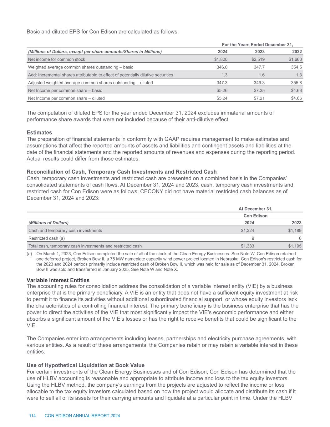 Basic and diluted EPS for Con Edison are calculated as follows: For the Years Ended December 31, (Millions of Dollars, except per share amounts/Shares in Millions) 2024 2023 2022 Net income for common stock $1,820 $2,519 $1,660 Weighted average common shares outstanding – basic 346.0 347.7 354.5 Add: Incremental shares attributable to effect of potentially dilutive securities 1.3 1.6 1.3 Adjusted weighted average common shares outstanding – diluted 347.3 349.3 355.8 Net Income per common share – basic $5.26 $7.25 $4.68 Net Income per common share – diluted $5.24 $7.21 $4.66 The computation of diluted EPS for the year ended December 31, 2024 excludes immaterial amounts of performance share awards that were not included because of their anti-dilutive effect. Estimates The preparation of financial statements in conformity with GAAP requires management to make estimates and assumptions that affect the reported amounts of assets and liabilities and contingent assets and liabilities at the date of the financial statements and the reported amounts of revenues and expenses during the reporting period. Actual results could differ from those estimates. Reconciliation of Cash, Temporary Cash Investments and Restricted Cash Cash, temporary cash investments and restricted cash are presented on a combined basis in the Companies’ consolidated statements of cash flows. At December 31, 2024 and 2023, cash, temporary cash investments and restricted cash for Con Edison were as follows; CECONY did not have material restricted cash balances as of December 31, 2024 and 2023: At December 31, Con Edison (Millions of Dollars) 2024 2023 Cash and temporary cash investments $1,324 $1,189 Restricted cash (a) 9 6 Total cash, temporary cash investments and restricted cash $1,333 $1,195 (a) On March 1, 2023, Con Edison completed the sale of all of the stock of the Clean Energy Businesses. See Note W. Con Edison retained one deferred project, Broken Bow II, a 75 MW nameplate capacity wind power project located in Nebraska. Con Edison's restricted cash for the 2023 and 2024 periods primarily include restricted cash of Broken Bow II, which was held for sale as of December 31, 2024. Broken Bow II was sold and transferred in January 2025. See Note W and Note X. Variable Interest Entities The accounting rules for consolidation address the consolidation of a variable interest entity (VIE) by a business enterprise that is the primary beneficiary. A VIE is an entity that does not have a sufficient equity investment at risk to permit it to finance its activities without additional subordinated financial support, or whose equity investors lack the characteristics of a controlling financial interest. The primary beneficiary is the business enterprise that has the power to direct the activities of the VIE that most significantly impact the VIE’s economic performance and either absorbs a significant amount of the VIE’s losses or has the right to receive benefits that could be significant to the VIE. The Companies enter into arrangements including leases, partnerships and electricity purchase agreements, with various entities. As a result of these arrangements, the Companies retain or may retain a variable interest in these entities. Use of Hypothetical Liquidation at Book Value For certain investments of the Clean Energy Businesses and of Con Edison, Con Edison has determined that the use of HLBV accounting is reasonable and appropriate to attribute income and loss to the tax equity investors. Using the HLBV method, the company's earnings from the projects are adjusted to reflect the income or loss allocable to the tax equity investors calculated based on how the project would allocate and distribute its cash if it were to sell all of its assets for their carrying amounts and liquidate at a particular point in time. Under the HLBV 114 CON EDISON ANNUAL REPORT 2024