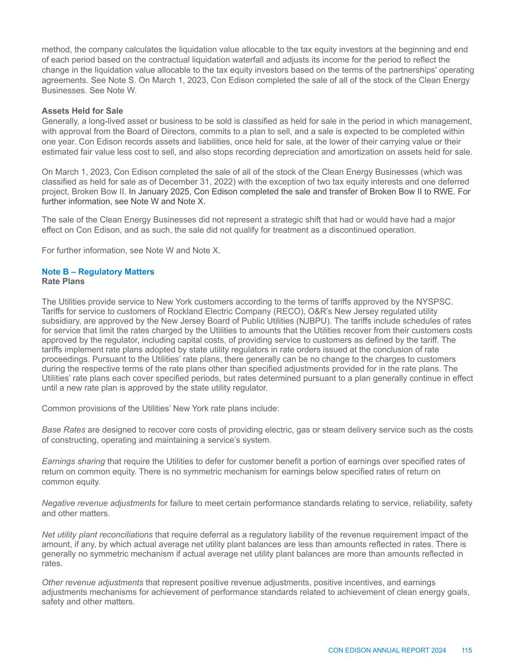 method, the company calculates the liquidation value allocable to the tax equity investors at the beginning and end of each period based on the contractual liquidation waterfall and adjusts its income for the period to reflect the change in the liquidation value allocable to the tax equity investors based on the terms of the partnerships' operating agreements. See Note S. On March 1, 2023, Con Edison completed the sale of all of the stock of the Clean Energy Businesses. See Note W. Assets Held for Sale Generally, a long-lived asset or business to be sold is classified as held for sale in the period in which management, with approval from the Board of Directors, commits to a plan to sell, and a sale is expected to be completed within one year. Con Edison records assets and liabilities, once held for sale, at the lower of their carrying value or their estimated fair value less cost to sell, and also stops recording depreciation and amortization on assets held for sale. On March 1, 2023, Con Edison completed the sale of all of the stock of the Clean Energy Businesses (which was classified as held for sale as of December 31, 2022) with the exception of two tax equity interests and one deferred project, Broken Bow II. In January 2025, Con Edison completed the sale and transfer of Broken Bow II to RWE. For further information, see Note W and Note X. The sale of the Clean Energy Businesses did not represent a strategic shift that had or would have had a major effect on Con Edison, and as such, the sale did not qualify for treatment as a discontinued operation. For further information, see Note W and Note X. Note B – Regulatory Matters Rate Plans The Utilities provide service to New York customers according to the terms of tariffs approved by the NYSPSC. Tariffs for service to customers of Rockland Electric Company (RECO), O&R’s New Jersey regulated utility subsidiary, are approved by the New Jersey Board of Public Utilities (NJBPU). The tariffs include schedules of rates for service that limit the rates charged by the Utilities to amounts that the Utilities recover from their customers costs approved by the regulator, including capital costs, of providing service to customers as defined by the tariff. The tariffs implement rate plans adopted by state utility regulators in rate orders issued at the conclusion of rate proceedings. Pursuant to the Utilities’ rate plans, there generally can be no change to the charges to customers during the respective terms of the rate plans other than specified adjustments provided for in the rate plans. The Utilities’ rate plans each cover specified periods, but rates determined pursuant to a plan generally continue in effect until a new rate plan is approved by the state utility regulator. Common provisions of the Utilities’ New York rate plans include: Base Rates are designed to recover core costs of providing electric, gas or steam delivery service such as the costs of constructing, operating and maintaining a service’s system. Earnings sharing that require the Utilities to defer for customer benefit a portion of earnings over specified rates of return on common equity. There is no symmetric mechanism for earnings below specified rates of return on common equity. Negative revenue adjustments for failure to meet certain performance standards relating to service, reliability, safety and other matters. Net utility plant reconciliations that require deferral as a regulatory liability of the revenue requirement impact of the amount, if any, by which actual average net utility plant balances are less than amounts reflected in rates. There is generally no symmetric mechanism if actual average net utility plant balances are more than amounts reflected in rates. Other revenue adjustments that represent positive revenue adjustments, positive incentives, and earnings adjustments mechanisms for achievement of performance standards related to achievement of clean energy goals, safety and other matters. CON EDISON ANNUAL REPORT 2024 115