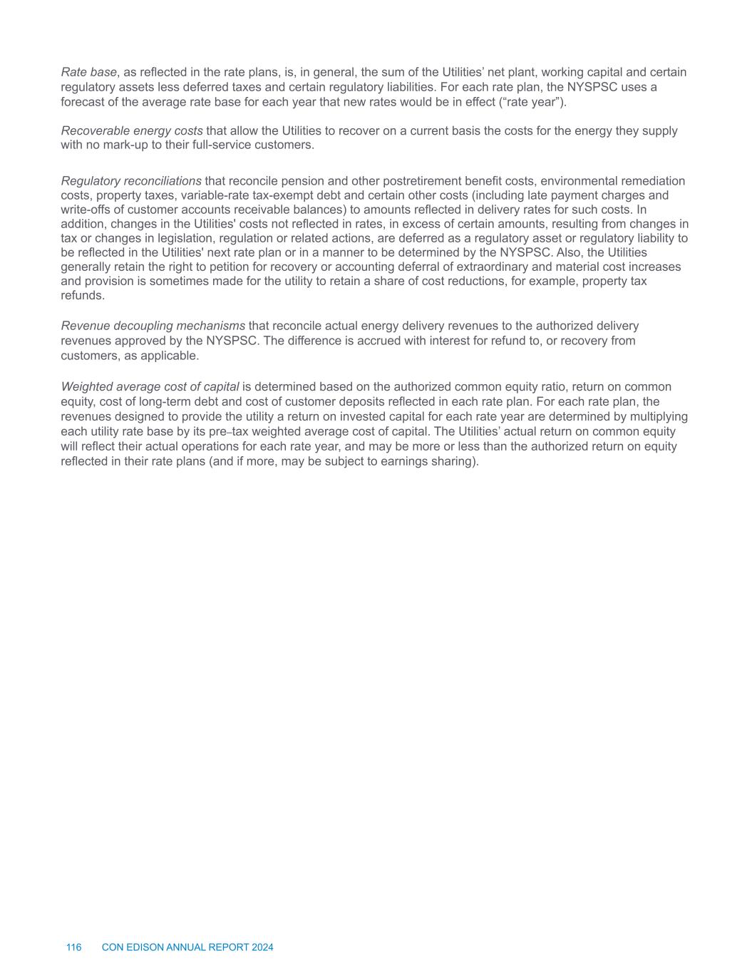 Rate base, as reflected in the rate plans, is, in general, the sum of the Utilities’ net plant, working capital and certain regulatory assets less deferred taxes and certain regulatory liabilities. For each rate plan, the NYSPSC uses a forecast of the average rate base for each year that new rates would be in effect (“rate year”). Recoverable energy costs that allow the Utilities to recover on a current basis the costs for the energy they supply with no mark-up to their full-service customers. Regulatory reconciliations that reconcile pension and other postretirement benefit costs, environmental remediation costs, property taxes, variable-rate tax-exempt debt and certain other costs (including late payment charges and write-offs of customer accounts receivable balances) to amounts reflected in delivery rates for such costs. In addition, changes in the Utilities' costs not reflected in rates, in excess of certain amounts, resulting from changes in tax or changes in legislation, regulation or related actions, are deferred as a regulatory asset or regulatory liability to be reflected in the Utilities' next rate plan or in a manner to be determined by the NYSPSC. Also, the Utilities generally retain the right to petition for recovery or accounting deferral of extraordinary and material cost increases and provision is sometimes made for the utility to retain a share of cost reductions, for example, property tax refunds. Revenue decoupling mechanisms that reconcile actual energy delivery revenues to the authorized delivery revenues approved by the NYSPSC. The difference is accrued with interest for refund to, or recovery from customers, as applicable. Weighted average cost of capital is determined based on the authorized common equity ratio, return on common equity, cost of long-term debt and cost of customer deposits reflected in each rate plan. For each rate plan, the revenues designed to provide the utility a return on invested capital for each rate year are determined by multiplying each utility rate base by its pre–tax weighted average cost of capital. The Utilities’ actual return on common equity will reflect their actual operations for each rate year, and may be more or less than the authorized return on equity reflected in their rate plans (and if more, may be subject to earnings sharing). 116 CON EDISON ANNUAL REPORT 2024