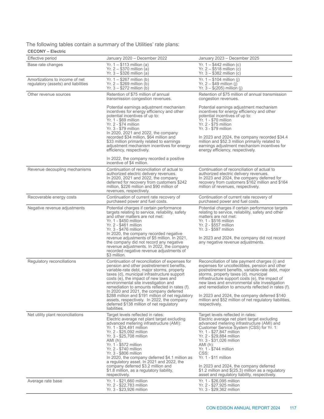 The following tables contain a summary of the Utilities’ rate plans: CECONY – Electric Effective period January 2020 – December 2022 January 2023 – December 2025 Base rate changes Yr. 1 – $113 million (a) Yr. 2 – $370 million (a) Yr. 3 – $326 million (a) Yr. 1 – $442 million (c) Yr. 2 – $518 million (c) Yr. 3 – $382 million (c) Amortizations to income of net regulatory (assets) and liabilities Yr. 1 – $267 million (b) Yr. 2 – $269 million (b) Yr. 3 – $272 million (b) Yr. 1 – $104 million (j) Yr. 2 – $49 million (j) Yr. 3 – $(205) million (j) Other revenue sources Retention of $75 million of annual transmission congestion revenues. Potential earnings adjustment mechanism incentives for energy efficiency and other potential incentives of up to: Yr. 1 - $69 million Yr. 2 - $74 million Yr. 3 - $79 million In 2020, 2021 and 2022, the company recorded $34 million, $64 million and $33 million primarily related to earnings adjustment mechanism incentives for energy efficiency, respectively. In 2022, the company recorded a positive incentive of $4 million. Retention of $75 million of annual transmission congestion revenues. Potential earnings adjustment mechanism incentives for energy efficiency and other potential incentives of up to: Yr. 1 - $70 million Yr. 2 - $75 million Yr. 3 - $79 million In 2023 and 2024, the company recorded $34.4 million and $52.3 million primarily related to earnings adjustment mechanism incentives for energy efficiency, respectively. Revenue decoupling mechanisms Continuation of reconciliation of actual to authorized electric delivery revenues. In 2020, 2021 and 2022, the company deferred for recovery from customers $242 million, $226 million and $90 million of revenues, respectively. Continuation of reconciliation of actual to authorized electric delivery revenues. In 2023 and 2024, the company deferred for recovery from customers $162 million and $164 million of revenues, respectively. Recoverable energy costs Continuation of current rate recovery of purchased power and fuel costs. Continuation of current rate recovery of purchased power and fuel costs. Negative revenue adjustments Potential charges if certain performance targets relating to service, reliability, safety and other matters are not met: Yr. 1 - $450 million Yr. 2 - $461 million Yr. 3 - $476 million In 2020, the company recorded negative revenue adjustments of $5 million. In 2021, the company did not record any negative revenue adjustments. In 2022, the company recorded negative revenue adjustments of $3 million. Potential charges if certain performance targets relating to service, reliability, safety and other matters are not met: Yr. 1 - $516 million Yr. 2 - $557 million Yr. 3 - $597 million In 2023 and 2024, the company did not record any negative revenue adjustments. Regulatory reconciliations Continuation of reconciliation of expenses for pension and other postretirement benefits, variable-rate debt, major storms, property taxes (d), municipal infrastructure support costs (e), the impact of new laws and environmental site investigation and remediation to amounts reflected in rates (f). In 2020 and 2021, the company deferred $288 million and $191 million of net regulatory assets, respectively. In 2022, the company deferred $138 million of net regulatory liabilities. Reconciliation of late payment charges (i) and expenses for uncollectibles, pension and other postretirement benefits, variable-rate debt, major storms, property taxes (d), municipal infrastructure support costs (e), the impact of new laws and environmental site investigation and remediation to amounts reflected in rates (f). In 2023 and 2024, the company deferred $140 million and $52 million of net regulatory liabilities, respectively. Net utility plant reconciliations Target levels reflected in rates: Electric average net plant target excluding advanced metering infrastructure (AMI): Yr. 1 - $24,491 million Yr. 2 - $25,092 million Yr. 3 - $25,708 million AMI (h): Yr. 1 - $572 million Yr. 2 - $740 million Yr. 3 - $806 million In 2020, the company deferred $4.1 million as a regulatory asset. In 2021 and 2022, the company deferred $3.2 million and $1.8 million, as a regulatory liability, respectively. Target levels reflected in rates: Electric average net plant target excluding advanced metering infrastructure (AMI) and Customer Service System (CSS) for Yr. 1: Yr. 1 - $27,847 million Yr. 2 - $29,884 million Yr. 3 - $31,026 million AMI (h): Yr. 1 - $744 million CSS: Yr. 1 - $11 million In 2023 and 2024, the company deferred $1.2 million and $(25.3) million as a regulatory asset and regulatory liability, respectively. Average rate base Yr. 1 - $21,660 million Yr. 2 - $22,783 million Yr. 3 - $23,926 million Yr. 1 - $26,095 million Yr. 2 - $27,925 million Yr. 3 - $29,362 million CON EDISON ANNUAL REPORT 2024 117