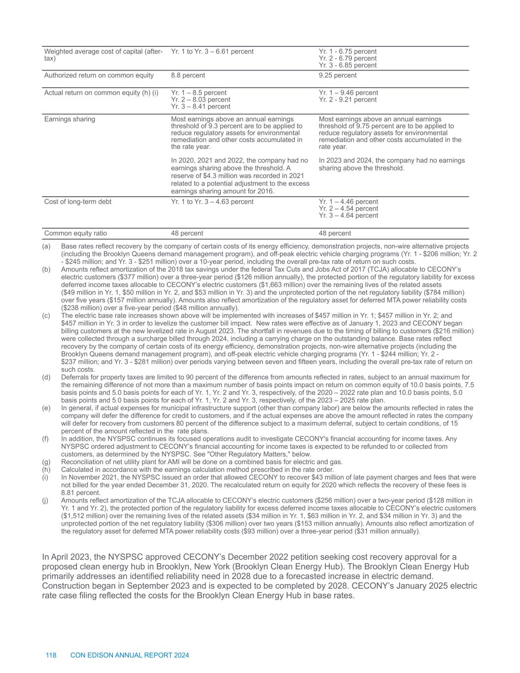 Weighted average cost of capital (after- tax) Yr. 1 to Yr. 3 – 6.61 percent Yr. 1 - 6.75 percent Yr. 2 - 6.79 percent Yr. 3 - 6.85 percent Authorized return on common equity 8.8 percent 9.25 percent Actual return on common equity (h) (i) Yr. 1 – 8.5 percent Yr. 2 – 8.03 percent Yr. 3 – 8.41 percent Yr. 1 – 9.46 percent Yr. 2 - 9.21 percent Earnings sharing Most earnings above an annual earnings threshold of 9.3 percent are to be applied to reduce regulatory assets for environmental remediation and other costs accumulated in the rate year. In 2020, 2021 and 2022, the company had no earnings sharing above the threshold. A reserve of $4.3 million was recorded in 2021 related to a potential adjustment to the excess earnings sharing amount for 2016. Most earnings above an annual earnings threshold of 9.75 percent are to be applied to reduce regulatory assets for environmental remediation and other costs accumulated in the rate year. In 2023 and 2024, the company had no earnings sharing above the threshold. Cost of long-term debt Yr. 1 to Yr. 3 – 4.63 percent Yr. 1 – 4.46 percent Yr. 2 – 4.54 percent Yr. 3 – 4.64 percent Common equity ratio 48 percent 48 percent (a) Base rates reflect recovery by the company of certain costs of its energy efficiency, demonstration projects, non-wire alternative projects (including the Brooklyn Queens demand management program), and off-peak electric vehicle charging programs (Yr. 1 - $206 million; Yr. 2 - $245 million; and Yr. 3 - $251 million) over a 10-year period, including the overall pre-tax rate of return on such costs. (b) Amounts reflect amortization of the 2018 tax savings under the federal Tax Cuts and Jobs Act of 2017 (TCJA) allocable to CECONY’s electric customers ($377 million) over a three-year period ($126 million annually), the protected portion of the regulatory liability for excess deferred income taxes allocable to CECONY’s electric customers ($1,663 million) over the remaining lives of the related assets ($49 million in Yr. 1, $50 million in Yr. 2, and $53 million in Yr. 3) and the unprotected portion of the net regulatory liability ($784 million) over five years ($157 million annually). Amounts also reflect amortization of the regulatory asset for deferred MTA power reliability costs ($238 million) over a five-year period ($48 million annually). (c) The electric base rate increases shown above will be implemented with increases of $457 million in Yr. 1; $457 million in Yr. 2; and $457 million in Yr. 3 in order to levelize the customer bill impact. New rates were effective as of January 1, 2023 and CECONY began billing customers at the new levelized rate in August 2023. The shortfall in revenues due to the timing of billing to customers ($216 million) were collected through a surcharge billed through 2024, including a carrying charge on the outstanding balance. Base rates reflect recovery by the company of certain costs of its energy efficiency, demonstration projects, non-wire alternative projects (including the Brooklyn Queens demand management program), and off-peak electric vehicle charging programs (Yr. 1 - $244 million; Yr. 2 - $237 million; and Yr. 3 - $281 million) over periods varying between seven and fifteen years, including the overall pre-tax rate of return on such costs. (d) Deferrals for property taxes are limited to 90 percent of the difference from amounts reflected in rates, subject to an annual maximum for the remaining difference of not more than a maximum number of basis points impact on return on common equity of 10.0 basis points, 7.5 basis points and 5.0 basis points for each of Yr. 1, Yr. 2 and Yr. 3, respectively, of the 2020 – 2022 rate plan and 10.0 basis points, 5.0 basis points and 5.0 basis points for each of Yr. 1, Yr. 2 and Yr. 3, respectively, of the 2023 – 2025 rate plan. (e) In general, if actual expenses for municipal infrastructure support (other than company labor) are below the amounts reflected in rates the company will defer the difference for credit to customers, and if the actual expenses are above the amount reflected in rates the company will defer for recovery from customers 80 percent of the difference subject to a maximum deferral, subject to certain conditions, of 15 percent of the amount reflected in the rate plans. (f) In addition, the NYSPSC continues its focused operations audit to investigate CECONY's financial accounting for income taxes. Any NYSPSC ordered adjustment to CECONY’s financial accounting for income taxes is expected to be refunded to or collected from customers, as determined by the NYSPSC. See "Other Regulatory Matters," below. (g) Reconciliation of net utility plant for AMI will be done on a combined basis for electric and gas. (h) Calculated in accordance with the earnings calculation method prescribed in the rate order. (i) In November 2021, the NYSPSC issued an order that allowed CECONY to recover $43 million of late payment charges and fees that were not billed for the year ended December 31, 2020. The recalculated return on equity for 2020 which reflects the recovery of these fees is 8.81 percent. (j) Amounts reflect amortization of the TCJA allocable to CECONY’s electric customers ($256 million) over a two-year period ($128 million in Yr. 1 and Yr. 2), the protected portion of the regulatory liability for excess deferred income taxes allocable to CECONY’s electric customers ($1,512 million) over the remaining lives of the related assets ($34 million in Yr. 1, $63 million in Yr. 2, and $34 million in Yr. 3) and the unprotected portion of the net regulatory liability ($306 million) over two years ($153 million annually). Amounts also reflect amortization of the regulatory asset for deferred MTA power reliability costs ($93 million) over a three-year period ($31 million annually). In April 2023, the NYSPSC approved CECONY’s December 2022 petition seeking cost recovery approval for a proposed clean energy hub in Brooklyn, New York (Bro