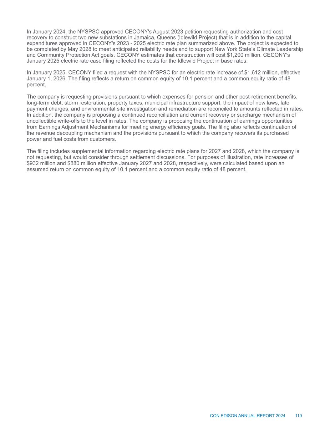 In January 2024, the NYSPSC approved CECONY's August 2023 petition requesting authorization and cost recovery to construct two new substations in Jamaica, Queens (Idlewild Project) that is in addition to the capital expenditures approved in CECONY's 2023 - 2025 electric rate plan summarized above. The project is expected to be completed by May 2028 to meet anticipated reliability needs and to support New York State’s Climate Leadership and Community Protection Act goals. CECONY estimates that construction will cost $1,200 million. CECONY's January 2025 electric rate case filing reflected the costs for the Idlewild Project in base rates. In January 2025, CECONY filed a request with the NYSPSC for an electric rate increase of $1,612 million, effective January 1, 2026. The filing reflects a return on common equity of 10.1 percent and a common equity ratio of 48 percent. The company is requesting provisions pursuant to which expenses for pension and other post-retirement benefits, long-term debt, storm restoration, property taxes, municipal infrastructure support, the impact of new laws, late payment charges, and environmental site investigation and remediation are reconciled to amounts reflected in rates. In addition, the company is proposing a continued reconciliation and current recovery or surcharge mechanism of uncollectible write-offs to the level in rates. The company is proposing the continuation of earnings opportunities from Earnings Adjustment Mechanisms for meeting energy efficiency goals. The filing also reflects continuation of the revenue decoupling mechanism and the provisions pursuant to which the company recovers its purchased power and fuel costs from customers. The filing includes supplemental information regarding electric rate plans for 2027 and 2028, which the company is not requesting, but would consider through settlement discussions. For purposes of illustration, rate increases of $932 million and $880 million effective January 2027 and 2028, respectively, were calculated based upon an assumed return on common equity of 10.1 percent and a common equity ratio of 48 percent. CON EDISON ANNUAL REPORT 2024 119