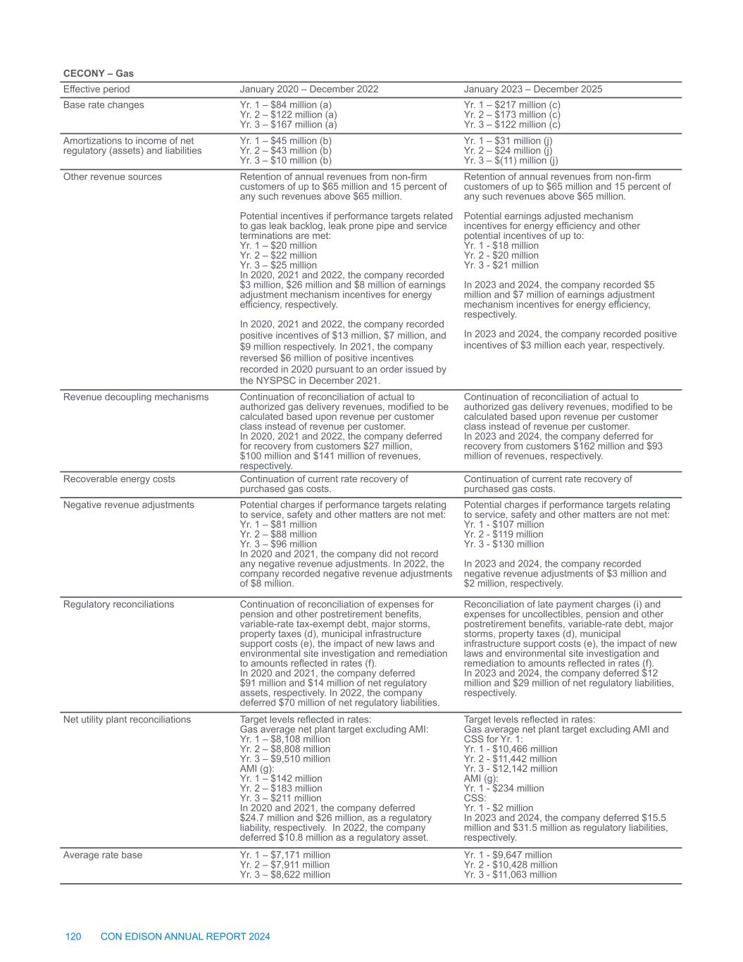 CECONY – Gas Effective period January 2020 – December 2022 January 2023 – December 2025 Base rate changes Yr. 1 – $84 million (a) Yr. 2 – $122 million (a) Yr. 3 – $167 million (a) Yr. 1 – $217 million (c) Yr. 2 – $173 million (c) Yr. 3 – $122 million (c) Amortizations to income of net regulatory (assets) and liabilities Yr. 1 – $45 million (b) Yr. 2 – $43 million (b) Yr. 3 – $10 million (b) Yr. 1 – $31 million (j) Yr. 2 – $24 million (j) Yr. 3 – $(11) million (j) Other revenue sources Retention of annual revenues from non-firm customers of up to $65 million and 15 percent of any such revenues above $65 million. Potential incentives if performance targets related to gas leak backlog, leak prone pipe and service terminations are met: Yr. 1 – $20 million Yr. 2 – $22 million Yr. 3 – $25 million In 2020, 2021 and 2022, the company recorded $3 million, $26 million and $8 million of earnings adjustment mechanism incentives for energy efficiency, respectively. In 2020, 2021 and 2022, the company recorded positive incentives of $13 million, $7 million, and $9 million respectively. In 2021, the company reversed $6 million of positive incentives recorded in 2020 pursuant to an order issued by the NYSPSC in December 2021. Retention of annual revenues from non-firm customers of up to $65 million and 15 percent of any such revenues above $65 million. Potential earnings adjusted mechanism incentives for energy efficiency and other potential incentives of up to: Yr. 1 - $18 million Yr. 2 - $20 million Yr. 3 - $21 million In 2023 and 2024, the company recorded $5 million and $7 million of earnings adjustment mechanism incentives for energy efficiency, respectively. In 2023 and 2024, the company recorded positive incentives of $3 million each year, respectively. Revenue decoupling mechanisms Continuation of reconciliation of actual to authorized gas delivery revenues, modified to be calculated based upon revenue per customer class instead of revenue per customer. In 2020, 2021 and 2022, the company deferred for recovery from customers $27 million, $100 million and $141 million of revenues, respectively. Continuation of reconciliation of actual to authorized gas delivery revenues, modified to be calculated based upon revenue per customer class instead of revenue per customer. In 2023 and 2024, the company deferred for recovery from customers $162 million and $93 million of revenues, respectively. Recoverable energy costs Continuation of current rate recovery of purchased gas costs. Continuation of current rate recovery of purchased gas costs. Negative revenue adjustments Potential charges if performance targets relating to service, safety and other matters are not met: Yr. 1 – $81 million Yr. 2 – $88 million Yr. 3 – $96 million In 2020 and 2021, the company did not record any negative revenue adjustments. In 2022, the company recorded negative revenue adjustments of $8 million. Potential charges if performance targets relating to service, safety and other matters are not met: Yr. 1 - $107 million Yr. 2 - $119 million Yr. 3 - $130 million In 2023 and 2024, the company recorded negative revenue adjustments of $3 million and $2 million, respectively. Regulatory reconciliations Continuation of reconciliation of expenses for pension and other postretirement benefits, variable-rate tax-exempt debt, major storms, property taxes (d), municipal infrastructure support costs (e), the impact of new laws and environmental site investigation and remediation to amounts reflected in rates (f). In 2020 and 2021, the company deferred $91 million and $14 million of net regulatory assets, respectively. In 2022, the company deferred $70 million of net regulatory liabilities. Reconciliation of late payment charges (i) and expenses for uncollectibles, pension and other postretirement benefits, variable-rate debt, major storms, property taxes (d), municipal infrastructure support costs (e), the impact of new laws and environmental site investigation and remediation to amounts reflected in rates (f). In 2023 and 2024, the company deferred $12 million and $29 million of net regulatory liabilities, respectively. Net utility plant reconciliations Target levels reflected in rates: Gas average net plant target excluding AMI: Yr. 1 – $8,108 million Yr. 2 – $8,808 million Yr. 3 – $9,510 million AMI (g): Yr. 1 – $142 million Yr. 2 – $183 million Yr. 3 – $211 million In 2020 and 2021, the company deferred $24.7 million and $26 million, as a regulatory liability, respectively. In 2022, the company deferred $10.8 million as a regulatory asset. Target levels reflected in rates: Gas average net plant target excluding AMI and CSS for Yr. 1: Yr. 1 - $10,466 million Yr. 2 - $11,442 million Yr. 3 - $12,142 million AMI (g): Yr. 1 - $234 million CSS: Yr. 1 - $2 million In 2023 and 2024, the company deferred $15.5 million and $31.5 million as regulatory liabilities, respectively. Average rate base Yr. 1 – $7,171 million Yr. 2 – $7,911 million Yr. 3 – $8,622 million Yr. 1 - $9,647 million Yr. 2 - $10,428 million Yr. 3 - $11,063 million 120 CON EDISON ANNUAL REPORT 2024