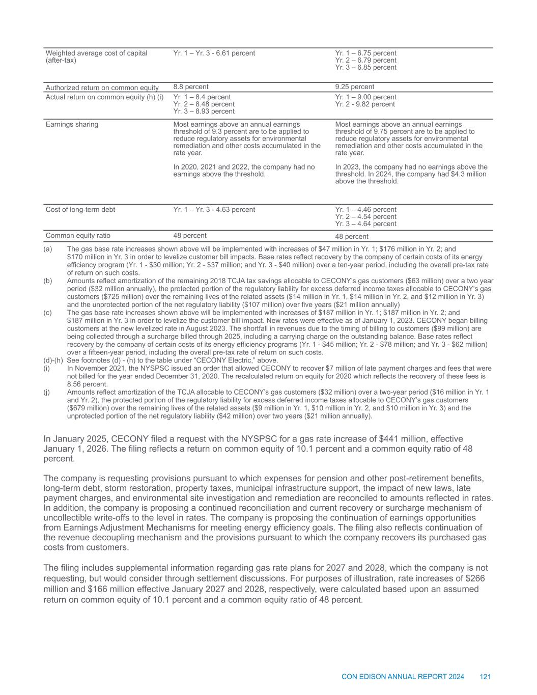Weighted average cost of capital (after-tax) Yr. 1 – Yr. 3 - 6.61 percent Yr. 1 – 6.75 percent Yr. 2 – 6.79 percent Yr. 3 – 6.85 percent Authorized return on common equity 8.8 percent 9.25 percent Actual return on common equity (h) (i) Yr. 1 – 8.4 percent Yr. 2 – 8.48 percent Yr. 3 – 8.93 percent Yr. 1 – 9.00 percent Yr. 2 - 9.82 percent Earnings sharing Most earnings above an annual earnings threshold of 9.3 percent are to be applied to reduce regulatory assets for environmental remediation and other costs accumulated in the rate year. In 2020, 2021 and 2022, the company had no earnings above the threshold. Most earnings above an annual earnings threshold of 9.75 percent are to be applied to reduce regulatory assets for environmental remediation and other costs accumulated in the rate year. In 2023, the company had no earnings above the threshold. In 2024, the company had $4.3 million above the threshold. Cost of long-term debt Yr. 1 – Yr. 3 - 4.63 percent Yr. 1 – 4.46 percent Yr. 2 – 4.54 percent Yr. 3 – 4.64 percent Common equity ratio 48 percent 48 percent (a) The gas base rate increases shown above will be implemented with increases of $47 million in Yr. 1; $176 million in Yr. 2; and $170 million in Yr. 3 in order to levelize customer bill impacts. Base rates reflect recovery by the company of certain costs of its energy efficiency program (Yr. 1 - $30 million; Yr. 2 - $37 million; and Yr. 3 - $40 million) over a ten-year period, including the overall pre-tax rate of return on such costs. (b) Amounts reflect amortization of the remaining 2018 TCJA tax savings allocable to CECONY’s gas customers ($63 million) over a two year period ($32 million annually), the protected portion of the regulatory liability for excess deferred income taxes allocable to CECONY’s gas customers ($725 million) over the remaining lives of the related assets ($14 million in Yr. 1, $14 million in Yr. 2, and $12 million in Yr. 3) and the unprotected portion of the net regulatory liability ($107 million) over five years ($21 million annually) (c) The gas base rate increases shown above will be implemented with increases of $187 million in Yr. 1; $187 million in Yr. 2; and $187 million in Yr. 3 in order to levelize the customer bill impact. New rates were effective as of January 1, 2023. CECONY began billing customers at the new levelized rate in August 2023. The shortfall in revenues due to the timing of billing to customers ($99 million) are being collected through a surcharge billed through 2025, including a carrying charge on the outstanding balance. Base rates reflect recovery by the company of certain costs of its energy efficiency programs (Yr. 1 - $45 million; Yr. 2 - $78 million; and Yr. 3 - $62 million) over a fifteen-year period, including the overall pre-tax rate of return on such costs. (d)-(h) See footnotes (d) - (h) to the table under “CECONY Electric,” above. (i) In November 2021, the NYSPSC issued an order that allowed CECONY to recover $7 million of late payment charges and fees that were not billed for the year ended December 31, 2020. The recalculated return on equity for 2020 which reflects the recovery of these fees is 8.56 percent. (j) Amounts reflect amortization of the TCJA allocable to CECONY’s gas customers ($32 million) over a two-year period ($16 million in Yr. 1 and Yr. 2), the protected portion of the regulatory liability for excess deferred income taxes allocable to CECONY’s gas customers ($679 million) over the remaining lives of the related assets ($9 million in Yr. 1, $10 million in Yr. 2, and $10 million in Yr. 3) and the unprotected portion of the net regulatory liability ($42 million) over two years ($21 million annually). In January 2025, CECONY filed a request with the NYSPSC for a gas rate increase of $441 million, effective January 1, 2026. The filing reflects a return on common equity of 10.1 percent and a common equity ratio of 48 percent. The company is requesting provisions pursuant to which expenses for pension and other post-retirement benefits, long-term debt, storm restoration, property taxes, municipal infrastructure support, the impact of new laws, late payment charges, and environmental site investigation and remediation are reconciled to amounts reflected in rates. In addition, the company is proposing a continued reconciliation and current recovery or surcharge mechanism of uncollectible write-offs to the level in rates. The company is proposing the continuation of earnings opportunities from Earnings Adjustment Mechanisms for meeting energy efficiency goals. The filing also reflects continuation of the revenue decoupling mechanism and the provisions pursuant to which the company recovers its purchased gas costs from customers. The filing includes supplemental information regarding gas rate plans for 2027 and 2028, which the company is not requesting, but would consider through settlement discussions. For purposes of illustration, rate increases of $266 million and $166 million effective January 2027 and 2028, respectively, were calculated based upon an assumed return on common equity of 10.1 percent and a common equity ratio of 48 percent. CON EDISON ANNUAL REPORT 2024 121