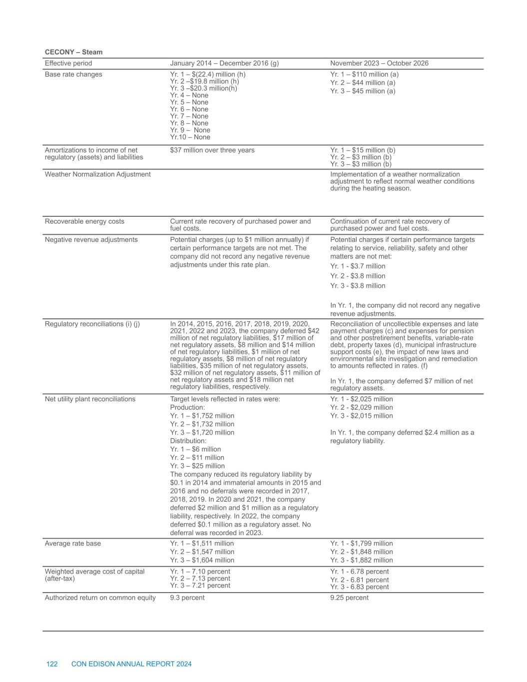 CECONY – Steam Effective period January 2014 – December 2016 (g) November 2023 – October 2026 Base rate changes Yr. 1 – $(22.4) million (h) Yr. 2 –$19.8 million (h) Yr. 3 –$20.3 million(h) Yr. 4 – None Yr. 5 – None Yr. 6 – None Yr. 7 – None Yr. 8 – None Yr. 9 – None Yr.10 – None Yr. 1 – $110 million (a) Yr. 2 – $44 million (a) Yr. 3 – $45 million (a) Amortizations to income of net regulatory (assets) and liabilities $37 million over three years Yr. 1 – $15 million (b) Yr. 2 – $3 million (b) Yr. 3 – $3 million (b) Weather Normalization Adjustment Implementation of a weather normalization adjustment to reflect normal weather conditions during the heating season. Recoverable energy costs Current rate recovery of purchased power and fuel costs. Continuation of current rate recovery of purchased power and fuel costs. Negative revenue adjustments Potential charges (up to $1 million annually) if certain performance targets are not met. The company did not record any negative revenue adjustments under this rate plan. Potential charges if certain performance targets relating to service, reliability, safety and other matters are not met: Yr. 1 - $3.7 million Yr. 2 - $3.8 million Yr. 3 - $3.8 million In Yr. 1, the company did not record any negative revenue adjustments. Regulatory reconciliations (i) (j) In 2014, 2015, 2016, 2017, 2018, 2019, 2020, 2021, 2022 and 2023, the company deferred $42 million of net regulatory liabilities, $17 million of net regulatory assets, $8 million and $14 million of net regulatory liabilities, $1 million of net regulatory assets, $8 million of net regulatory liabilities, $35 million of net regulatory assets, $32 million of net regulatory assets, $11 million of net regulatory assets and $18 million net regulatory liabilities, respectively. Reconciliation of uncollectible expenses and late payment charges (c) and expenses for pension and other postretirement benefits, variable-rate debt, property taxes (d), municipal infrastructure support costs (e), the impact of new laws and environmental site investigation and remediation to amounts reflected in rates. (f) In Yr. 1, the company deferred $7 million of net regulatory assets. Net utility plant reconciliations Target levels reflected in rates were: Production: Yr. 1 – $1,752 million Yr. 2 – $1,732 million Yr. 3 – $1,720 million Distribution: Yr. 1 – $6 million Yr. 2 – $11 million Yr. 3 – $25 million The company reduced its regulatory liability by $0.1 in 2014 and immaterial amounts in 2015 and 2016 and no deferrals were recorded in 2017, 2018, 2019. In 2020 and 2021, the company deferred $2 million and $1 million as a regulatory liability, respectively. In 2022, the company deferred $0.1 million as a regulatory asset. No deferral was recorded in 2023. Yr. 1 - $2,025 million Yr. 2 - $2,029 million Yr. 3 - $2,015 million In Yr. 1, the company deferred $2.4 million as a regulatory liability. Average rate base Yr. 1 – $1,511 million Yr. 2 – $1,547 million Yr. 3 – $1,604 million Yr. 1 - $1,799 million Yr. 2 - $1,848 million Yr. 3 - $1,882 million Weighted average cost of capital (after-tax) Yr. 1 – 7.10 percent Yr. 2 – 7.13 percent Yr. 3 – 7.21 percent Yr. 1 - 6.78 percent Yr. 2 - 6.81 percent Yr. 3 - 6.83 percent Authorized return on common equity 9.3 percent 9.25 percent 122 CON EDISON ANNUAL REPORT 2024