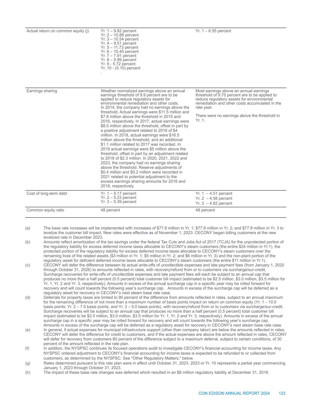 Actual return on common equity (j) Yr. 1 – 9.82 percent Yr. 2 – 10.88 percent Yr. 3 – 10.54 percent Yr. 4 – 9.51 percent Yr. 5 – 11.73 percent Yr. 6 – 10.45 percent Yr. 7 – 7.91 percent Yr. 8 – 5.99 percent Yr. 9 - 5.72 percent Yr. 10 - (0.10) percent . Yr. 1 – 6.55 percent Earnings sharing Weather normalized earnings above an annual earnings threshold of 9.9 percent are to be applied to reduce regulatory assets for environmental remediation and other costs. In 2014, the company had no earnings above the threshold. Actual earnings were $11.5 million and $7.8 million above the threshold in 2015 and 2016, respectively. In 2017, actual earnings were $8.5 million above the threshold, offset in part by a positive adjustment related to 2016 of $4 million. In 2018, actual earnings were $16.5 million above the threshold, and an additional $1.1 million related to 2017 was recorded. In 2019 actual earnings were $5 million above the threshold, offset in part by an adjustment related to 2018 of $2.3 million. In 2020, 2021, 2022 and 2023, the company had no earnings sharing above the threshold. Reserve adjustments of $0.4 million and $0.2 million were recorded in 2021 related to potential adjustment to the excess earnings sharing amounts for 2016 and 2018, respectively. Most earnings above an annual earnings threshold of 9.75 percent are to be applied to reduce regulatory assets for environmental remediation and other costs accumulated in the rate year. There were no earnings above the threshold in Yr. 1. Cost of long-term debt Yr. 1 – 5.17 percent Yr. 2 – 5.23 percent Yr. 3 – 5.39 percent Yr. 1 – 4.51 percent Yr. 2 – 4.58 percent Yr. 3 – 4.62 percent Common equity ratio 48 percent 48 percent (a) The base rate increases will be implemented with increases of $77.8 million in Yr. 1; $77.8 million in Yr. 2; and $77.8 million in Yr. 3 to levelize the customer bill impact. New rates were effective as of November 1, 2023. CECONY began billing customers at the new levelized rate in December 2023. (b) Amounts reflect amortization of the tax savings under the federal Tax Cuts and Jobs Act of 2017 (TCJA) for the unprotected portion of the regulatory liability for excess deferred income taxes allocable to CECONY’s steam customers (the entire $24 million in Yr.1), the protected portion of the regulatory liability for excess deferred income taxes allocable to CECONY’s steam customers over the remaining lives of the related assets ($3 million in Yr. 1; $5 million in Yr. 2; and $6 million in Yr. 3) and the non-plant portion of the regulatory asset for deficient deferred income taxes allocable to CECONY’s steam customers (the entire $11 million in Yr.1). (c) CECONY will defer the difference between its actual write-offs of uncollectible expenses and late payment fees (from January 1, 2020 through October 31, 2026) to amounts reflected in rates, with recovery/refund from or to customers via surcharge/sur-credit. Surcharge recoveries for write-offs of uncollectible expenses and late payment fees will each be subject to an annual cap that produces no more than a half percent (0.5 percent) total customer bill impact (estimated to be $2.5 million, $3.0 million, $3.5 million for Yr. 1, Yr. 2 and Yr. 3, respectively). Amounts in excess of the annual surcharge cap in a specific year may be rolled forward for recovery and will count towards the following year’s surcharge cap. Amounts in excess of the surcharge cap will be deferred as a regulatory asset for recovery in CECONY’s next steam base rate case. (d) Deferrals for property taxes are limited to 90 percent of the difference from amounts reflected in rates, subject to an annual maximum for the remaining difference of not more than a maximum number of basis points impact on return on common equity (Yr. 1 – 10.0 basis points; Yr. 2 – 7.5 basis points; and Yr. 3 – 5.0 basis points), with recovery/refund from or to customers via surcharge/sur-credit. Surcharge recoveries will be subject to an annual cap that produces no more than a half percent (0.5 percent) total customer bill impact (estimated to be $2.5 million, $3.0 million, $3.5 million for Yr. 1, Yr. 2 and Yr. 3, respectively). Amounts in excess of the annual surcharge cap in a specific year may be rolled forward for recovery and will count towards the following year’s surcharge cap. Amounts in excess of the surcharge cap will be deferred as a regulatory asset for recovery in CECONY’s next steam base rate case. (e) In general, if actual expenses for municipal infrastructure support (other than company labor) are below the amounts reflected in rates, CECONY will defer the difference for credit to customers, and if the actual expenses are above the amount reflected in rates, CECONY will defer for recovery from customers 80 percent of the difference subject to a maximum deferral, subject to certain conditions, of 30 percent of the amount reflected in the rate plan. (f) In addition, the NYSPSC continues its focused operations audit to investigate CECONY's financial accounting for income taxes. Any NYSPSC ordered adjustment to CECONY’s financial accounting for income taxes is expected to be refunded to or collected from customers, as determined by the NYSPSC. See "Other Regulatory Matters," below. (g) Rates determined pursuant to this rate plan were in effect until October 31, 2023. 2023 or Yr. 10 represents a partial year commencing January 1, 2023 through October 31, 2023. (h) The impact of these base rate changes was deferred which resulted in an $8 million regulatory liability at December 31, 2016. CON EDISON ANNUAL REPORT 2024 123