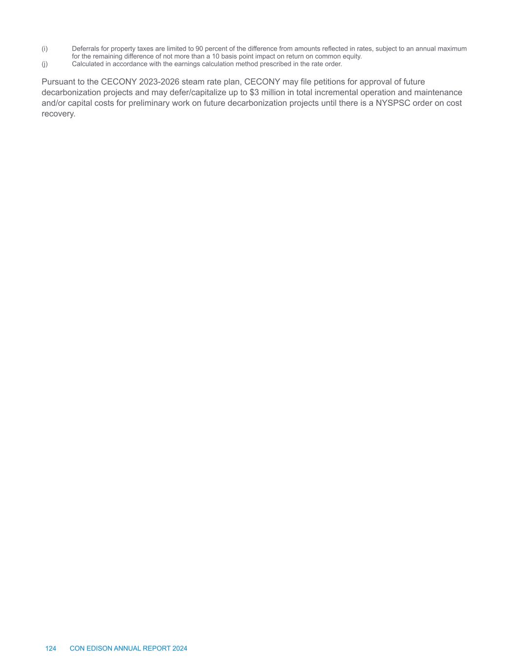 (i) Deferrals for property taxes are limited to 90 percent of the difference from amounts reflected in rates, subject to an annual maximum for the remaining difference of not more than a 10 basis point impact on return on common equity. (j) Calculated in accordance with the earnings calculation method prescribed in the rate order. Pursuant to the CECONY 2023-2026 steam rate plan, CECONY may file petitions for approval of future decarbonization projects and may defer/capitalize up to $3 million in total incremental operation and maintenance and/or capital costs for preliminary work on future decarbonization projects until there is a NYSPSC order on cost recovery. 124 CON EDISON ANNUAL REPORT 2024