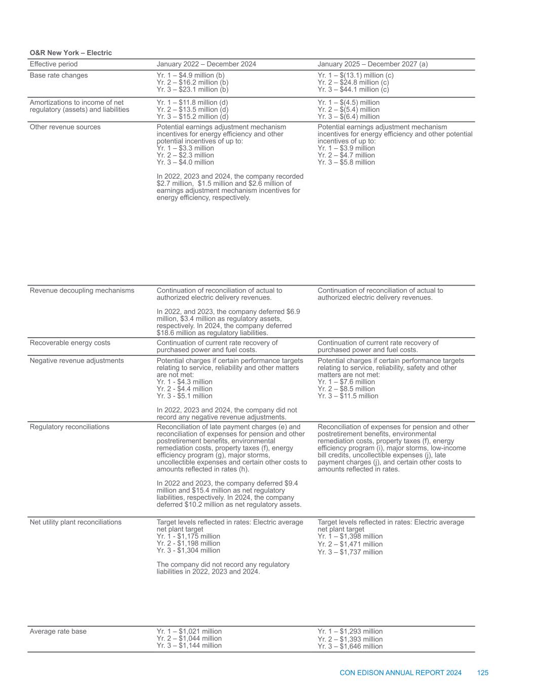 O&R New York – Electric Effective period January 2022 – December 2024 January 2025 – December 2027 (a) Base rate changes Yr. 1 – $4.9 million (b) Yr. 2 – $16.2 million (b) Yr. 3 – $23.1 million (b) Yr. 1 – $(13.1) million (c) Yr. 2 – $24.8 million (c) Yr. 3 – $44.1 million (c) Amortizations to income of net regulatory (assets) and liabilities Yr. 1 – $11.8 million (d) Yr. 2 – $13.5 million (d) Yr. 3 – $15.2 million (d) Yr. 1 – $(4.5) million Yr. 2 – $(5.4) million Yr. 3 – $(6.4) million Other revenue sources Potential earnings adjustment mechanism incentives for energy efficiency and other potential incentives of up to: Yr. 1 – $3.3 million Yr. 2 – $2.3 million Yr. 3 – $4.0 million In 2022, 2023 and 2024, the company recorded $2.7 million, $1.5 million and $2.6 million of earnings adjustment mechanism incentives for energy efficiency, respectively. Potential earnings adjustment mechanism incentives for energy efficiency and other potential incentives of up to: Yr. 1 – $3.9 million Yr. 2 – $4.7 million Yr. 3 – $5.8 million Revenue decoupling mechanisms Continuation of reconciliation of actual to authorized electric delivery revenues. In 2022, and 2023, the company deferred $6.9 million, $3.4 million as regulatory assets, respectively. In 2024, the company deferred $18.6 million as regulatory liabilities. Continuation of reconciliation of actual to authorized electric delivery revenues. Recoverable energy costs Continuation of current rate recovery of purchased power and fuel costs. Continuation of current rate recovery of purchased power and fuel costs. Negative revenue adjustments Potential charges if certain performance targets relating to service, reliability and other matters are not met: Yr. 1 - $4.3 million Yr. 2 - $4.4 million Yr. 3 - $5.1 million In 2022, 2023 and 2024, the company did not record any negative revenue adjustments. Potential charges if certain performance targets relating to service, reliability, safety and other matters are not met: Yr. 1 – $7.6 million Yr. 2 – $8.5 million Yr. 3 – $11.5 million Regulatory reconciliations Reconciliation of late payment charges (e) and reconciliation of expenses for pension and other postretirement benefits, environmental remediation costs, property taxes (f), energy efficiency program (g), major storms, uncollectible expenses and certain other costs to amounts reflected in rates (h). In 2022 and 2023, the company deferred $9.4 million and $15.4 million as net regulatory liabilities, respectively. In 2024, the company deferred $10.2 million as net regulatory assets. Reconciliation of expenses for pension and other postretirement benefits, environmental remediation costs, property taxes (f), energy efficiency program (i), major storms, low-income bill credits, uncollectible expenses (j), late payment charges (j), and certain other costs to amounts reflected in rates. Net utility plant reconciliations Target levels reflected in rates: Electric average net plant target Yr. 1 - $1,175 million Yr. 2 - $1,198 million Yr. 3 - $1,304 million The company did not record any regulatory liabilities in 2022, 2023 and 2024. Target levels reflected in rates: Electric average net plant target Yr. 1 – $1,398 million Yr. 2 – $1,471 million Yr. 3 – $1,737 million Average rate base Yr. 1 – $1,021 million Yr. 2 – $1,044 million Yr. 3 – $1,144 million Yr. 1 – $1,293 million Yr. 2 – $1,393 million Yr. 3 – $1,646 million CON EDISON ANNUAL REPORT 2024 125