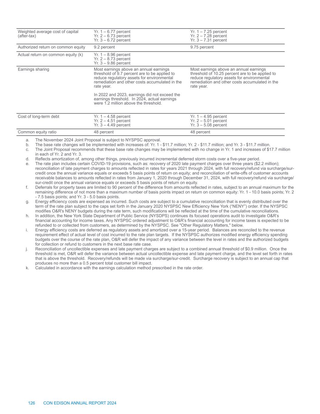 Weighted average cost of capital (after-tax) Yr. 1 – 6.77 percent Yr. 2 – 6.73 percent Yr. 3 – 6.72 percent Yr. 1 – 7.25 percent Yr. 2 – 7.28 percent Yr. 3 – 7.31 percent Authorized return on common equity 9.2 percent 9.75 percent Actual return on common equity (k) Yr. 1 – 8.96 percent Yr. 2 – 8.73 percent Yr. 3 – 9.86 percent Earnings sharing Most earnings above an annual earnings threshold of 9.7 percent are to be applied to reduce regulatory assets for environmental remediation and other costs accumulated in the rate year. In 2022 and 2023, earnings did not exceed the earnings threshold. In 2024, actual earnings were 1.2 million above the threshold. Most earnings above an annual earnings threshold of 10.25 percent are to be applied to reduce regulatory assets for environmental remediation and other costs accumulated in the rate year. Cost of long-term debt Yr. 1 – 4.58 percent Yr. 2 – 4.51 percent Yr. 3 – 4.49 percent Yr. 1 – 4.95 percent Yr. 2 – 5.01 percent Yr. 3 – 5.08 percent Common equity ratio 48 percent 48 percent a. The November 2024 Joint Proposal is subject to NYSPSC approval. b. The base rate changes will be implemented with increases of: Yr. 1 - $11.7 million; Yr. 2 - $11.7 million; and Yr. 3 - $11.7 million. c. The Joint Proposal recommends that these base rate changes may be implemented with no change in Yr. 1 and increases of $17.7 million in each of Yr. 2 and Yr. 3. d. Reflects amortization of, among other things, previously incurred incremental deferred storm costs over a five-year period. e. The rate plan includes certain COVID-19 provisions, such as: recovery of 2020 late payment charges over three years ($2.2 million); reconciliation of late payment charges to amounts reflected in rates for years 2021 through 2024, with full recovery/refund via surcharge/sur- credit once the annual variance equals or exceeds 5 basis points of return on equity; and reconciliation of write-offs of customer accounts receivable balances to amounts reflected in rates from January 1, 2020 through December 31, 2024, with full recovery/refund via surcharge/ sur-credit once the annual variance equals or exceeds 5 basis points of return on equity. f. Deferrals for property taxes are limited to 90 percent of the difference from amounts reflected in rates, subject to an annual maximum for the remaining difference of not more than a maximum number of basis points impact on return on common equity: Yr. 1 - 10.0 basis points; Yr. 2 - 7.5 basis points; and Yr. 3 - 5.0 basis points. g. Energy efficiency costs are expensed as incurred. Such costs are subject to a cumulative reconciliation that is evenly distributed over the term of the rate plan subject to the caps set forth in the January 2020 NYSPSC New Efficiency New York (“NENY”) order. If the NYSPSC modifies O&R's NENY budgets during the rate term, such modifications will be reflected at the time of the cumulative reconciliations. h. In addition, the New York State Department of Public Service (NYSDPS) continues its focused operations audit to investigate O&R’s financial accounting for income taxes. Any NYSPSC ordered adjustment to O&R’s financial accounting for income taxes is expected to be refunded to or collected from customers, as determined by the NYSPSC. See "Other Regulatory Matters," below. i. Energy efficiency costs are deferred as regulatory assets and amortized over a 15-year period. Balances are reconciled to the revenue requirement effect of actual level of cost incurred to the rate plan targets. If the NYSPSC authorizes modified energy efficiency spending budgets over the course of the rate plan, O&R will defer the impact of any variance between the level in rates and the authorized budgets for collection or refund to customers in the next base rate case. j. Reconciliation of uncollectible expenses and late payment charges are subject to a combined annual threshold of $0.9 million. Once the threshold is met, O&R will defer the variance between actual uncollectible expense and late payment charge, and the level set forth in rates that is above the threshold. Recovery/refunds will be made via surcharge/sur-credit. Surcharge recovery is subject to an annual cap that produces no more than a 0.5 percent total customer bill impact. k. Calculated in accordance with the earnings calculation method prescribed in the rate order. 126 CON EDISON ANNUAL REPORT 2024