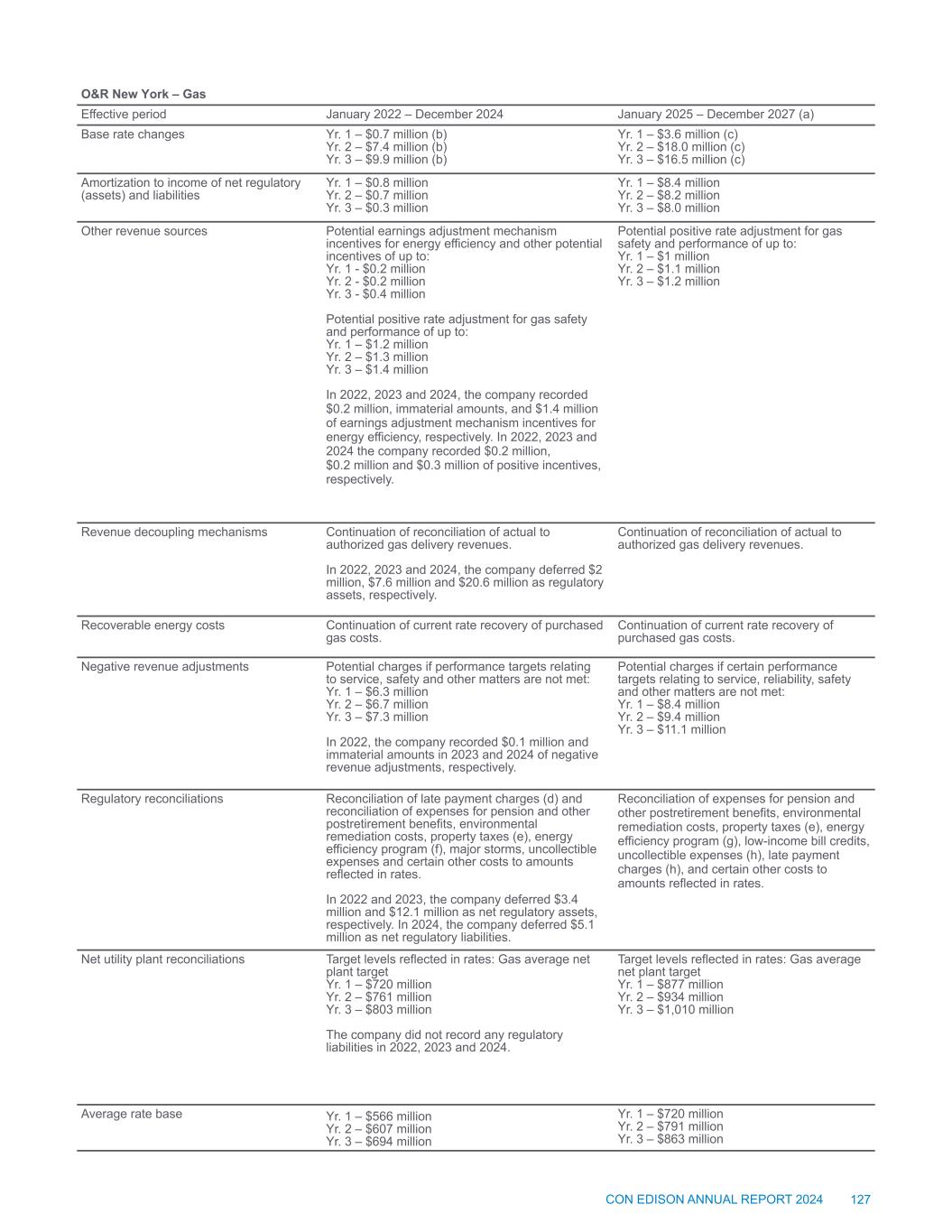 O&R New York – Gas Effective period January 2022 – December 2024 January 2025 – December 2027 (a) Base rate changes Yr. 1 – $0.7 million (b) Yr. 2 – $7.4 million (b) Yr. 3 – $9.9 million (b) Yr. 1 – $3.6 million (c) Yr. 2 – $18.0 million (c) Yr. 3 – $16.5 million (c) Amortization to income of net regulatory (assets) and liabilities Yr. 1 – $0.8 million Yr. 2 – $0.7 million Yr. 3 – $0.3 million Yr. 1 – $8.4 million Yr. 2 – $8.2 million Yr. 3 – $8.0 million Other revenue sources Potential earnings adjustment mechanism incentives for energy efficiency and other potential incentives of up to: Yr. 1 - $0.2 million Yr. 2 - $0.2 million Yr. 3 - $0.4 million Potential positive rate adjustment for gas safety and performance of up to: Yr. 1 – $1.2 million Yr. 2 – $1.3 million Yr. 3 – $1.4 million In 2022, 2023 and 2024, the company recorded $0.2 million, immaterial amounts, and $1.4 million of earnings adjustment mechanism incentives for energy efficiency, respectively. In 2022, 2023 and 2024 the company recorded $0.2 million, $0.2 million and $0.3 million of positive incentives, respectively. Potential positive rate adjustment for gas safety and performance of up to: Yr. 1 – $1 million Yr. 2 – $1.1 million Yr. 3 – $1.2 million Revenue decoupling mechanisms Continuation of reconciliation of actual to authorized gas delivery revenues. In 2022, 2023 and 2024, the company deferred $2 million, $7.6 million and $20.6 million as regulatory assets, respectively. Continuation of reconciliation of actual to authorized gas delivery revenues. Recoverable energy costs Continuation of current rate recovery of purchased gas costs. Continuation of current rate recovery of purchased gas costs. Negative revenue adjustments Potential charges if performance targets relating to service, safety and other matters are not met: Yr. 1 – $6.3 million Yr. 2 – $6.7 million Yr. 3 – $7.3 million In 2022, the company recorded $0.1 million and immaterial amounts in 2023 and 2024 of negative revenue adjustments, respectively. Potential charges if certain performance targets relating to service, reliability, safety and other matters are not met: Yr. 1 – $8.4 million Yr. 2 – $9.4 million Yr. 3 – $11.1 million Regulatory reconciliations Reconciliation of late payment charges (d) and reconciliation of expenses for pension and other postretirement benefits, environmental remediation costs, property taxes (e), energy efficiency program (f), major storms, uncollectible expenses and certain other costs to amounts reflected in rates. In 2022 and 2023, the company deferred $3.4 million and $12.1 million as net regulatory assets, respectively. In 2024, the company deferred $5.1 million as net regulatory liabilities. Reconciliation of expenses for pension and other postretirement benefits, environmental remediation costs, property taxes (e), energy efficiency program (g), low-income bill credits, uncollectible expenses (h), late payment charges (h), and certain other costs to amounts reflected in rates. Net utility plant reconciliations Target levels reflected in rates: Gas average net plant target Yr. 1 – $720 million Yr. 2 – $761 million Yr. 3 – $803 million The company did not record any regulatory liabilities in 2022, 2023 and 2024. Target levels reflected in rates: Gas average net plant target Yr. 1 – $877 million Yr. 2 – $934 million Yr. 3 – $1,010 million Average rate base Yr. 1 – $566 million Yr. 2 – $607 million Yr. 3 – $694 million Yr. 1 – $720 million Yr. 2 – $791 million Yr. 3 – $863 million CON EDISON ANNUAL REPORT 2024 127