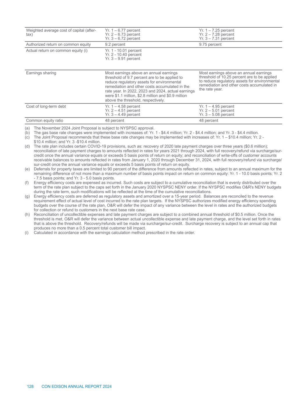 Weighted average cost of capital (after- tax) Yr. 1 – 6.77 percent Yr. 2 – 6.73 percent Yr. 3 – 6.72 percent Yr. 1 – 7.25 percent Yr. 2 – 7.28 percent Yr. 3 – 7.31 percent Authorized return on common equity 9.2 percent 9.75 percent Actual return on common equity (i) Yr. 1 - 10.01 percent Yr. 2 - 10.40 percent Yr. 3 – 9.91 percent Earnings sharing Most earnings above an annual earnings threshold of 9.7 percent are to be applied to reduce regulatory assets for environmental remediation and other costs accumulated in the rate year. In 2022, 2023 and 2024, actual earnings were $1.1 million, $2.8 million and $0.9 million above the threshold, respectively. Most earnings above an annual earnings threshold of 10.25 percent are to be applied to reduce regulatory assets for environmental remediation and other costs accumulated in the rate year. Cost of long-term debt Yr. 1 – 4.58 percent Yr. 2 – 4.51 percent Yr. 3 – 4.49 percent Yr. 1 – 4.95 percent Yr. 2 – 5.01 percent Yr. 3 – 5.08 percent Common equity ratio 48 percent 48 percent (a) The November 2024 Joint Proposal is subject to NYSPSC approval. (b) The gas base rate changes were implemented with increases of: Yr. 1 - $4.4 million; Yr. 2 - $4.4 million; and Yr. 3 - $4.4 million. (c) The Joint Proposal recommends that these base rate changes may be implemented with increases of: Yr. 1 – $10.4 million; Yr. 2 - $10.4 million; and Yr. 3 -$10.4 million. (d) The rate plan includes certain COVID-19 provisions, such as: recovery of 2020 late payment charges over three years ($0.6 million); reconciliation of late payment charges to amounts reflected in rates for years 2021 through 2024, with full recovery/refund via surcharge/sur- credit once the annual variance equals or exceeds 5 basis points of return on equity; and reconciliation of write-offs of customer accounts receivable balances to amounts reflected in rates from January 1, 2020 through December 31, 2024, with full recovery/refund via surcharge/ sur-credit once the annual variance equals or exceeds 5 basis points of return on equity. (e) Deferrals for property taxes are limited to 90 percent of the difference from amounts reflected in rates, subject to an annual maximum for the remaining difference of not more than a maximum number of basis points impact on return on common equity: Yr. 1 - 10.0 basis points; Yr. 2 - 7.5 basis points; and Yr. 3 - 5.0 basis points. (f) Energy efficiency costs are expensed as incurred. Such costs are subject to a cumulative reconciliation that is evenly distributed over the term of the rate plan subject to the caps set forth in the January 2020 NYSPSC NENY order. If the NYSPSC modifies O&R's NENY budgets during the rate term, such modifications will be reflected at the time of the cumulative reconciliations. (g) Energy efficiency costs are deferred as regulatory assets and amortized over a 15-year period. Balances are reconciled to the revenue requirement effect of actual level of cost incurred to the rate plan targets. If the NYSPSC authorizes modified energy efficiency spending budgets over the course of the rate plan, O&R will defer the impact of any variance between the level in rates and the authorized budgets for collection or refund to customers in the next base rate case. (h) Reconciliation of uncollectible expenses and late payment charges are subject to a combined annual threshold of $0.5 million. Once the threshold is met, O&R will defer the variance between actual uncollectible expense and late payment charge, and the level set forth in rates that is above the threshold. Recovery/refunds will be made via surcharge/sur-credit. Surcharge recovery is subject to an annual cap that produces no more than a 0.5 percent total customer bill impact. (i) Calculated in accordance with the earnings calculation method prescribed in the rate order. 128 CON EDISON ANNUAL REPORT 2024