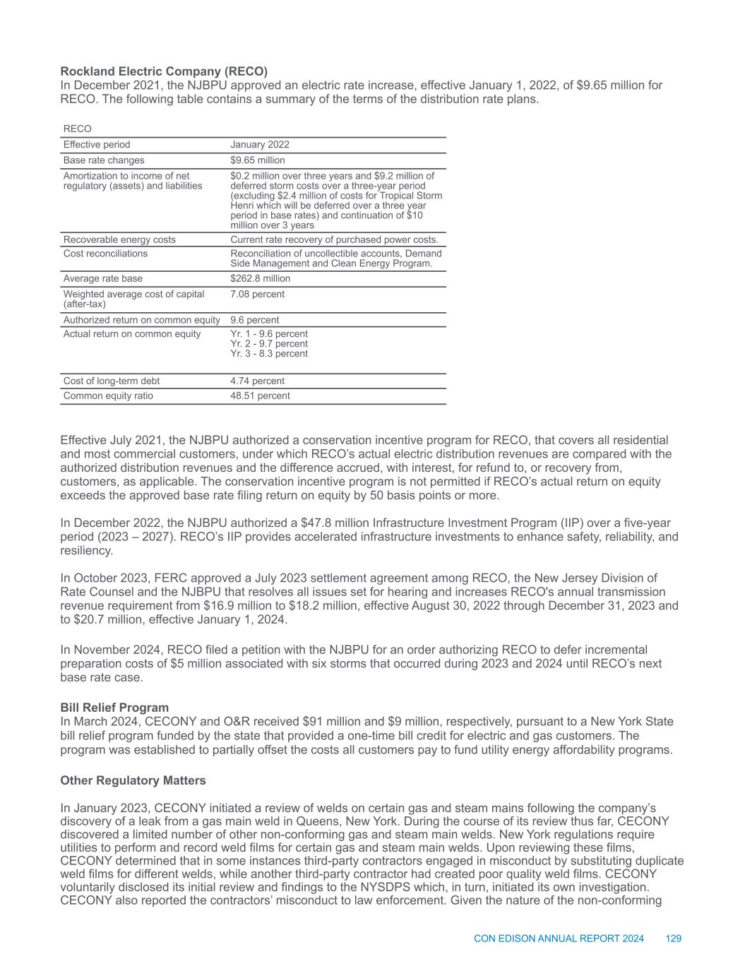 Rockland Electric Company (RECO) In December 2021, the NJBPU approved an electric rate increase, effective January 1, 2022, of $9.65 million for RECO. The following table contains a summary of the terms of the distribution rate plans. RECO Effective period January 2022 Base rate changes $9.65 million Amortization to income of net regulatory (assets) and liabilities $0.2 million over three years and $9.2 million of deferred storm costs over a three-year period (excluding $2.4 million of costs for Tropical Storm Henri which will be deferred over a three year period in base rates) and continuation of $10 million over 3 years Recoverable energy costs Current rate recovery of purchased power costs. Cost reconciliations Reconciliation of uncollectible accounts, Demand Side Management and Clean Energy Program. Average rate base $262.8 million Weighted average cost of capital (after-tax) 7.08 percent Authorized return on common equity 9.6 percent Actual return on common equity Yr. 1 - 9.6 percent Yr. 2 - 9.7 percent Yr. 3 - 8.3 percent Cost of long-term debt 4.74 percent Common equity ratio 48.51 percent Effective July 2021, the NJBPU authorized a conservation incentive program for RECO, that covers all residential and most commercial customers, under which RECO’s actual electric distribution revenues are compared with the authorized distribution revenues and the difference accrued, with interest, for refund to, or recovery from, customers, as applicable. The conservation incentive program is not permitted if RECO’s actual return on equity exceeds the approved base rate filing return on equity by 50 basis points or more. In December 2022, the NJBPU authorized a $47.8 million Infrastructure Investment Program (IIP) over a five-year period (2023 – 2027). RECO’s IIP provides accelerated infrastructure investments to enhance safety, reliability, and resiliency. In October 2023, FERC approved a July 2023 settlement agreement among RECO, the New Jersey Division of Rate Counsel and the NJBPU that resolves all issues set for hearing and increases RECO's annual transmission revenue requirement from $16.9 million to $18.2 million, effective August 30, 2022 through December 31, 2023 and to $20.7 million, effective January 1, 2024. In November 2024, RECO filed a petition with the NJBPU for an order authorizing RECO to defer incremental preparation costs of $5 million associated with six storms that occurred during 2023 and 2024 until RECO’s next base rate case. Bill Relief Program In March 2024, CECONY and O&R received $91 million and $9 million, respectively, pursuant to a New York State bill relief program funded by the state that provided a one-time bill credit for electric and gas customers. The program was established to partially offset the costs all customers pay to fund utility energy affordability programs. Other Regulatory Matters In January 2023, CECONY initiated a review of welds on certain gas and steam mains following the company’s discovery of a leak from a gas main weld in Queens, New York. During the course of its review thus far, CECONY discovered a limited number of other non-conforming gas and steam main welds. New York regulations require utilities to perform and record weld films for certain gas and steam main welds. Upon reviewing these films, CECONY determined that in some instances third-party contractors engaged in misconduct by substituting duplicate weld films for different welds, while another third-party contractor had created poor quality weld films. CECONY voluntarily disclosed its initial review and findings to the NYSDPS which, in turn, initiated its own investigation. CECONY also reported the contractors’ misconduct to law enforcement. Given the nature of the non-conforming CON EDISON ANNUAL REPORT 2024 129