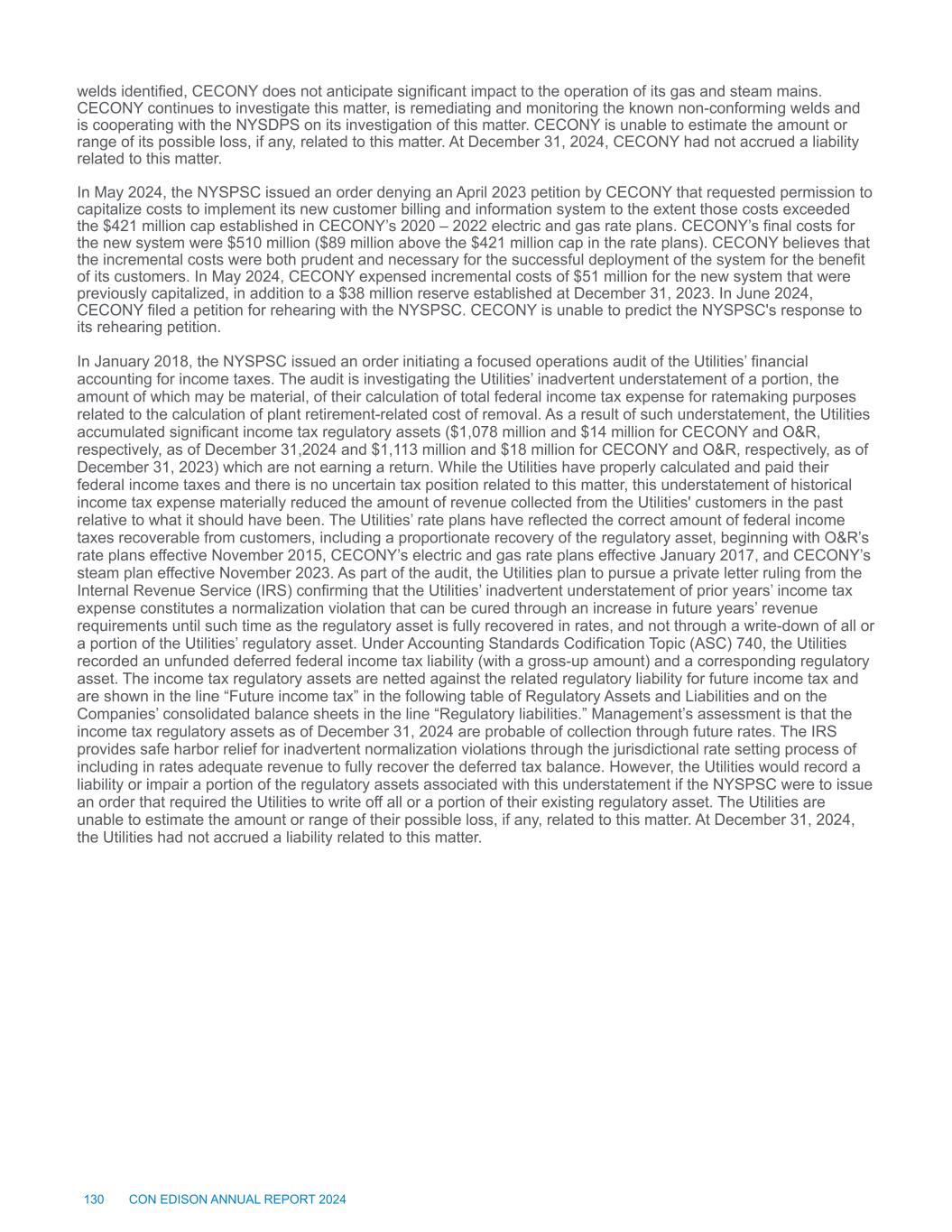 welds identified, CECONY does not anticipate significant impact to the operation of its gas and steam mains. CECONY continues to investigate this matter, is remediating and monitoring the known non-conforming welds and is cooperating with the NYSDPS on its investigation of this matter. CECONY is unable to estimate the amount or range of its possible loss, if any, related to this matter. At December 31, 2024, CECONY had not accrued a liability related to this matter. In May 2024, the NYSPSC issued an order denying an April 2023 petition by CECONY that requested permission to capitalize costs to implement its new customer billing and information system to the extent those costs exceeded the $421 million cap established in CECONY’s 2020 – 2022 electric and gas rate plans. CECONY’s final costs for the new system were $510 million ($89 million above the $421 million cap in the rate plans). CECONY believes that the incremental costs were both prudent and necessary for the successful deployment of the system for the benefit of its customers. In May 2024, CECONY expensed incremental costs of $51 million for the new system that were previously capitalized, in addition to a $38 million reserve established at December 31, 2023. In June 2024, CECONY filed a petition for rehearing with the NYSPSC. CECONY is unable to predict the NYSPSC's response to its rehearing petition. In January 2018, the NYSPSC issued an order initiating a focused operations audit of the Utilities’ financial accounting for income taxes. The audit is investigating the Utilities’ inadvertent understatement of a portion, the amount of which may be material, of their calculation of total federal income tax expense for ratemaking purposes related to the calculation of plant retirement-related cost of removal. As a result of such understatement, the Utilities accumulated significant income tax regulatory assets ($1,078 million and $14 million for CECONY and O&R, respectively, as of December 31,2024 and $1,113 million and $18 million for CECONY and O&R, respectively, as of December 31, 2023) which are not earning a return. While the Utilities have properly calculated and paid their federal income taxes and there is no uncertain tax position related to this matter, this understatement of historical income tax expense materially reduced the amount of revenue collected from the Utilities' customers in the past relative to what it should have been. The Utilities’ rate plans have reflected the correct amount of federal income taxes recoverable from customers, including a proportionate recovery of the regulatory asset, beginning with O&R’s rate plans effective November 2015, CECONY’s electric and gas rate plans effective January 2017, and CECONY’s steam plan effective November 2023. As part of the audit, the Utilities plan to pursue a private letter ruling from the Internal Revenue Service (IRS) confirming that the Utilities’ inadvertent understatement of prior years’ income tax expense constitutes a normalization violation that can be cured through an increase in future years’ revenue requirements until such time as the regulatory asset is fully recovered in rates, and not through a write-down of all or a portion of the Utilities’ regulatory asset. Under Accounting Standards Codification Topic (ASC) 740, the Utilities recorded an unfunded deferred federal income tax liability (with a gross-up amount) and a corresponding regulatory asset. The income tax regulatory assets are netted against the related regulatory liability for future income tax and are shown in the line “Future income tax” in the following table of Regulatory Assets and Liabilities and on the Companies’ consolidated balance sheets in the line “Regulatory liabilities.” Management’s assessment is that the income tax regulatory assets as of December 31, 2024 are probable of collection through future rates. The IRS provides safe harbor relief for inadvertent normalization violations through the jurisdictional rate setting process of including in rates adequate revenue to fully recover the deferred tax balance. However, the Utilities would record a liability or impair a portion of the regulatory assets associated with this understatement if the NYSPSC were to issue an order that required the Utilities to write off all or a portion of their existing regulatory asset. The Utilities are unable to estimate the amount or range of their possible loss, if any, related to this matter. At December 31, 2024, the Utilities had not accrued a liability related to this matter. 130 CON EDISON ANNUAL REPORT 2024