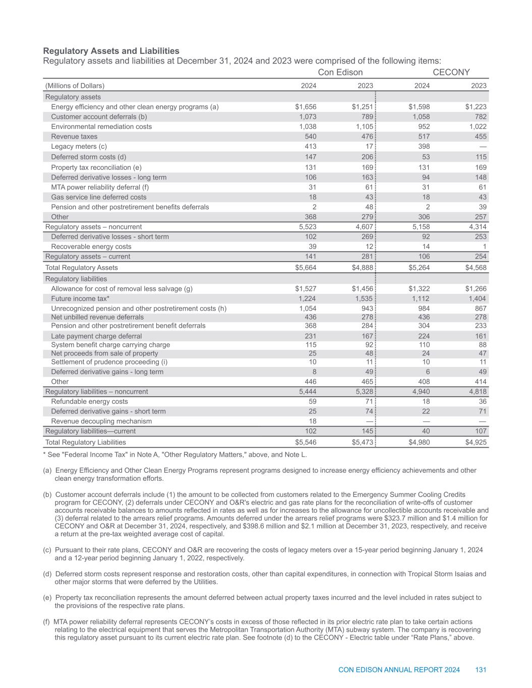 Regulatory Assets and Liabilities Regulatory assets and liabilities at December 31, 2024 and 2023 were comprised of the following items: Con Edison CECONY (Millions of Dollars) 2024 2023 2024 2023 Regulatory assets Energy efficiency and other clean energy programs (a) $1,656 $1,251 $1,598 $1,223 Customer account deferrals (b) 1,073 789 1,058 782 Environmental remediation costs 1,038 1,105 952 1,022 Revenue taxes 540 476 517 455 Legacy meters (c) 413 17 398 — Deferred storm costs (d) 147 206 53 115 Property tax reconciliation (e) 131 169 131 169 Deferred derivative losses - long term 106 163 94 148 MTA power reliability deferral (f) 31 61 31 61 Gas service line deferred costs 18 43 18 43 Pension and other postretirement benefits deferrals 2 48 2 39 Other 368 279 306 257 Regulatory assets – noncurrent 5,523 4,607 5,158 4,314 Deferred derivative losses - short term 102 269 92 253 Recoverable energy costs 39 12 14 1 Regulatory assets – current 141 281 106 254 Total Regulatory Assets $5,664 $4,888 $5,264 $4,568 Regulatory liabilities Allowance for cost of removal less salvage (g) $1,527 $1,456 $1,322 $1,266 Future income tax* 1,224 1,535 1,112 1,404 Unrecognized pension and other postretirement costs (h) 1,054 943 984 867 Net unbilled revenue deferrals 436 278 436 278 Pension and other postretirement benefit deferrals 368 284 304 233 Late payment charge deferral 231 167 224 161 System benefit charge carrying charge 115 92 110 88 Net proceeds from sale of property 25 48 24 47 Settlement of prudence proceeding (i) 10 11 10 11 Deferred derivative gains - long term 8 49 6 49 Other 446 465 408 414 Regulatory liabilities – noncurrent 5,444 5,328 4,940 4,818 Refundable energy costs 59 71 18 36 Deferred derivative gains - short term 25 74 22 71 Revenue decoupling mechanism 18 — — — Regulatory liabilities—current 102 145 40 107 Total Regulatory Liabilities $5,546 $5,473 $4,980 $4,925 * See "Federal Income Tax" in Note A, "Other Regulatory Matters," above, and Note L. (a) Energy Efficiency and Other Clean Energy Programs represent programs designed to increase energy efficiency achievements and other clean energy transformation efforts. (b) Customer account deferrals include (1) the amount to be collected from customers related to the Emergency Summer Cooling Credits program for CECONY, (2) deferrals under CECONY and O&R's electric and gas rate plans for the reconciliation of write-offs of customer accounts receivable balances to amounts reflected in rates as well as for increases to the allowance for uncollectible accounts receivable and (3) deferral related to the arrears relief programs. Amounts deferred under the arrears relief programs were $323.7 million and $1.4 million for CECONY and O&R at December 31, 2024, respectively, and $398.6 million and $2.1 million at December 31, 2023, respectively, and receive a return at the pre-tax weighted average cost of capital. (c) Pursuant to their rate plans, CECONY and O&R are recovering the costs of legacy meters over a 15-year period beginning January 1, 2024 and a 12-year period beginning January 1, 2022, respectively. (d) Deferred storm costs represent response and restoration costs, other than capital expenditures, in connection with Tropical Storm Isaias and other major storms that were deferred by the Utilities. (e) Property tax reconciliation represents the amount deferred between actual property taxes incurred and the level included in rates subject to the provisions of the respective rate plans. (f) MTA power reliability deferral represents CECONY’s costs in excess of those reflected in its prior electric rate plan to take certain actions relating to the electrical equipment that serves the Metropolitan Transportation Authority (MTA) subway system. The company is recovering this regulatory asset pursuant to its current electric rate plan. See footnote (d) to the CECONY - Electric table under “Rate Plans,” above. CON EDISON ANNUAL REPORT 2024 131