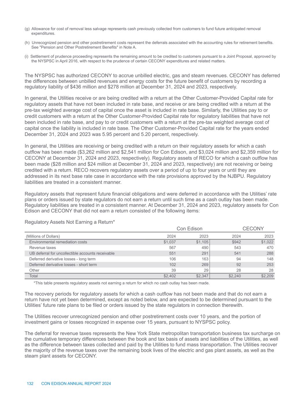 (g) Allowance for cost of removal less salvage represents cash previously collected from customers to fund future anticipated removal expenditures. (h) Unrecognized pension and other postretirement costs represent the deferrals associated with the accounting rules for retirement benefits. See "Pension and Other Postretirement Benefits" in Note A. (i) Settlement of prudence proceeding represents the remaining amount to be credited to customers pursuant to a Joint Proposal, approved by the NYSPSC in April 2016, with respect to the prudence of certain CECONY expenditures and related matters. The NYSPSC has authorized CECONY to accrue unbilled electric, gas and steam revenues. CECONY has deferred the differences between unbilled revenues and energy costs for the future benefit of customers by recording a regulatory liability of $436 million and $278 million at December 31, 2024 and 2023, respectively. In general, the Utilities receive or are being credited with a return at the Other Customer-Provided Capital rate for regulatory assets that have not been included in rate base, and receive or are being credited with a return at the pre-tax weighted average cost of capital once the asset is included in rate base. Similarly, the Utilities pay to or credit customers with a return at the Other Customer-Provided Capital rate for regulatory liabilities that have not been included in rate base, and pay to or credit customers with a return at the pre-tax weighted average cost of capital once the liability is included in rate base. The Other Customer-Provided Capital rate for the years ended December 31, 2024 and 2023 was 5.95 percent and 5.20 percent, respectively. In general, the Utilities are receiving or being credited with a return on their regulatory assets for which a cash outflow has been made ($3,262 million and $2,541 million for Con Edison, and $3,024 million and $2,359 million for CECONY at December 31, 2024 and 2023, respectively). Regulatory assets of RECO for which a cash outflow has been made ($28 million and $24 million at December 31, 2024 and 2023, respectively) are not receiving or being credited with a return. RECO recovers regulatory assets over a period of up to four years or until they are addressed in its next base rate case in accordance with the rate provisions approved by the NJBPU. Regulatory liabilities are treated in a consistent manner. Regulatory assets that represent future financial obligations and were deferred in accordance with the Utilities’ rate plans or orders issued by state regulators do not earn a return until such time as a cash outlay has been made. Regulatory liabilities are treated in a consistent manner. At December 31, 2024 and 2023, regulatory assets for Con Edison and CECONY that did not earn a return consisted of the following items: Regulatory Assets Not Earning a Return* Con Edison CECONY (Millions of Dollars) 2024 2023 2024 2023 Environmental remediation costs $1,037 $1,105 $942 $1,022 Revenue taxes 567 490 543 470 UB deferral for uncollectible accounts receivable 551 291 541 288 Deferred derivative losses - long term 106 163 94 148 Deferred derivative losses - short term 102 269 92 253 Other 39 29 28 28 Total $2,402 $2,347 $2,240 $2,209 *This table presents regulatory assets not earning a return for which no cash outlay has been made. The recovery periods for regulatory assets for which a cash outflow has not been made and that do not earn a return have not yet been determined, except as noted below, and are expected to be determined pursuant to the Utilities’ future rate plans to be filed or orders issued by the state regulators in connection therewith. The Utilities recover unrecognized pension and other postretirement costs over 10 years, and the portion of investment gains or losses recognized in expense over 15 years, pursuant to NYSPSC policy. The deferral for revenue taxes represents the New York State metropolitan transportation business tax surcharge on the cumulative temporary differences between the book and tax basis of assets and liabilities of the Utilities, as well as the difference between taxes collected and paid by the Utilities to fund mass transportation. The Utilities recover the majority of the revenue taxes over the remaining book lives of the electric and gas plant assets, as well as the steam plant assets for CECONY. 132 CON EDISON ANNUAL REPORT 2024
