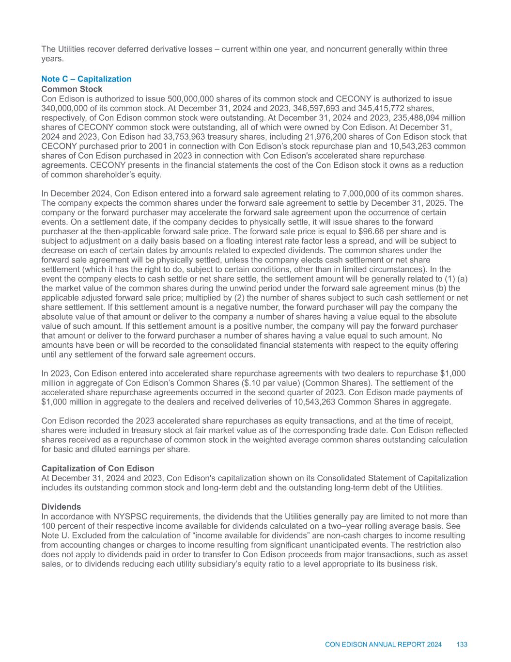 The Utilities recover deferred derivative losses – current within one year, and noncurrent generally within three years. Note C – Capitalization Common Stock Con Edison is authorized to issue 500,000,000 shares of its common stock and CECONY is authorized to issue 340,000,000 of its common stock. At December 31, 2024 and 2023, 346,597,693 and 345,415,772 shares, respectively, of Con Edison common stock were outstanding. At December 31, 2024 and 2023, 235,488,094 million shares of CECONY common stock were outstanding, all of which were owned by Con Edison. At December 31, 2024 and 2023, Con Edison had 33,753,963 treasury shares, including 21,976,200 shares of Con Edison stock that CECONY purchased prior to 2001 in connection with Con Edison’s stock repurchase plan and 10,543,263 common shares of Con Edison purchased in 2023 in connection with Con Edison's accelerated share repurchase agreements. CECONY presents in the financial statements the cost of the Con Edison stock it owns as a reduction of common shareholder’s equity. In December 2024, Con Edison entered into a forward sale agreement relating to 7,000,000 of its common shares. The company expects the common shares under the forward sale agreement to settle by December 31, 2025. The company or the forward purchaser may accelerate the forward sale agreement upon the occurrence of certain events. On a settlement date, if the company decides to physically settle, it will issue shares to the forward purchaser at the then-applicable forward sale price. The forward sale price is equal to $96.66 per share and is subject to adjustment on a daily basis based on a floating interest rate factor less a spread, and will be subject to decrease on each of certain dates by amounts related to expected dividends. The common shares under the forward sale agreement will be physically settled, unless the company elects cash settlement or net share settlement (which it has the right to do, subject to certain conditions, other than in limited circumstances). In the event the company elects to cash settle or net share settle, the settlement amount will be generally related to (1) (a) the market value of the common shares during the unwind period under the forward sale agreement minus (b) the applicable adjusted forward sale price; multiplied by (2) the number of shares subject to such cash settlement or net share settlement. If this settlement amount is a negative number, the forward purchaser will pay the company the absolute value of that amount or deliver to the company a number of shares having a value equal to the absolute value of such amount. If this settlement amount is a positive number, the company will pay the forward purchaser that amount or deliver to the forward purchaser a number of shares having a value equal to such amount. No amounts have been or will be recorded to the consolidated financial statements with respect to the equity offering until any settlement of the forward sale agreement occurs. In 2023, Con Edison entered into accelerated share repurchase agreements with two dealers to repurchase $1,000 million in aggregate of Con Edison’s Common Shares ($.10 par value) (Common Shares). The settlement of the accelerated share repurchase agreements occurred in the second quarter of 2023. Con Edison made payments of $1,000 million in aggregate to the dealers and received deliveries of 10,543,263 Common Shares in aggregate. Con Edison recorded the 2023 accelerated share repurchases as equity transactions, and at the time of receipt, shares were included in treasury stock at fair market value as of the corresponding trade date. Con Edison reflected shares received as a repurchase of common stock in the weighted average common shares outstanding calculation for basic and diluted earnings per share. Capitalization of Con Edison At December 31, 2024 and 2023, Con Edison's capitalization shown on its Consolidated Statement of Capitalization includes its outstanding common stock and long-term debt and the outstanding long-term debt of the Utilities. Dividends In accordance with NYSPSC requirements, the dividends that the Utilities generally pay are limited to not more than 100 percent of their respective income available for dividends calculated on a two–year rolling average basis. See Note U. Excluded from the calculation of “income available for dividends” are non-cash charges to income resulting from accounting changes or charges to income resulting from significant unanticipated events. The restriction also does not apply to dividends paid in order to transfer to Con Edison proceeds from major transactions, such as asset sales, or to dividends reducing each utility subsidiary’s equity ratio to a level appropriate to its business risk. CON EDISON ANNUAL REPORT 2024 133
