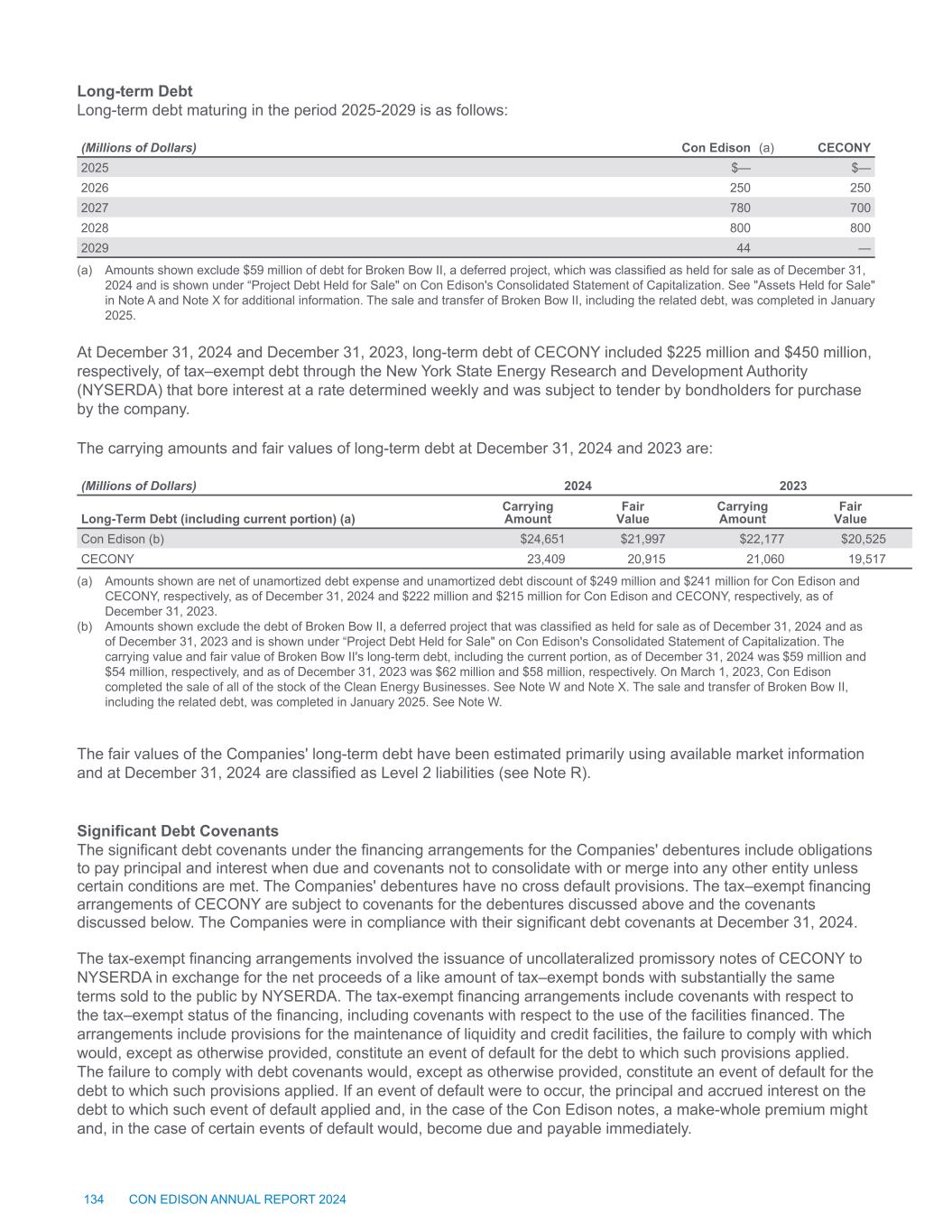 Long-term Debt Long-term debt maturing in the period 2025-2029 is as follows: (Millions of Dollars) Con Edison (a) CECONY 2025 $— $— 2026 250 250 2027 780 700 2028 800 800 2029 44 — (a) Amounts shown exclude $59 million of debt for Broken Bow II, a deferred project, which was classified as held for sale as of December 31, 2024 and is shown under “Project Debt Held for Sale" on Con Edison's Consolidated Statement of Capitalization. See "Assets Held for Sale" in Note A and Note X for additional information. The sale and transfer of Broken Bow II, including the related debt, was completed in January 2025. At December 31, 2024 and December 31, 2023, long-term debt of CECONY included $225 million and $450 million, respectively, of tax–exempt debt through the New York State Energy Research and Development Authority (NYSERDA) that bore interest at a rate determined weekly and was subject to tender by bondholders for purchase by the company. The carrying amounts and fair values of long-term debt at December 31, 2024 and 2023 are: (Millions of Dollars) 2024 2023 Long-Term Debt (including current portion) (a) Carrying Amount Fair Value Carrying Amount Fair Value Con Edison (b) $24,651 $21,997 $22,177 $20,525 CECONY 23,409 20,915 21,060 19,517 (a) Amounts shown are net of unamortized debt expense and unamortized debt discount of $249 million and $241 million for Con Edison and CECONY, respectively, as of December 31, 2024 and $222 million and $215 million for Con Edison and CECONY, respectively, as of December 31, 2023. (b) Amounts shown exclude the debt of Broken Bow II, a deferred project that was classified as held for sale as of December 31, 2024 and as of December 31, 2023 and is shown under “Project Debt Held for Sale" on Con Edison's Consolidated Statement of Capitalization. The carrying value and fair value of Broken Bow II's long-term debt, including the current portion, as of December 31, 2024 was $59 million and $54 million, respectively, and as of December 31, 2023 was $62 million and $58 million, respectively. On March 1, 2023, Con Edison completed the sale of all of the stock of the Clean Energy Businesses. See Note W and Note X. The sale and transfer of Broken Bow II, including the related debt, was completed in January 2025. See Note W. The fair values of the Companies' long-term debt have been estimated primarily using available market information and at December 31, 2024 are classified as Level 2 liabilities (see Note R). Significant Debt Covenants The significant debt covenants under the financing arrangements for the Companies' debentures include obligations to pay principal and interest when due and covenants not to consolidate with or merge into any other entity unless certain conditions are met. The Companies' debentures have no cross default provisions. The tax–exempt financing arrangements of CECONY are subject to covenants for the debentures discussed above and the covenants discussed below. The Companies were in compliance with their significant debt covenants at December 31, 2024. The tax-exempt financing arrangements involved the issuance of uncollateralized promissory notes of CECONY to NYSERDA in exchange for the net proceeds of a like amount of tax–exempt bonds with substantially the same terms sold to the public by NYSERDA. The tax-exempt financing arrangements include covenants with respect to the tax–exempt status of the financing, including covenants with respect to the use of the facilities financed. The arrangements include provisions for the maintenance of liquidity and credit facilities, the failure to comply with which would, except as otherwise provided, constitute an event of default for the debt to which such provisions applied. The failure to comply with debt covenants would, except as otherwise provided, constitute an event of default for the debt to which such provisions applied. If an event of default were to occur, the principal and accrued interest on the debt to which such event of default applied and, in the case of the Con Edison notes, a make-whole premium might and, in the case of certain events of default would, become due and payable immediately. 134 CON EDISON ANNUAL REPORT 2024