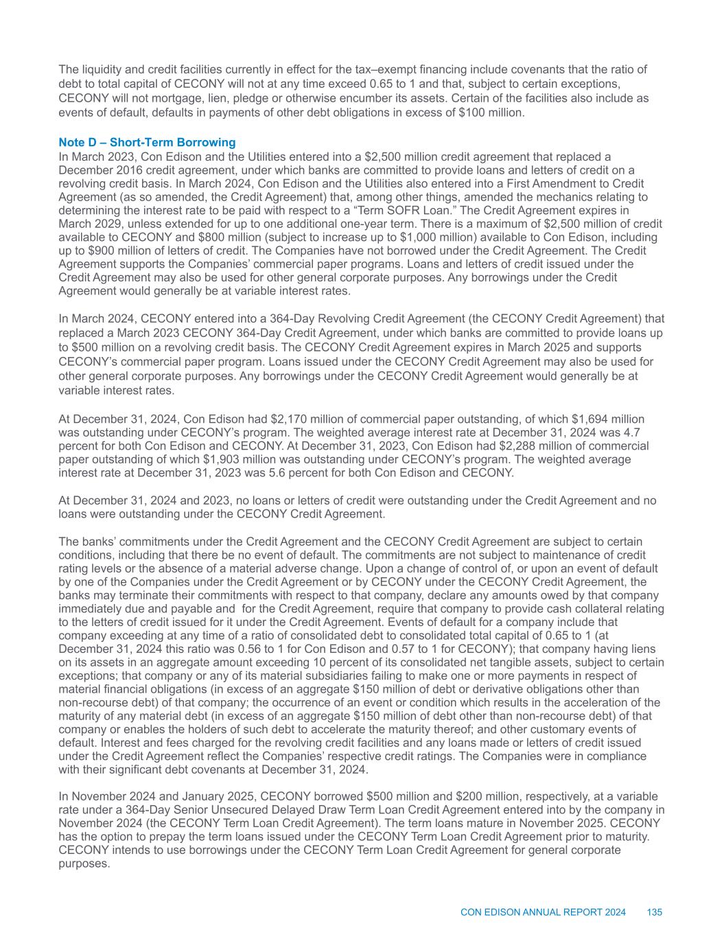 The liquidity and credit facilities currently in effect for the tax–exempt financing include covenants that the ratio of debt to total capital of CECONY will not at any time exceed 0.65 to 1 and that, subject to certain exceptions, CECONY will not mortgage, lien, pledge or otherwise encumber its assets. Certain of the facilities also include as events of default, defaults in payments of other debt obligations in excess of $100 million. Note D – Short-Term Borrowing In March 2023, Con Edison and the Utilities entered into a $2,500 million credit agreement that replaced a December 2016 credit agreement, under which banks are committed to provide loans and letters of credit on a revolving credit basis. In March 2024, Con Edison and the Utilities also entered into a First Amendment to Credit Agreement (as so amended, the Credit Agreement) that, among other things, amended the mechanics relating to determining the interest rate to be paid with respect to a “Term SOFR Loan.” The Credit Agreement expires in March 2029, unless extended for up to one additional one-year term. There is a maximum of $2,500 million of credit available to CECONY and $800 million (subject to increase up to $1,000 million) available to Con Edison, including up to $900 million of letters of credit. The Companies have not borrowed under the Credit Agreement. The Credit Agreement supports the Companies’ commercial paper programs. Loans and letters of credit issued under the Credit Agreement may also be used for other general corporate purposes. Any borrowings under the Credit Agreement would generally be at variable interest rates. In March 2024, CECONY entered into a 364-Day Revolving Credit Agreement (the CECONY Credit Agreement) that replaced a March 2023 CECONY 364-Day Credit Agreement, under which banks are committed to provide loans up to $500 million on a revolving credit basis. The CECONY Credit Agreement expires in March 2025 and supports CECONY’s commercial paper program. Loans issued under the CECONY Credit Agreement may also be used for other general corporate purposes. Any borrowings under the CECONY Credit Agreement would generally be at variable interest rates. At December 31, 2024, Con Edison had $2,170 million of commercial paper outstanding, of which $1,694 million was outstanding under CECONY’s program. The weighted average interest rate at December 31, 2024 was 4.7 percent for both Con Edison and CECONY. At December 31, 2023, Con Edison had $2,288 million of commercial paper outstanding of which $1,903 million was outstanding under CECONY’s program. The weighted average interest rate at December 31, 2023 was 5.6 percent for both Con Edison and CECONY. At December 31, 2024 and 2023, no loans or letters of credit were outstanding under the Credit Agreement and no loans were outstanding under the CECONY Credit Agreement. The banks’ commitments under the Credit Agreement and the CECONY Credit Agreement are subject to certain conditions, including that there be no event of default. The commitments are not subject to maintenance of credit rating levels or the absence of a material adverse change. Upon a change of control of, or upon an event of default by one of the Companies under the Credit Agreement or by CECONY under the CECONY Credit Agreement, the banks may terminate their commitments with respect to that company, declare any amounts owed by that company immediately due and payable and for the Credit Agreement, require that company to provide cash collateral relating to the letters of credit issued for it under the Credit Agreement. Events of default for a company include that company exceeding at any time of a ratio of consolidated debt to consolidated total capital of 0.65 to 1 (at December 31, 2024 this ratio was 0.56 to 1 for Con Edison and 0.57 to 1 for CECONY); that company having liens on its assets in an aggregate amount exceeding 10 percent of its consolidated net tangible assets, subject to certain exceptions; that company or any of its material subsidiaries failing to make one or more payments in respect of material financial obligations (in excess of an aggregate $150 million of debt or derivative obligations other than non-recourse debt) of that company; the occurrence of an event or condition which results in the acceleration of the maturity of any material debt (in excess of an aggregate $150 million of debt other than non-recourse debt) of that company or enables the holders of such debt to accelerate the maturity thereof; and other customary events of default. Interest and fees charged for the revolving credit facilities and any loans made or letters of credit issued under the Credit Agreement reflect the Companies’ respective credit ratings. The Companies were in compliance with their significant debt covenants at December 31, 2024. In November 2024 and January 2025, CECONY borrowed $500 million and $200 million, respectively, at a variable rate under a 364-Day Senior Unsecured Delayed Draw Term Loan Credit Agreement entered into by the company in November 2024 (the CECONY Term Loan Credit Agreement). The term loans mature in November 2025. CECONY has the option to prepay the term loans issued under the CECONY Term Loan Credit Agreement prior to maturity. CECONY intends to use borrowings under the CECONY Term Loan Credit Agreement for general corporate purposes. CON EDISON ANNUAL REPORT 2024 135