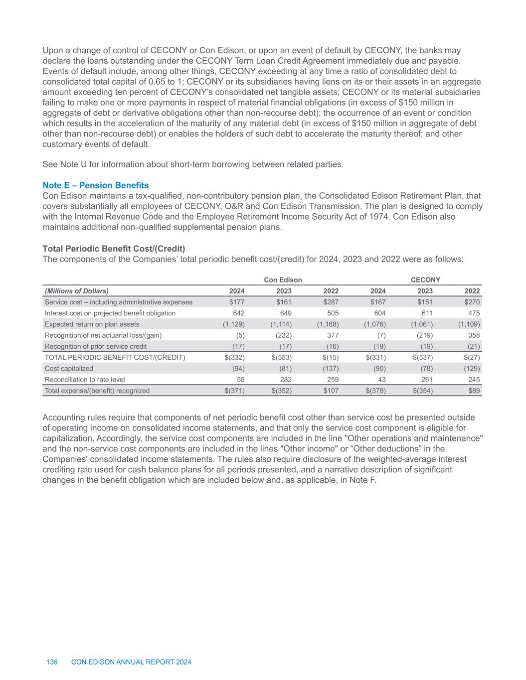 Upon a change of control of CECONY or Con Edison, or upon an event of default by CECONY, the banks may declare the loans outstanding under the CECONY Term Loan Credit Agreement immediately due and payable. Events of default include, among other things, CECONY exceeding at any time a ratio of consolidated debt to consolidated total capital of 0.65 to 1; CECONY or its subsidiaries having liens on its or their assets in an aggregate amount exceeding ten percent of CECONY’s consolidated net tangible assets; CECONY or its material subsidiaries failing to make one or more payments in respect of material financial obligations (in excess of $150 million in aggregate of debt or derivative obligations other than non-recourse debt); the occurrence of an event or condition which results in the acceleration of the maturity of any material debt (in excess of $150 million in aggregate of debt other than non-recourse debt) or enables the holders of such debt to accelerate the maturity thereof; and other customary events of default. See Note U for information about short-term borrowing between related parties. Note E – Pension Benefits Con Edison maintains a tax-qualified, non-contributory pension plan, the Consolidated Edison Retirement Plan, that covers substantially all employees of CECONY, O&R and Con Edison Transmission. The plan is designed to comply with the Internal Revenue Code and the Employee Retirement Income Security Act of 1974. Con Edison also maintains additional non–qualified supplemental pension plans. Total Periodic Benefit Cost/(Credit) The components of the Companies’ total periodic benefit cost/(credit) for 2024, 2023 and 2022 were as follows: Con Edison CECONY (Millions of Dollars) 2024 2023 2022 2024 2023 2022 Service cost – including administrative expenses $177 $161 $287 $167 $151 $270 Interest cost on projected benefit obligation 642 649 505 604 611 475 Expected return on plan assets (1,129) (1,114) (1,168) (1,076) (1,061) (1,109) Recognition of net actuarial loss/(gain) (5) (232) 377 (7) (219) 358 Recognition of prior service credit (17) (17) (16) (19) (19) (21) TOTAL PERIODIC BENEFIT COST/(CREDIT) $(332) $(553) $(15) $(331) $(537) $(27) Cost capitalized (94) (81) (137) (90) (78) (129) Reconciliation to rate level 55 282 259 43 261 245 Total expense/(benefit) recognized $(371) $(352) $107 $(378) $(354) $89 Accounting rules require that components of net periodic benefit cost other than service cost be presented outside of operating income on consolidated income statements, and that only the service cost component is eligible for capitalization. Accordingly, the service cost components are included in the line "Other operations and maintenance" and the non-service cost components are included in the lines "Other income" or “Other deductions” in the Companies' consolidated income statements. The rules also require disclosure of the weighted-average interest crediting rate used for cash balance plans for all periods presented, and a narrative description of significant changes in the benefit obligation which are included below and, as applicable, in Note F. 136 CON EDISON ANNUAL REPORT 2024