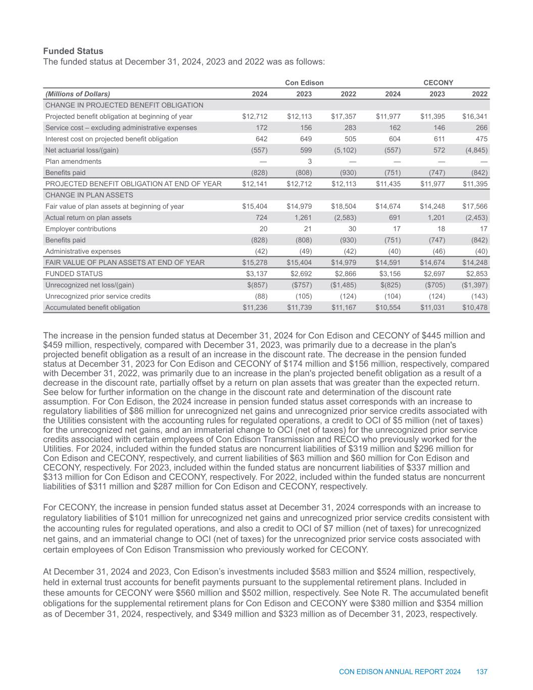 Funded Status The funded status at December 31, 2024, 2023 and 2022 was as follows: Con Edison CECONY (Millions of Dollars) 2024 2023 2022 2024 2023 2022 CHANGE IN PROJECTED BENEFIT OBLIGATION Projected benefit obligation at beginning of year $12,712 $12,113 $17,357 $11,977 $11,395 $16,341 Service cost – excluding administrative expenses 172 156 283 162 146 266 Interest cost on projected benefit obligation 642 649 505 604 611 475 Net actuarial loss/(gain) (557) 599 (5,102) (557) 572 (4,845) Plan amendments — 3 — — — — Benefits paid (828) (808) (930) (751) (747) (842) PROJECTED BENEFIT OBLIGATION AT END OF YEAR $12,141 $12,712 $12,113 $11,435 $11,977 $11,395 CHANGE IN PLAN ASSETS Fair value of plan assets at beginning of year $15,404 $14,979 $18,504 $14,674 $14,248 $17,566 Actual return on plan assets 724 1,261 (2,583) 691 1,201 (2,453) Employer contributions 20 21 30 17 18 17 Benefits paid (828) (808) (930) (751) (747) (842) Administrative expenses (42) (49) (42) (40) (46) (40) FAIR VALUE OF PLAN ASSETS AT END OF YEAR $15,278 $15,404 $14,979 $14,591 $14,674 $14,248 FUNDED STATUS $3,137 $2,692 $2,866 $3,156 $2,697 $2,853 Unrecognized net loss/(gain) $(857) ($757) ($1,485) $(825) ($705) ($1,397) Unrecognized prior service credits (88) (105) (124) (104) (124) (143) Accumulated benefit obligation $11,236 $11,739 $11,167 $10,554 $11,031 $10,478 The increase in the pension funded status at December 31, 2024 for Con Edison and CECONY of $445 million and $459 million, respectively, compared with December 31, 2023, was primarily due to a decrease in the plan's projected benefit obligation as a result of an increase in the discount rate. The decrease in the pension funded status at December 31, 2023 for Con Edison and CECONY of $174 million and $156 million, respectively, compared with December 31, 2022, was primarily due to an increase in the plan's projected benefit obligation as a result of a decrease in the discount rate, partially offset by a return on plan assets that was greater than the expected return. See below for further information on the change in the discount rate and determination of the discount rate assumption. For Con Edison, the 2024 increase in pension funded status asset corresponds with an increase to regulatory liabilities of $86 million for unrecognized net gains and unrecognized prior service credits associated with the Utilities consistent with the accounting rules for regulated operations, a credit to OCI of $5 million (net of taxes) for the unrecognized net gains, and an immaterial change to OCI (net of taxes) for the unrecognized prior service credits associated with certain employees of Con Edison Transmission and RECO who previously worked for the Utilities. For 2024, included within the funded status are noncurrent liabilities of $319 million and $296 million for Con Edison and CECONY, respectively, and current liabilities of $63 million and $60 million for Con Edison and CECONY, respectively. For 2023, included within the funded status are noncurrent liabilities of $337 million and $313 million for Con Edison and CECONY, respectively. For 2022, included within the funded status are noncurrent liabilities of $311 million and $287 million for Con Edison and CECONY, respectively. For CECONY, the increase in pension funded status asset at December 31, 2024 corresponds with an increase to regulatory liabilities of $101 million for unrecognized net gains and unrecognized prior service credits consistent with the accounting rules for regulated operations, and also a credit to OCI of $7 million (net of taxes) for unrecognized net gains, and an immaterial change to OCI (net of taxes) for the unrecognized prior service costs associated with certain employees of Con Edison Transmission who previously worked for CECONY. At December 31, 2024 and 2023, Con Edison’s investments included $583 million and $524 million, respectively, held in external trust accounts for benefit payments pursuant to the supplemental retirement plans. Included in these amounts for CECONY were $560 million and $502 million, respectively. See Note R. The accumulated benefit obligations for the supplemental retirement plans for Con Edison and CECONY were $380 million and $354 million as of December 31, 2024, respectively, and $349 million and $323 million as of December 31, 2023, respectively. CON EDISON ANNUAL REPORT 2024 137