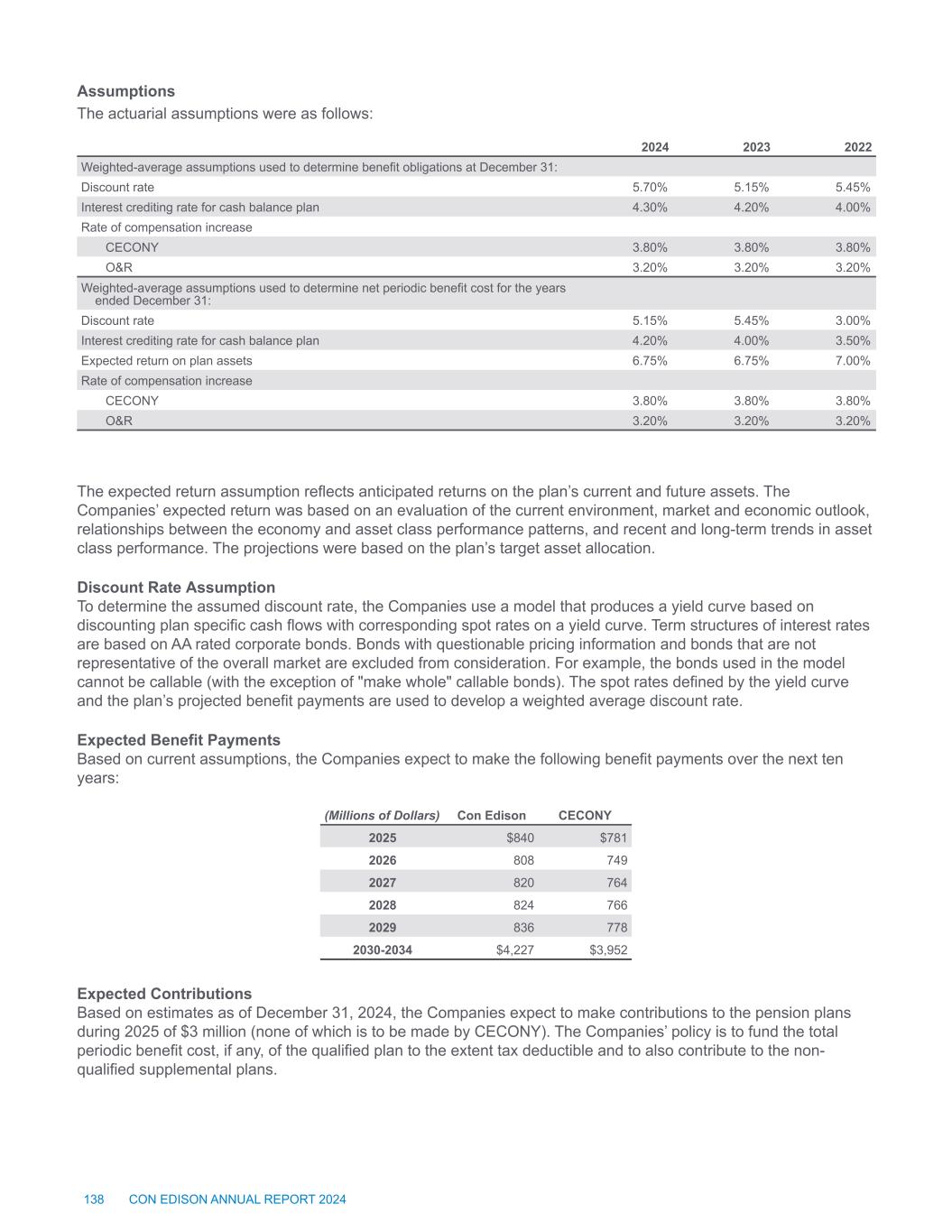 Assumptions The actuarial assumptions were as follows: 2024 2023 2022 Weighted-average assumptions used to determine benefit obligations at December 31: Discount rate 5.70% 5.15% 5.45% Interest crediting rate for cash balance plan 4.30% 4.20% 4.00% Rate of compensation increase CECONY 3.80% 3.80% 3.80% O&R 3.20% 3.20% 3.20% Weighted-average assumptions used to determine net periodic benefit cost for the years ended December 31: Discount rate 5.15% 5.45% 3.00% Interest crediting rate for cash balance plan 4.20% 4.00% 3.50% Expected return on plan assets 6.75% 6.75% 7.00% Rate of compensation increase CECONY 3.80% 3.80% 3.80% O&R 3.20% 3.20% 3.20% The expected return assumption reflects anticipated returns on the plan’s current and future assets. The Companies’ expected return was based on an evaluation of the current environment, market and economic outlook, relationships between the economy and asset class performance patterns, and recent and long-term trends in asset class performance. The projections were based on the plan’s target asset allocation. Discount Rate Assumption To determine the assumed discount rate, the Companies use a model that produces a yield curve based on discounting plan specific cash flows with corresponding spot rates on a yield curve. Term structures of interest rates are based on AA rated corporate bonds. Bonds with questionable pricing information and bonds that are not representative of the overall market are excluded from consideration. For example, the bonds used in the model cannot be callable (with the exception of "make whole" callable bonds). The spot rates defined by the yield curve and the plan’s projected benefit payments are used to develop a weighted average discount rate. Expected Benefit Payments Based on current assumptions, the Companies expect to make the following benefit payments over the next ten years: (Millions of Dollars) Con Edison CECONY 2025 $840 $781 2026 808 749 2027 820 764 2028 824 766 2029 836 778 2030-2034 $4,227 $3,952 Expected Contributions Based on estimates as of December 31, 2024, the Companies expect to make contributions to the pension plans during 2025 of $3 million (none of which is to be made by CECONY). The Companies’ policy is to fund the total periodic benefit cost, if any, of the qualified plan to the extent tax deductible and to also contribute to the non- qualified supplemental plans. 138 CON EDISON ANNUAL REPORT 2024