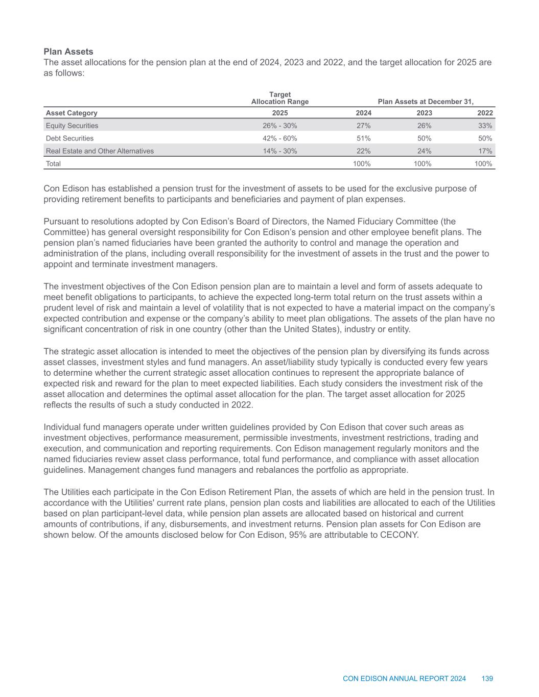 Plan Assets The asset allocations for the pension plan at the end of 2024, 2023 and 2022, and the target allocation for 2025 are as follows: Target Allocation Range Plan Assets at December 31, Asset Category 2025 2024 2023 2022 Equity Securities 26% - 30% 27% 26% 33% Debt Securities 42% - 60% 51% 50% 50% Real Estate and Other Alternatives 14% - 30% 22% 24% 17% Total 100% 100% 100% Con Edison has established a pension trust for the investment of assets to be used for the exclusive purpose of providing retirement benefits to participants and beneficiaries and payment of plan expenses. Pursuant to resolutions adopted by Con Edison’s Board of Directors, the Named Fiduciary Committee (the Committee) has general oversight responsibility for Con Edison’s pension and other employee benefit plans. The pension plan’s named fiduciaries have been granted the authority to control and manage the operation and administration of the plans, including overall responsibility for the investment of assets in the trust and the power to appoint and terminate investment managers. The investment objectives of the Con Edison pension plan are to maintain a level and form of assets adequate to meet benefit obligations to participants, to achieve the expected long-term total return on the trust assets within a prudent level of risk and maintain a level of volatility that is not expected to have a material impact on the company’s expected contribution and expense or the company’s ability to meet plan obligations. The assets of the plan have no significant concentration of risk in one country (other than the United States), industry or entity. The strategic asset allocation is intended to meet the objectives of the pension plan by diversifying its funds across asset classes, investment styles and fund managers. An asset/liability study typically is conducted every few years to determine whether the current strategic asset allocation continues to represent the appropriate balance of expected risk and reward for the plan to meet expected liabilities. Each study considers the investment risk of the asset allocation and determines the optimal asset allocation for the plan. The target asset allocation for 2025 reflects the results of such a study conducted in 2022. Individual fund managers operate under written guidelines provided by Con Edison that cover such areas as investment objectives, performance measurement, permissible investments, investment restrictions, trading and execution, and communication and reporting requirements. Con Edison management regularly monitors and the named fiduciaries review asset class performance, total fund performance, and compliance with asset allocation guidelines. Management changes fund managers and rebalances the portfolio as appropriate. The Utilities each participate in the Con Edison Retirement Plan, the assets of which are held in the pension trust. In accordance with the Utilities' current rate plans, pension plan costs and liabilities are allocated to each of the Utilities based on plan participant-level data, while pension plan assets are allocated based on historical and current amounts of contributions, if any, disbursements, and investment returns. Pension plan assets for Con Edison are shown below. Of the amounts disclosed below for Con Edison, 95% are attributable to CECONY. CON EDISON ANNUAL REPORT 2024 139