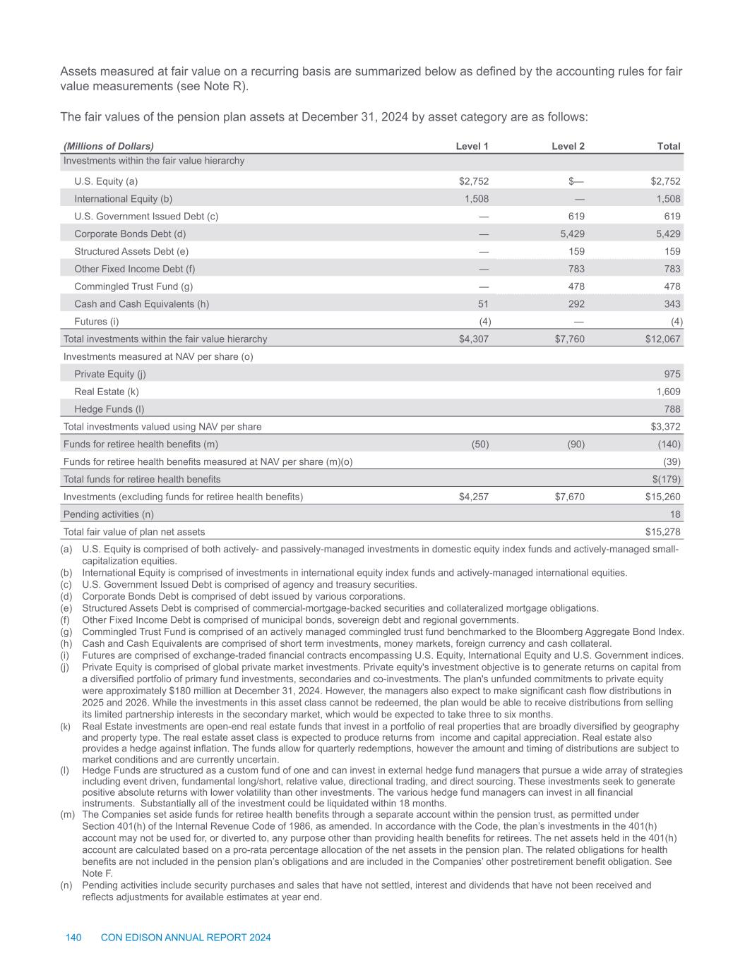 Assets measured at fair value on a recurring basis are summarized below as defined by the accounting rules for fair value measurements (see Note R). The fair values of the pension plan assets at December 31, 2024 by asset category are as follows: (Millions of Dollars) Level 1 Level 2 Total Investments within the fair value hierarchy U.S. Equity (a) $2,752 $— $2,752 International Equity (b) 1,508 — 1,508 U.S. Government Issued Debt (c) — 619 619 Corporate Bonds Debt (d) — 5,429 5,429 Structured Assets Debt (e) — 159 159 Other Fixed Income Debt (f) — 783 783 Commingled Trust Fund (g) — 478 478 Cash and Cash Equivalents (h) 51 292 343 Futures (i) (4) — (4) Total investments within the fair value hierarchy $4,307 $7,760 $12,067 Investments measured at NAV per share (o) Private Equity (j) 975 Real Estate (k) 1,609 Hedge Funds (l) 788 Total investments valued using NAV per share $3,372 Funds for retiree health benefits (m) (50) (90) (140) Funds for retiree health benefits measured at NAV per share (m)(o) (39) Total funds for retiree health benefits $(179) Investments (excluding funds for retiree health benefits) $4,257 $7,670 $15,260 Pending activities (n) 18 Total fair value of plan net assets $15,278 (a) U.S. Equity is comprised of both actively- and passively-managed investments in domestic equity index funds and actively-managed small- capitalization equities. (b) International Equity is comprised of investments in international equity index funds and actively-managed international equities. (c) U.S. Government Issued Debt is comprised of agency and treasury securities. (d) Corporate Bonds Debt is comprised of debt issued by various corporations. (e) Structured Assets Debt is comprised of commercial-mortgage-backed securities and collateralized mortgage obligations. (f) Other Fixed Income Debt is comprised of municipal bonds, sovereign debt and regional governments. (g) Commingled Trust Fund is comprised of an actively managed commingled trust fund benchmarked to the Bloomberg Aggregate Bond Index. (h) Cash and Cash Equivalents are comprised of short term investments, money markets, foreign currency and cash collateral. (i) Futures are comprised of exchange-traded financial contracts encompassing U.S. Equity, International Equity and U.S. Government indices. (j) Private Equity is comprised of global private market investments. Private equity's investment objective is to generate returns on capital from a diversified portfolio of primary fund investments, secondaries and co-investments. The plan's unfunded commitments to private equity were approximately $180 million at December 31, 2024. However, the managers also expect to make significant cash flow distributions in 2025 and 2026. While the investments in this asset class cannot be redeemed, the plan would be able to receive distributions from selling its limited partnership interests in the secondary market, which would be expected to take three to six months. (k) Real Estate investments are open-end real estate funds that invest in a portfolio of real properties that are broadly diversified by geography and property type. The real estate asset class is expected to produce returns from income and capital appreciation. Real estate also provides a hedge against inflation. The funds allow for quarterly redemptions, however the amount and timing of distributions are subject to market conditions and are currently uncertain. (l) Hedge Funds are structured as a custom fund of one and can invest in external hedge fund managers that pursue a wide array of strategies including event driven, fundamental long/short, relative value, directional trading, and direct sourcing. These investments seek to generate positive absolute returns with lower volatility than other investments. The various hedge fund managers can invest in all financial instruments. Substantially all of the investment could be liquidated within 18 months. (m) The Companies set aside funds for retiree health benefits through a separate account within the pension trust, as permitted under Section 401(h) of the Internal Revenue Code of 1986, as amended. In accordance with the Code, the plan’s investments in the 401(h) account may not be used for, or diverted to, any purpose other than providing health benefits for retirees. The net assets held in the 401(h) account are calculated based on a pro-rata percentage allocation of the net assets in the pension plan. The related obligations for health benefits are not included in the pension plan’s obligations and are included in the Companies’ other postretirement benefit obligation. See Note F. (n) Pending activities include security purchases and sales that have not settled, interest and dividends that have not been received and reflects adjustments for available estimates at year end. 140 CON EDISON ANNUAL REPORT 2024