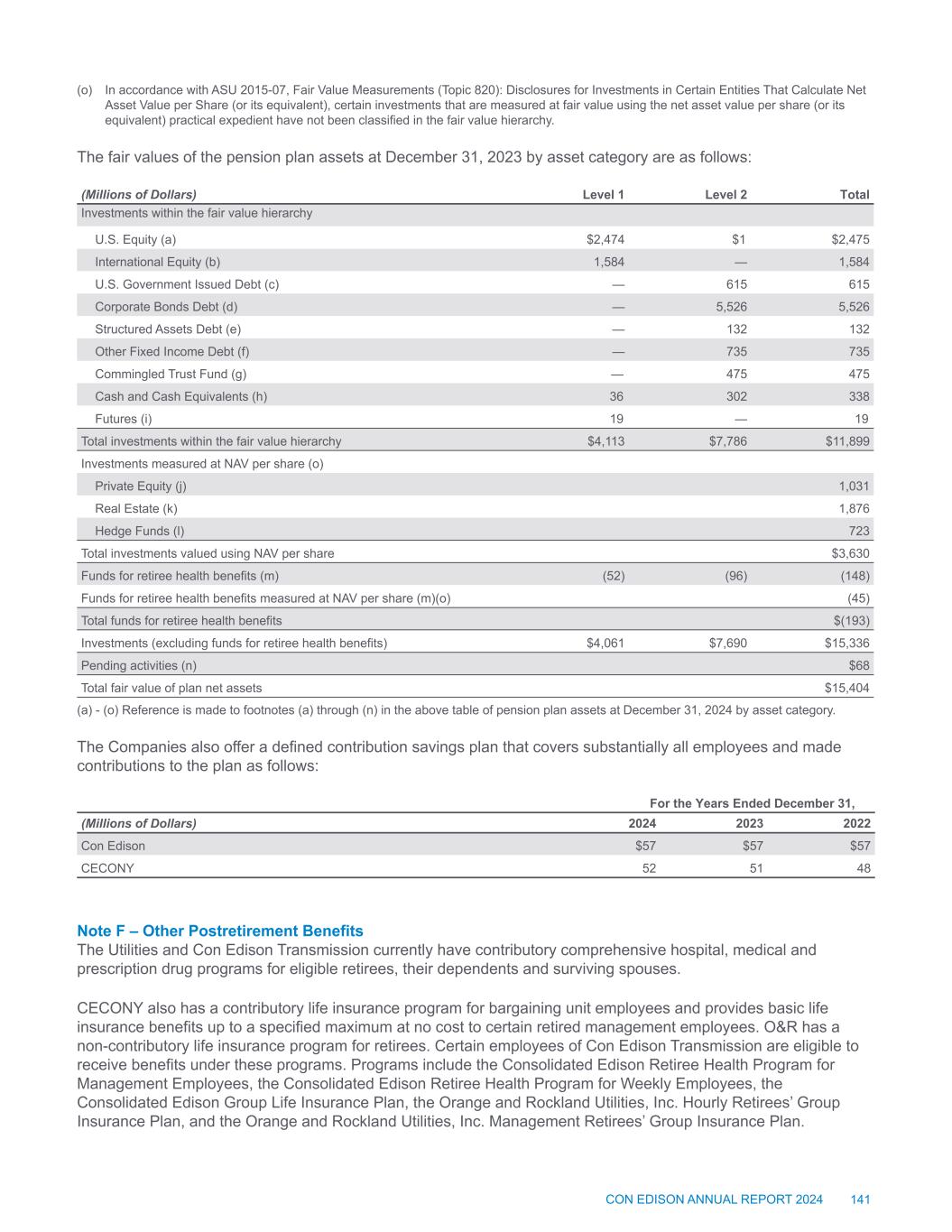(o) In accordance with ASU 2015-07, Fair Value Measurements (Topic 820): Disclosures for Investments in Certain Entities That Calculate Net Asset Value per Share (or its equivalent), certain investments that are measured at fair value using the net asset value per share (or its equivalent) practical expedient have not been classified in the fair value hierarchy. The fair values of the pension plan assets at December 31, 2023 by asset category are as follows: (Millions of Dollars) Level 1 Level 2 Total Investments within the fair value hierarchy U.S. Equity (a) $2,474 $1 $2,475 International Equity (b) 1,584 — 1,584 U.S. Government Issued Debt (c) — 615 615 Corporate Bonds Debt (d) — 5,526 5,526 Structured Assets Debt (e) — 132 132 Other Fixed Income Debt (f) — 735 735 Commingled Trust Fund (g) — 475 475 Cash and Cash Equivalents (h) 36 302 338 Futures (i) 19 — 19 Total investments within the fair value hierarchy $4,113 $7,786 $11,899 Investments measured at NAV per share (o) Private Equity (j) 1,031 Real Estate (k) 1,876 Hedge Funds (l) 723 Total investments valued using NAV per share $3,630 Funds for retiree health benefits (m) (52) (96) (148) Funds for retiree health benefits measured at NAV per share (m)(o) (45) Total funds for retiree health benefits $(193) Investments (excluding funds for retiree health benefits) $4,061 $7,690 $15,336 Pending activities (n) $68 Total fair value of plan net assets $15,404 (a) - (o) Reference is made to footnotes (a) through (n) in the above table of pension plan assets at December 31, 2024 by asset category. The Companies also offer a defined contribution savings plan that covers substantially all employees and made contributions to the plan as follows: For the Years Ended December 31, (Millions of Dollars) 2024 2023 2022 Con Edison $57 $57 $57 CECONY 52 51 48 Note F – Other Postretirement Benefits The Utilities and Con Edison Transmission currently have contributory comprehensive hospital, medical and prescription drug programs for eligible retirees, their dependents and surviving spouses. CECONY also has a contributory life insurance program for bargaining unit employees and provides basic life insurance benefits up to a specified maximum at no cost to certain retired management employees. O&R has a non-contributory life insurance program for retirees. Certain employees of Con Edison Transmission are eligible to receive benefits under these programs. Programs include the Consolidated Edison Retiree Health Program for Management Employees, the Consolidated Edison Retiree Health Program for Weekly Employees, the Consolidated Edison Group Life Insurance Plan, the Orange and Rockland Utilities, Inc. Hourly Retirees’ Group Insurance Plan, and the Orange and Rockland Utilities, Inc. Management Retirees’ Group Insurance Plan. CON EDISON ANNUAL REPORT 2024 141