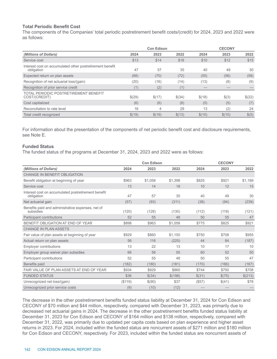 Total Periodic Benefit Cost The components of the Companies’ total periodic postretirement benefit costs/(credit) for 2024, 2023 and 2022 were as follows: Con Edison CECONY (Millions of Dollars) 2024 2023 2022 2024 2023 2022 Service cost $13 $14 $18 $10 $12 $15 Interest cost on accumulated other postretirement benefit obligation 47 57 35 40 49 30 Expected return on plan assets (68) (70) (72) (55) (56) (58) Recognition of net actuarial loss/(gain) (20) (16) (14) (13) (8) (9) Recognition of prior service credit (1) (2) (1) — — — TOTAL PERIODIC POSTRETIREMENT BENEFIT COST/(CREDIT) $(29) $(17) $(34) $(18) $(3) $(22) Cost capitalized (6) (6) (8) (5) (5) (7) Reconciliation to rate level 16 4 29 13 (2) 24 Total credit recognized $(19) $(19) $(13) $(10) $(10) $(5) For information about the presentation of the components of net periodic benefit cost and disclosure requirements, see Note E. Funded Status The funded status of the programs at December 31, 2024, 2023 and 2022 were as follows: Con Edison CECONY (Millions of Dollars) 2024 2023 2022 2024 2023 2022 CHANGE IN BENEFIT OBLIGATION Benefit obligation at beginning of year $963 $1,058 $1,398 $825 $921 $1,189 Service cost 13 14 18 10 12 15 Interest cost on accumulated postretirement benefit obligation 47 57 35 40 49 30 Net actuarial gain (57) (93) (311) (38) (94) (239) Benefits paid and administrative expenses, net of subsidies (120) (128) (130) (112) (118) (121) Participant contributions 52 55 48 50 55 47 BENEFIT OBLIGATION AT END OF YEAR $898 $963 $1,058 $775 $825 $921 CHANGE IN PLAN ASSETS Fair value of plan assets at beginning of year $929 $860 $1,150 $750 $708 $955 Actual return on plan assets 56 116 (225) 44 84 (187) Employer contributions 13 22 13 10 17 10 Employer group waiver plan subsidies 66 56 55 60 52 50 Participant contributions 52 55 48 50 55 47 Benefits paid (182) (180) (181) (170) (166) (167) FAIR VALUE OF PLAN ASSETS AT END OF YEAR $934 $929 $860 $744 $750 $708 FUNDED STATUS $36 $(34) $(198) $(31) $(75) $(213) Unrecognized net loss/(gain) ($119) $(90) $37 ($57) $(41) $78 Unrecognized prior service costs (9) (10) (12) — — — The decrease in the other postretirement benefits funded status liability at December 31, 2024 for Con Edison and CECONY of $70 million and $44 million, respectively, compared with December 31, 2023, was primarily due to decreased net actuarial gains in 2024. The decrease in the other postretirement benefits funded status liability at December 31, 2023 for Con Edison and CECONY of $164 million and $138 million, respectively, compared with December 31, 2022, was primarily due to updated per capita costs based on plan experience and higher asset returns in 2023. For 2024, included within the funded status are noncurrent assets of $271 million and $180 million for Con Edison and CECONY, respectively. For 2023, included within the funded status are noncurrent assets of 142 CON EDISON ANNUAL REPORT 2024