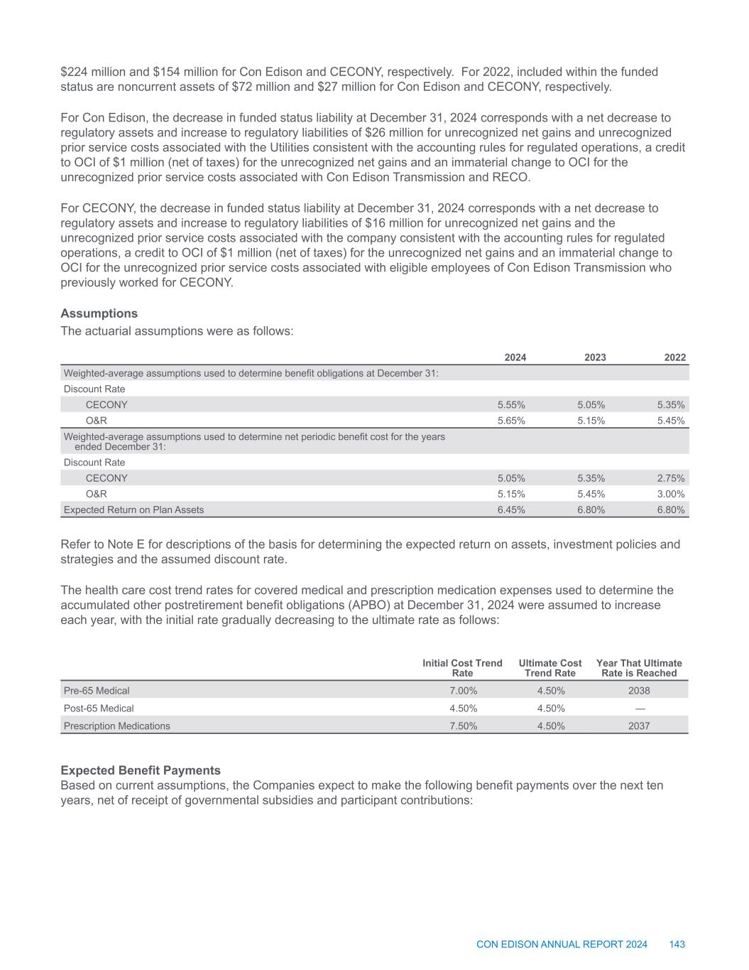 $224 million and $154 million for Con Edison and CECONY, respectively. For 2022, included within the funded status are noncurrent assets of $72 million and $27 million for Con Edison and CECONY, respectively. For Con Edison, the decrease in funded status liability at December 31, 2024 corresponds with a net decrease to regulatory assets and increase to regulatory liabilities of $26 million for unrecognized net gains and unrecognized prior service costs associated with the Utilities consistent with the accounting rules for regulated operations, a credit to OCI of $1 million (net of taxes) for the unrecognized net gains and an immaterial change to OCI for the unrecognized prior service costs associated with Con Edison Transmission and RECO. For CECONY, the decrease in funded status liability at December 31, 2024 corresponds with a net decrease to regulatory assets and increase to regulatory liabilities of $16 million for unrecognized net gains and the unrecognized prior service costs associated with the company consistent with the accounting rules for regulated operations, a credit to OCI of $1 million (net of taxes) for the unrecognized net gains and an immaterial change to OCI for the unrecognized prior service costs associated with eligible employees of Con Edison Transmission who previously worked for CECONY. Assumptions The actuarial assumptions were as follows: 2024 2023 2022 Weighted-average assumptions used to determine benefit obligations at December 31: Discount Rate CECONY 5.55% 5.05% 5.35% O&R 5.65% 5.15% 5.45% Weighted-average assumptions used to determine net periodic benefit cost for the years ended December 31: Discount Rate CECONY 5.05% 5.35% 2.75% O&R 5.15% 5.45% 3.00% Expected Return on Plan Assets 6.45% 6.80% 6.80% Refer to Note E for descriptions of the basis for determining the expected return on assets, investment policies and strategies and the assumed discount rate. The health care cost trend rates for covered medical and prescription medication expenses used to determine the accumulated other postretirement benefit obligations (APBO) at December 31, 2024 were assumed to increase each year, with the initial rate gradually decreasing to the ultimate rate as follows: Initial Cost Trend Rate Ultimate Cost Trend Rate Year That Ultimate Rate is Reached Pre-65 Medical 7.00% 4.50% 2038 Post-65 Medical 4.50% 4.50% — Prescription Medications 7.50% 4.50% 2037 Expected Benefit Payments Based on current assumptions, the Companies expect to make the following benefit payments over the next ten years, net of receipt of governmental subsidies and participant contributions: CON EDISON ANNUAL REPORT 2024 143