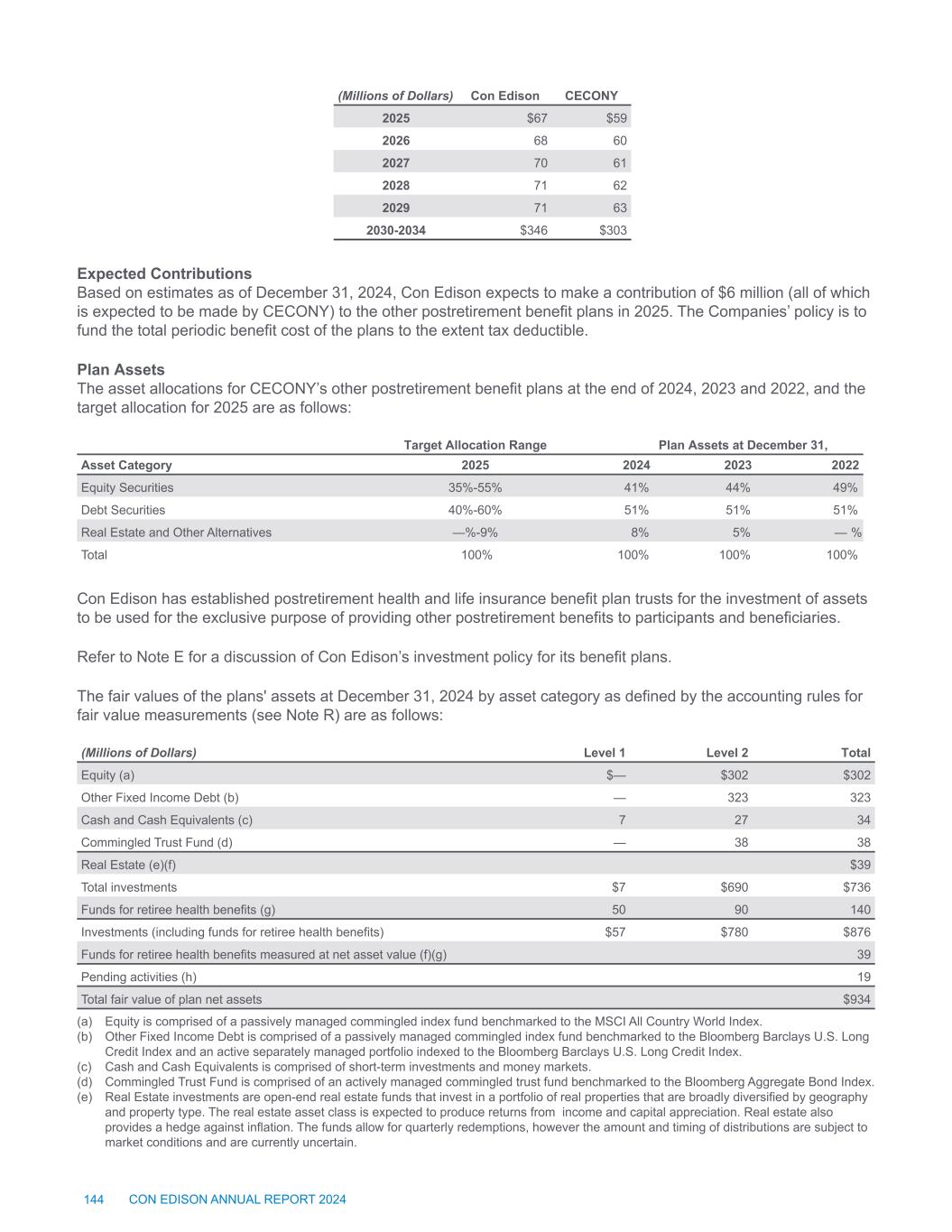 (Millions of Dollars) Con Edison CECONY 2025 $67 $59 2026 68 60 2027 70 61 2028 71 62 2029 71 63 2030-2034 $346 $303 Expected Contributions Based on estimates as of December 31, 2024, Con Edison expects to make a contribution of $6 million (all of which is expected to be made by CECONY) to the other postretirement benefit plans in 2025. The Companies’ policy is to fund the total periodic benefit cost of the plans to the extent tax deductible. Plan Assets The asset allocations for CECONY’s other postretirement benefit plans at the end of 2024, 2023 and 2022, and the target allocation for 2025 are as follows: Target Allocation Range Plan Assets at December 31, Asset Category 2025 2024 2023 2022 Equity Securities 35%-55% 41% 44% 49% Debt Securities 40%-60% 51% 51% 51% Real Estate and Other Alternatives —%-9% 8% 5% — % Total 100% 100% 100% 100% Con Edison has established postretirement health and life insurance benefit plan trusts for the investment of assets to be used for the exclusive purpose of providing other postretirement benefits to participants and beneficiaries. Refer to Note E for a discussion of Con Edison’s investment policy for its benefit plans. The fair values of the plans' assets at December 31, 2024 by asset category as defined by the accounting rules for fair value measurements (see Note R) are as follows: (Millions of Dollars) Level 1 Level 2 Total Equity (a) $— $302 $302 Other Fixed Income Debt (b) — 323 323 Cash and Cash Equivalents (c) 7 27 34 Commingled Trust Fund (d) — 38 38 Real Estate (e)(f) $39 Total investments $7 $690 $736 Funds for retiree health benefits (g) 50 90 140 Investments (including funds for retiree health benefits) $57 $780 $876 Funds for retiree health benefits measured at net asset value (f)(g) 39 Pending activities (h) 19 Total fair value of plan net assets $934 (a) Equity is comprised of a passively managed commingled index fund benchmarked to the MSCI All Country World Index. (b) Other Fixed Income Debt is comprised of a passively managed commingled index fund benchmarked to the Bloomberg Barclays U.S. Long Credit Index and an active separately managed portfolio indexed to the Bloomberg Barclays U.S. Long Credit Index. (c) Cash and Cash Equivalents is comprised of short-term investments and money markets. (d) Commingled Trust Fund is comprised of an actively managed commingled trust fund benchmarked to the Bloomberg Aggregate Bond Index. (e) Real Estate investments are open-end real estate funds that invest in a portfolio of real properties that are broadly diversified by geography and property type. The real estate asset class is expected to produce returns from income and capital appreciation. Real estate also provides a hedge against inflation. The funds allow for quarterly redemptions, however the amount and timing of distributions are subject to market conditions and are currently uncertain. 144 CON EDISON ANNUAL REPORT 2024