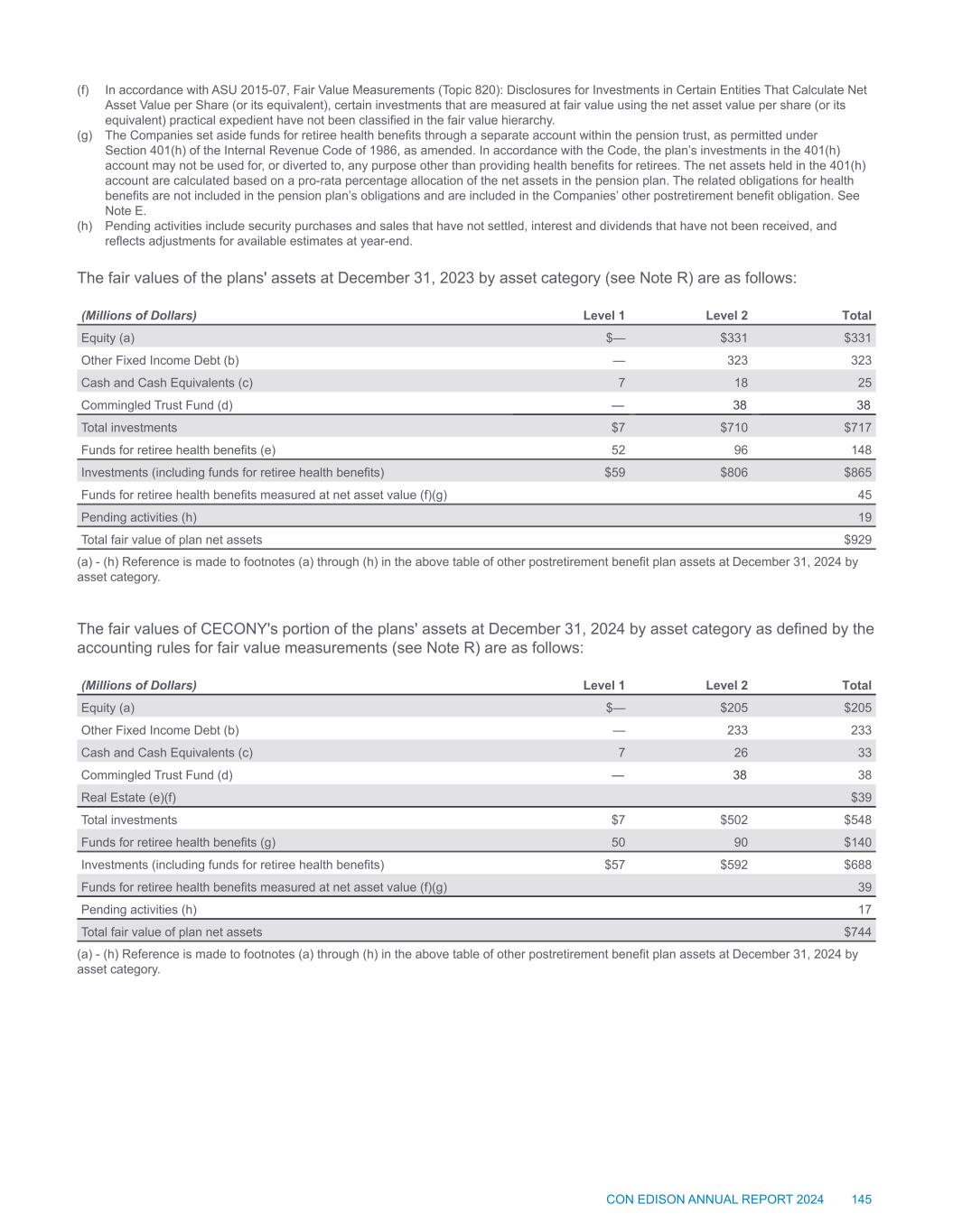 (f) In accordance with ASU 2015-07, Fair Value Measurements (Topic 820): Disclosures for Investments in Certain Entities That Calculate Net Asset Value per Share (or its equivalent), certain investments that are measured at fair value using the net asset value per share (or its equivalent) practical expedient have not been classified in the fair value hierarchy. (g) The Companies set aside funds for retiree health benefits through a separate account within the pension trust, as permitted under Section 401(h) of the Internal Revenue Code of 1986, as amended. In accordance with the Code, the plan’s investments in the 401(h) account may not be used for, or diverted to, any purpose other than providing health benefits for retirees. The net assets held in the 401(h) account are calculated based on a pro-rata percentage allocation of the net assets in the pension plan. The related obligations for health benefits are not included in the pension plan’s obligations and are included in the Companies’ other postretirement benefit obligation. See Note E. (h) Pending activities include security purchases and sales that have not settled, interest and dividends that have not been received, and reflects adjustments for available estimates at year-end. The fair values of the plans' assets at December 31, 2023 by asset category (see Note R) are as follows: (Millions of Dollars) Level 1 Level 2 Total Equity (a) $— $331 $331 Other Fixed Income Debt (b) — 323 323 Cash and Cash Equivalents (c) 7 18 25 Commingled Trust Fund (d) — 38 38 Total investments $7 $710 $717 Funds for retiree health benefits (e) 52 96 148 Investments (including funds for retiree health benefits) $59 $806 $865 Funds for retiree health benefits measured at net asset value (f)(g) 45 Pending activities (h) 19 Total fair value of plan net assets $929 (a) - (h) Reference is made to footnotes (a) through (h) in the above table of other postretirement benefit plan assets at December 31, 2024 by asset category. The fair values of CECONY's portion of the plans' assets at December 31, 2024 by asset category as defined by the accounting rules for fair value measurements (see Note R) are as follows: (Millions of Dollars) Level 1 Level 2 Total Equity (a) $— $205 $205 Other Fixed Income Debt (b) — 233 233 Cash and Cash Equivalents (c) 7 26 33 Commingled Trust Fund (d) — 38 38 Real Estate (e)(f) $39 Total investments $7 $502 $548 Funds for retiree health benefits (g) 50 90 $140 Investments (including funds for retiree health benefits) $57 $592 $688 Funds for retiree health benefits measured at net asset value (f)(g) 39 Pending activities (h) 17 Total fair value of plan net assets $744 (a) - (h) Reference is made to footnotes (a) through (h) in the above table of other postretirement benefit plan assets at December 31, 2024 by asset category. CON EDISON ANNUAL REPORT 2024 145