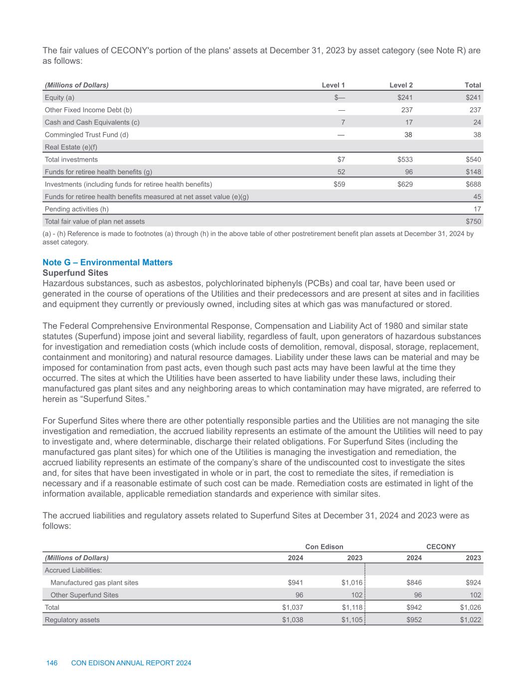 The fair values of CECONY's portion of the plans' assets at December 31, 2023 by asset category (see Note R) are as follows: (Millions of Dollars) Level 1 Level 2 Total Equity (a) $— $241 $241 Other Fixed Income Debt (b) — 237 237 Cash and Cash Equivalents (c) 7 17 24 Commingled Trust Fund (d) — 38 38 Real Estate (e)(f) Total investments $7 $533 $540 Funds for retiree health benefits (g) 52 96 $148 Investments (including funds for retiree health benefits) $59 $629 $688 Funds for retiree health benefits measured at net asset value (e)(g) 45 Pending activities (h) 17 Total fair value of plan net assets $750 (a) - (h) Reference is made to footnotes (a) through (h) in the above table of other postretirement benefit plan assets at December 31, 2024 by asset category. Note G – Environmental Matters Superfund Sites Hazardous substances, such as asbestos, polychlorinated biphenyls (PCBs) and coal tar, have been used or generated in the course of operations of the Utilities and their predecessors and are present at sites and in facilities and equipment they currently or previously owned, including sites at which gas was manufactured or stored. The Federal Comprehensive Environmental Response, Compensation and Liability Act of 1980 and similar state statutes (Superfund) impose joint and several liability, regardless of fault, upon generators of hazardous substances for investigation and remediation costs (which include costs of demolition, removal, disposal, storage, replacement, containment and monitoring) and natural resource damages. Liability under these laws can be material and may be imposed for contamination from past acts, even though such past acts may have been lawful at the time they occurred. The sites at which the Utilities have been asserted to have liability under these laws, including their manufactured gas plant sites and any neighboring areas to which contamination may have migrated, are referred to herein as “Superfund Sites.” For Superfund Sites where there are other potentially responsible parties and the Utilities are not managing the site investigation and remediation, the accrued liability represents an estimate of the amount the Utilities will need to pay to investigate and, where determinable, discharge their related obligations. For Superfund Sites (including the manufactured gas plant sites) for which one of the Utilities is managing the investigation and remediation, the accrued liability represents an estimate of the company’s share of the undiscounted cost to investigate the sites and, for sites that have been investigated in whole or in part, the cost to remediate the sites, if remediation is necessary and if a reasonable estimate of such cost can be made. Remediation costs are estimated in light of the information available, applicable remediation standards and experience with similar sites. The accrued liabilities and regulatory assets related to Superfund Sites at December 31, 2024 and 2023 were as follows: Con Edison CECONY (Millions of Dollars) 2024 2023 2024 2023 Accrued Liabilities: Manufactured gas plant sites $941 $1,016 $846 $924 Other Superfund Sites 96 102 96 102 Total $1,037 $1,118 $942 $1,026 Regulatory assets $1,038 $1,105 $952 $1,022 146 CON EDISON ANNUAL REPORT 2024