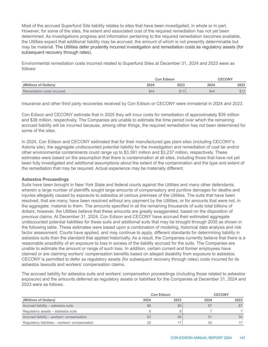 Most of the accrued Superfund Site liability relates to sites that have been investigated, in whole or in part. However, for some of the sites, the extent and associated cost of the required remediation has not yet been determined. As investigations progress and information pertaining to the required remediation becomes available, the Utilities expect that additional liability may be accrued, the amount of which is not presently determinable but may be material. The Utilities defer prudently incurred investigation and remediation costs as regulatory assets (for subsequent recovery through rates). Environmental remediation costs incurred related to Superfund Sites at December 31, 2024 and 2023 were as follows: Con Edison CECONY (Millions of Dollars) 2024 2023 2024 2023 Remediation costs incurred $44 $13 $44 $12 Insurance and other third party recoveries received by Con Edison or CECONY were immaterial in 2024 and 2023. Con Edison and CECONY estimate that in 2025 they will incur costs for remediation of approximately $39 million and $38 million, respectively. The Companies are unable to estimate the time period over which the remaining accrued liability will be incurred because, among other things, the required remediation has not been determined for some of the sites. In 2024, Con Edison and CECONY estimated that for their manufactured gas plant sites (including CECONY’s Astoria site), the aggregate undiscounted potential liability for the investigation and remediation of coal tar and/or other environmental contaminants could range up to $3,391 million and $3,237 million, respectively. These estimates were based on the assumption that there is contamination at all sites, including those that have not yet been fully investigated and additional assumptions about the extent of the contamination and the type and extent of the remediation that may be required. Actual experience may be materially different. Asbestos Proceedings Suits have been brought in New York State and federal courts against the Utilities and many other defendants, wherein a large number of plaintiffs sought large amounts of compensatory and punitive damages for deaths and injuries allegedly caused by exposure to asbestos at various premises of the Utilities. The suits that have been resolved, that are many, have been resolved without any payment by the Utilities, or for amounts that were not, in the aggregate, material to them. The amounts specified in all the remaining thousands of suits total billions of dollars; however, the Utilities believe that these amounts are greatly exaggerated, based on the disposition of previous claims. At December 31, 2024, Con Edison and CECONY have accrued their estimated aggregate undiscounted potential liabilities for these suits and additional suits that may be brought through 2035 as shown in the following table. These estimates were based upon a combination of modeling, historical data analysis and risk factor assessment. Courts have applied, and may continue to apply, different standards for determining liability in asbestos suits than the standard that applied historically. As a result, the Companies currently believe that there is a reasonable possibility of an exposure to loss in excess of the liability accrued for the suits. The Companies are unable to estimate the amount or range of such loss. In addition, certain current and former employees have claimed or are claiming workers’ compensation benefits based on alleged disability from exposure to asbestos. CECONY is permitted to defer as regulatory assets (for subsequent recovery through rates) costs incurred for its asbestos lawsuits and workers’ compensation claims. The accrued liability for asbestos suits and workers’ compensation proceedings (including those related to asbestos exposure) and the amounts deferred as regulatory assets or liabilities for the Companies at December 31, 2024 and 2023 were as follows: Con Edison CECONY (Millions of Dollars) 2024 2023 2024 2023 Accrued liability – asbestos suits $8 $8 $7 $7 Regulatory assets – asbestos suits 8 8 7 7 Accrued liability – workers’ compensation 53 56 51 54 Regulatory liabilities – workers’ compensation 20 17 20 17 CON EDISON ANNUAL REPORT 2024 147