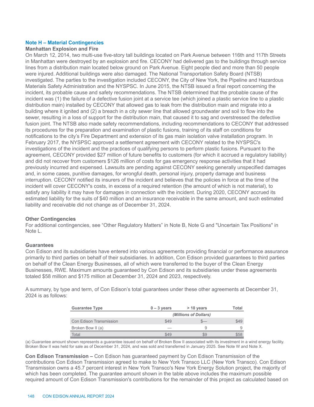 Note H – Material Contingencies Manhattan Explosion and Fire On March 12, 2014, two multi-use five-story tall buildings located on Park Avenue between 116th and 117th Streets in Manhattan were destroyed by an explosion and fire. CECONY had delivered gas to the buildings through service lines from a distribution main located below ground on Park Avenue. Eight people died and more than 50 people were injured. Additional buildings were also damaged. The National Transportation Safety Board (NTSB) investigated. The parties to the investigation included CECONY, the City of New York, the Pipeline and Hazardous Materials Safety Administration and the NYSPSC. In June 2015, the NTSB issued a final report concerning the incident, its probable cause and safety recommendations. The NTSB determined that the probable cause of the incident was (1) the failure of a defective fusion joint at a service tee (which joined a plastic service line to a plastic distribution main) installed by CECONY that allowed gas to leak from the distribution main and migrate into a building where it ignited and (2) a breach in a city sewer line that allowed groundwater and soil to flow into the sewer, resulting in a loss of support for the distribution main, that caused it to sag and overstressed the defective fusion joint. The NTSB also made safety recommendations, including recommendations to CECONY that addressed its procedures for the preparation and examination of plastic fusions, training of its staff on conditions for notifications to the city’s Fire Department and extension of its gas main isolation valve installation program. In February 2017, the NYSPSC approved a settlement agreement with CECONY related to the NYSPSC's investigations of the incident and the practices of qualifying persons to perform plastic fusions. Pursuant to the agreement, CECONY provided $27 million of future benefits to customers (for which it accrued a regulatory liability) and did not recover from customers $126 million of costs for gas emergency response activities that it had previously incurred and expensed. Lawsuits are pending against CECONY seeking generally unspecified damages and, in some cases, punitive damages, for wrongful death, personal injury, property damage and business interruption. CECONY notified its insurers of the incident and believes that the policies in force at the time of the incident will cover CECONY's costs, in excess of a required retention (the amount of which is not material), to satisfy any liability it may have for damages in connection with the incident. During 2020, CECONY accrued its estimated liability for the suits of $40 million and an insurance receivable in the same amount, and such estimated liability and receivable did not change as of December 31, 2024. Other Contingencies For additional contingencies, see “Other Regulatory Matters” in Note B, Note G and "Uncertain Tax Positions" in Note L. Guarantees Con Edison and its subsidiaries have entered into various agreements providing financial or performance assurance primarily to third parties on behalf of their subsidiaries. In addition, Con Edison provided guarantees to third parties on behalf of the Clean Energy Businesses, all of which were transferred to the buyer of the Clean Energy Businesses, RWE. Maximum amounts guaranteed by Con Edison and its subsidiaries under these agreements totaled $58 million and $175 million at December 31, 2024 and 2023, respectively. A summary, by type and term, of Con Edison’s total guarantees under these other agreements at December 31, 2024 is as follows: Guarantee Type 0 – 3 years > 10 years Total (Millions of Dollars) Con Edison Transmission $49 $— $49 Broken Bow II (a) — 9 9 Total $49 $9 $58 (a) Guarantee amount shown represents a guarantee issued on behalf of Broken Bow II associated with its investment in a wind energy facility. Broken Bow II was held for sale as of December 31, 2024, and was sold and transferred in January 2025. See Note W and Note X. Con Edison Transmission – Con Edison has guaranteed payment by Con Edison Transmission of the contributions Con Edison Transmission agreed to make to New York Transco LLC (New York Transco). Con Edison Transmission owns a 45.7 percent interest in New York Transco's New York Energy Solution project, the majority of which has been completed. The guarantee amount shown in the table above includes the maximum possible required amount of Con Edison Transmission's contributions for the remainder of this project as calculated based on 148 CON EDISON ANNUAL REPORT 2024