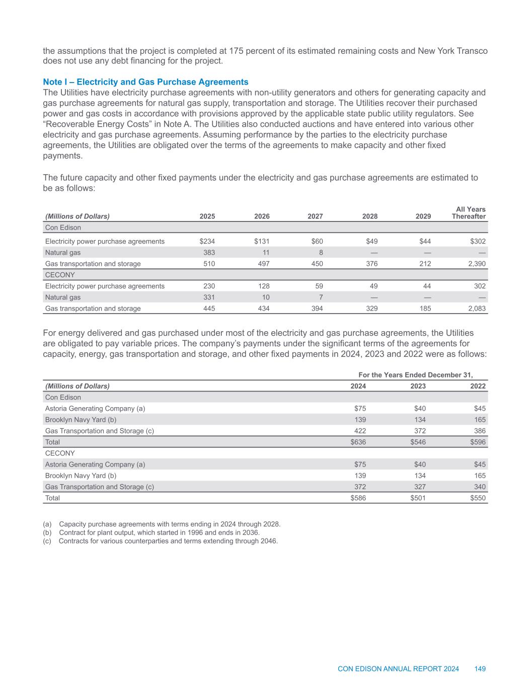 the assumptions that the project is completed at 175 percent of its estimated remaining costs and New York Transco does not use any debt financing for the project. Note I – Electricity and Gas Purchase Agreements The Utilities have electricity purchase agreements with non-utility generators and others for generating capacity and gas purchase agreements for natural gas supply, transportation and storage. The Utilities recover their purchased power and gas costs in accordance with provisions approved by the applicable state public utility regulators. See “Recoverable Energy Costs” in Note A. The Utilities also conducted auctions and have entered into various other electricity and gas purchase agreements. Assuming performance by the parties to the electricity purchase agreements, the Utilities are obligated over the terms of the agreements to make capacity and other fixed payments. The future capacity and other fixed payments under the electricity and gas purchase agreements are estimated to be as follows: (Millions of Dollars) 2025 2026 2027 2028 2029 All Years Thereafter Con Edison Electricity power purchase agreements $234 $131 $60 $49 $44 $302 Natural gas 383 11 8 — — — Gas transportation and storage 510 497 450 376 212 2,390 CECONY Electricity power purchase agreements 230 128 59 49 44 302 Natural gas 331 10 7 — — — Gas transportation and storage 445 434 394 329 185 2,083 For energy delivered and gas purchased under most of the electricity and gas purchase agreements, the Utilities are obligated to pay variable prices. The company’s payments under the significant terms of the agreements for capacity, energy, gas transportation and storage, and other fixed payments in 2024, 2023 and 2022 were as follows: For the Years Ended December 31, (Millions of Dollars) 2024 2023 2022 Con Edison Astoria Generating Company (a) $75 $40 $45 Brooklyn Navy Yard (b) 139 134 165 Gas Transportation and Storage (c) 422 372 386 Total $636 $546 $596 CECONY Astoria Generating Company (a) $75 $40 $45 Brooklyn Navy Yard (b) 139 134 165 Gas Transportation and Storage (c) 372 327 340 Total $586 $501 $550 (a) Capacity purchase agreements with terms ending in 2024 through 2028. (b) Contract for plant output, which started in 1996 and ends in 2036. (c) Contracts for various counterparties and terms extending through 2046. CON EDISON ANNUAL REPORT 2024 149