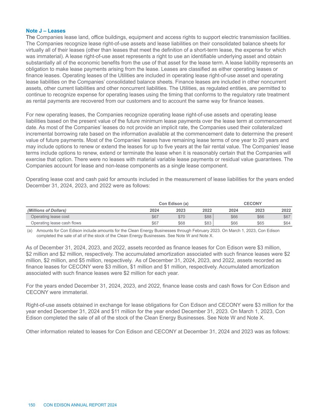 Note J – Leases The Companies lease land, office buildings, equipment and access rights to support electric transmission facilities. The Companies recognize lease right-of-use assets and lease liabilities on their consolidated balance sheets for virtually all of their leases (other than leases that meet the definition of a short-term lease, the expense for which was immaterial). A lease right-of-use asset represents a right to use an identifiable underlying asset and obtain substantially all of the economic benefits from the use of that asset for the lease term. A lease liability represents an obligation to make lease payments arising from the lease. Leases are classified as either operating leases or finance leases. Operating leases of the Utilities are included in operating lease right-of-use asset and operating lease liabilities on the Companies’ consolidated balance sheets. Finance leases are included in other noncurrent assets, other current liabilities and other noncurrent liabilities. The Utilities, as regulated entities, are permitted to continue to recognize expense for operating leases using the timing that conforms to the regulatory rate treatment as rental payments are recovered from our customers and to account the same way for finance leases. For new operating leases, the Companies recognize operating lease right-of-use assets and operating lease liabilities based on the present value of the future minimum lease payments over the lease term at commencement date. As most of the Companies’ leases do not provide an implicit rate, the Companies used their collateralized incremental borrowing rate based on the information available at the commencement date to determine the present value of future payments. Most of the Companies’ leases have remaining lease terms of one year to 20 years and may include options to renew or extend the leases for up to five years at the fair rental value. The Companies' lease terms include options to renew, extend or terminate the lease when it is reasonably certain that the Companies will exercise that option. There were no leases with material variable lease payments or residual value guarantees. The Companies account for lease and non-lease components as a single lease component. Operating lease cost and cash paid for amounts included in the measurement of lease liabilities for the years ended December 31, 2024, 2023, and 2022 were as follows: Con Edison (a) CECONY (Millions of Dollars) 2024 2023 2022 2024 2023 2022 Operating lease cost $67 $70 $88 $66 $66 $67 Operating lease cash flows $67 $68 $83 $66 $65 $64 (a) Amounts for Con Edison include amounts for the Clean Energy Businesses through February 2023. On March 1, 2023, Con Edison completed the sale of all of the stock of the Clean Energy Businesses. See Note W and Note X. As of December 31, 2024, 2023, and 2022, assets recorded as finance leases for Con Edison were $3 million, $2 million and $2 million, respectively. The accumulated amortization associated with such finance leases were $2 million, $2 million, and $5 million, respectively. As of December 31, 2024, 2023, and 2022, assets recorded as finance leases for CECONY were $3 million, $1 million and $1 million, respectively. Accumulated amortization associated with such finance leases were $2 million for each year. For the years ended December 31, 2024, 2023, and 2022, finance lease costs and cash flows for Con Edison and CECONY were immaterial. Right-of-use assets obtained in exchange for lease obligations for Con Edison and CECONY were $3 million for the year ended December 31, 2024 and $11 million for the year ended December 31, 2023. On March 1, 2023, Con Edison completed the sale of all of the stock of the Clean Energy Businesses. See Note W and Note X. Other information related to leases for Con Edison and CECONY at December 31, 2024 and 2023 was as follows: 150 CON EDISON ANNUAL REPORT 2024