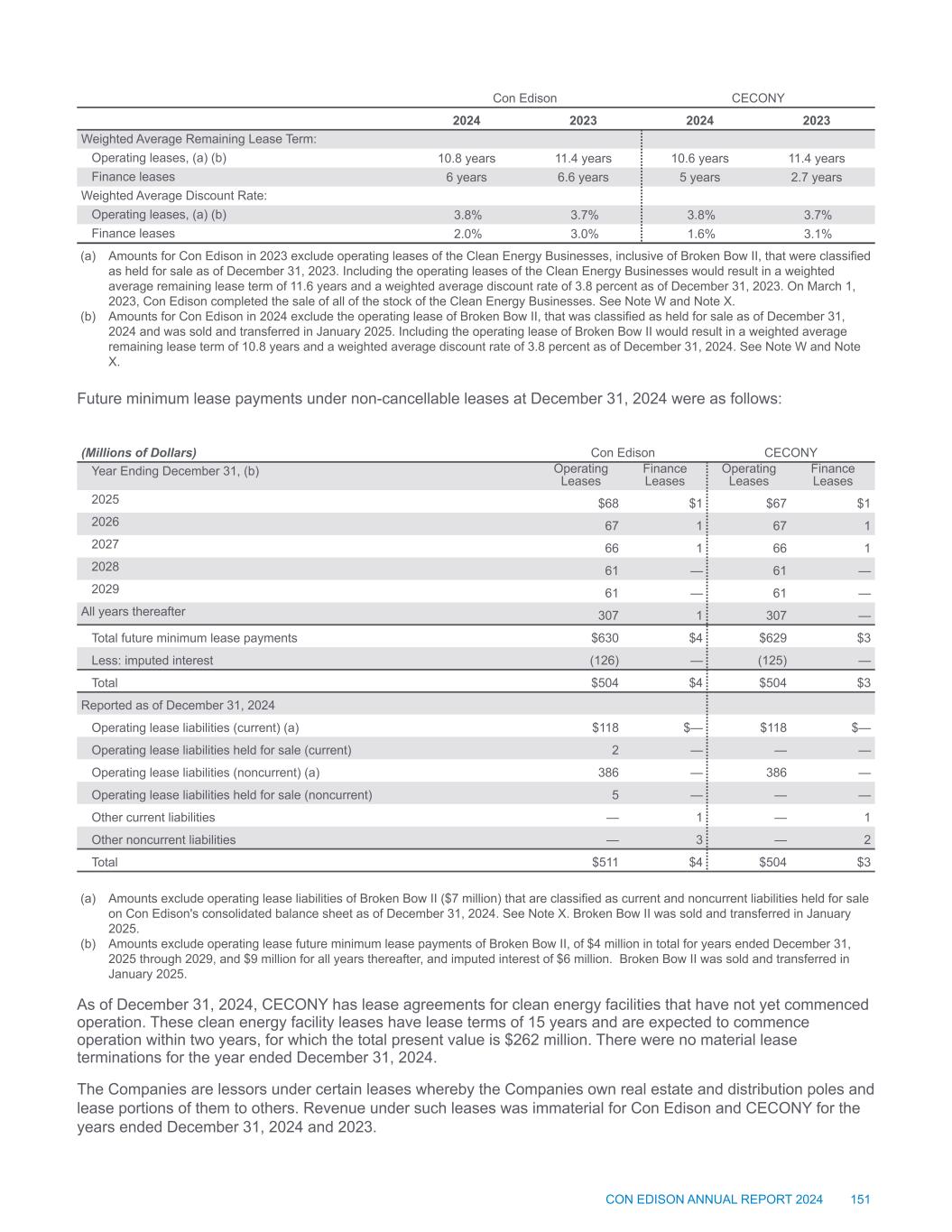 Con Edison CECONY 2024 2023 2024 2023 Weighted Average Remaining Lease Term: Operating leases, (a) (b) 10.8 years 11.4 years 10.6 years 11.4 years Finance leases 6 years 6.6 years 5 years 2.7 years Weighted Average Discount Rate: Operating leases, (a) (b) 3.8% 3.7% 3.8% 3.7% Finance leases 2.0% 3.0% 1.6% 3.1% (a) Amounts for Con Edison in 2023 exclude operating leases of the Clean Energy Businesses, inclusive of Broken Bow II, that were classified as held for sale as of December 31, 2023. Including the operating leases of the Clean Energy Businesses would result in a weighted average remaining lease term of 11.6 years and a weighted average discount rate of 3.8 percent as of December 31, 2023. On March 1, 2023, Con Edison completed the sale of all of the stock of the Clean Energy Businesses. See Note W and Note X. (b) Amounts for Con Edison in 2024 exclude the operating lease of Broken Bow II, that was classified as held for sale as of December 31, 2024 and was sold and transferred in January 2025. Including the operating lease of Broken Bow II would result in a weighted average remaining lease term of 10.8 years and a weighted average discount rate of 3.8 percent as of December 31, 2024. See Note W and Note X. Future minimum lease payments under non-cancellable leases at December 31, 2024 were as follows: (Millions of Dollars) Con Edison CECONY Year Ending December 31, (b) Operating Leases Finance Leases Operating Leases Finance Leases 2025 $68 $1 $67 $1 2026 67 1 67 1 2027 66 1 66 1 2028 61 — 61 — 2029 61 — 61 — All years thereafter 307 1 307 — Total future minimum lease payments $630 $4 $629 $3 Less: imputed interest (126) — (125) — Total $504 $4 $504 $3 Reported as of December 31, 2024 Operating lease liabilities (current) (a) $118 $— $118 $— Operating lease liabilities held for sale (current) 2 — — — Operating lease liabilities (noncurrent) (a) 386 — 386 — Operating lease liabilities held for sale (noncurrent) 5 — — — Other current liabilities — 1 — 1 Other noncurrent liabilities — 3 — 2 Total $511 $4 $504 $3 (a) Amounts exclude operating lease liabilities of Broken Bow II ($7 million) that are classified as current and noncurrent liabilities held for sale on Con Edison's consolidated balance sheet as of December 31, 2024. See Note X. Broken Bow II was sold and transferred in January 2025. (b) Amounts exclude operating lease future minimum lease payments of Broken Bow II, of $4 million in total for years ended December 31, 2025 through 2029, and $9 million for all years thereafter, and imputed interest of $6 million. Broken Bow II was sold and transferred in January 2025. As of December 31, 2024, CECONY has lease agreements for clean energy facilities that have not yet commenced operation. These clean energy facility leases have lease terms of 15 years and are expected to commence operation within two years, for which the total present value is $262 million. There were no material lease terminations for the year ended December 31, 2024. The Companies are lessors under certain leases whereby the Companies own real estate and distribution poles and lease portions of them to others. Revenue under such leases was immaterial for Con Edison and CECONY for the years ended December 31, 2024 and 2023. CON EDISON ANNUAL REPORT 2024 151