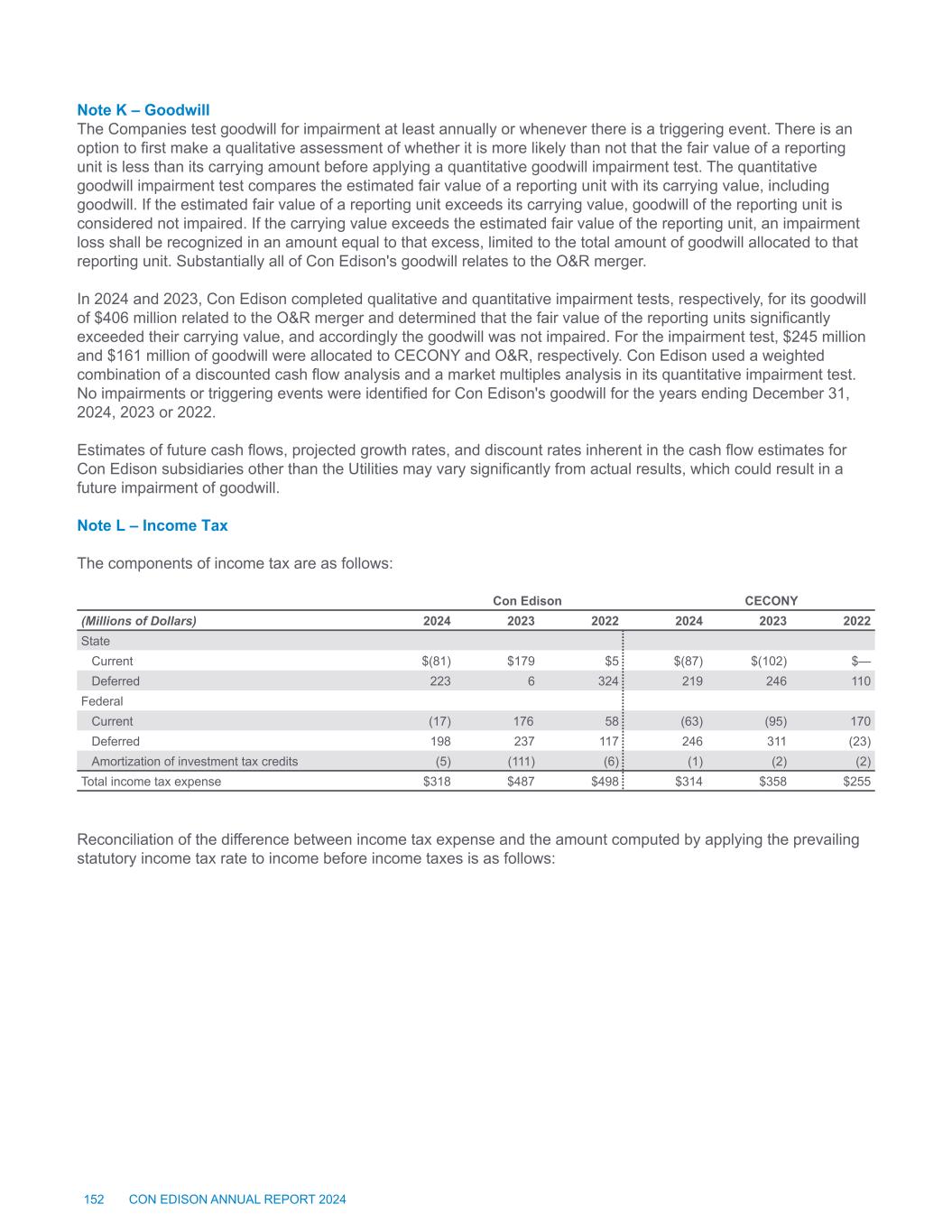 Note K – Goodwill The Companies test goodwill for impairment at least annually or whenever there is a triggering event. There is an option to first make a qualitative assessment of whether it is more likely than not that the fair value of a reporting unit is less than its carrying amount before applying a quantitative goodwill impairment test. The quantitative goodwill impairment test compares the estimated fair value of a reporting unit with its carrying value, including goodwill. If the estimated fair value of a reporting unit exceeds its carrying value, goodwill of the reporting unit is considered not impaired. If the carrying value exceeds the estimated fair value of the reporting unit, an impairment loss shall be recognized in an amount equal to that excess, limited to the total amount of goodwill allocated to that reporting unit. Substantially all of Con Edison's goodwill relates to the O&R merger. In 2024 and 2023, Con Edison completed qualitative and quantitative impairment tests, respectively, for its goodwill of $406 million related to the O&R merger and determined that the fair value of the reporting units significantly exceeded their carrying value, and accordingly the goodwill was not impaired. For the impairment test, $245 million and $161 million of goodwill were allocated to CECONY and O&R, respectively. Con Edison used a weighted combination of a discounted cash flow analysis and a market multiples analysis in its quantitative impairment test. No impairments or triggering events were identified for Con Edison's goodwill for the years ending December 31, 2024, 2023 or 2022. Estimates of future cash flows, projected growth rates, and discount rates inherent in the cash flow estimates for Con Edison subsidiaries other than the Utilities may vary significantly from actual results, which could result in a future impairment of goodwill. Note L – Income Tax The components of income tax are as follows: Con Edison CECONY (Millions of Dollars) 2024 2023 2022 2024 2023 2022 State Current $(81) $179 $5 $(87) $(102) $— Deferred 223 6 324 219 246 110 Federal Current (17) 176 58 (63) (95) 170 Deferred 198 237 117 246 311 (23) Amortization of investment tax credits (5) (111) (6) (1) (2) (2) Total income tax expense $318 $487 $498 $314 $358 $255 Reconciliation of the difference between income tax expense and the amount computed by applying the prevailing statutory income tax rate to income before income taxes is as follows: 152 CON EDISON ANNUAL REPORT 2024